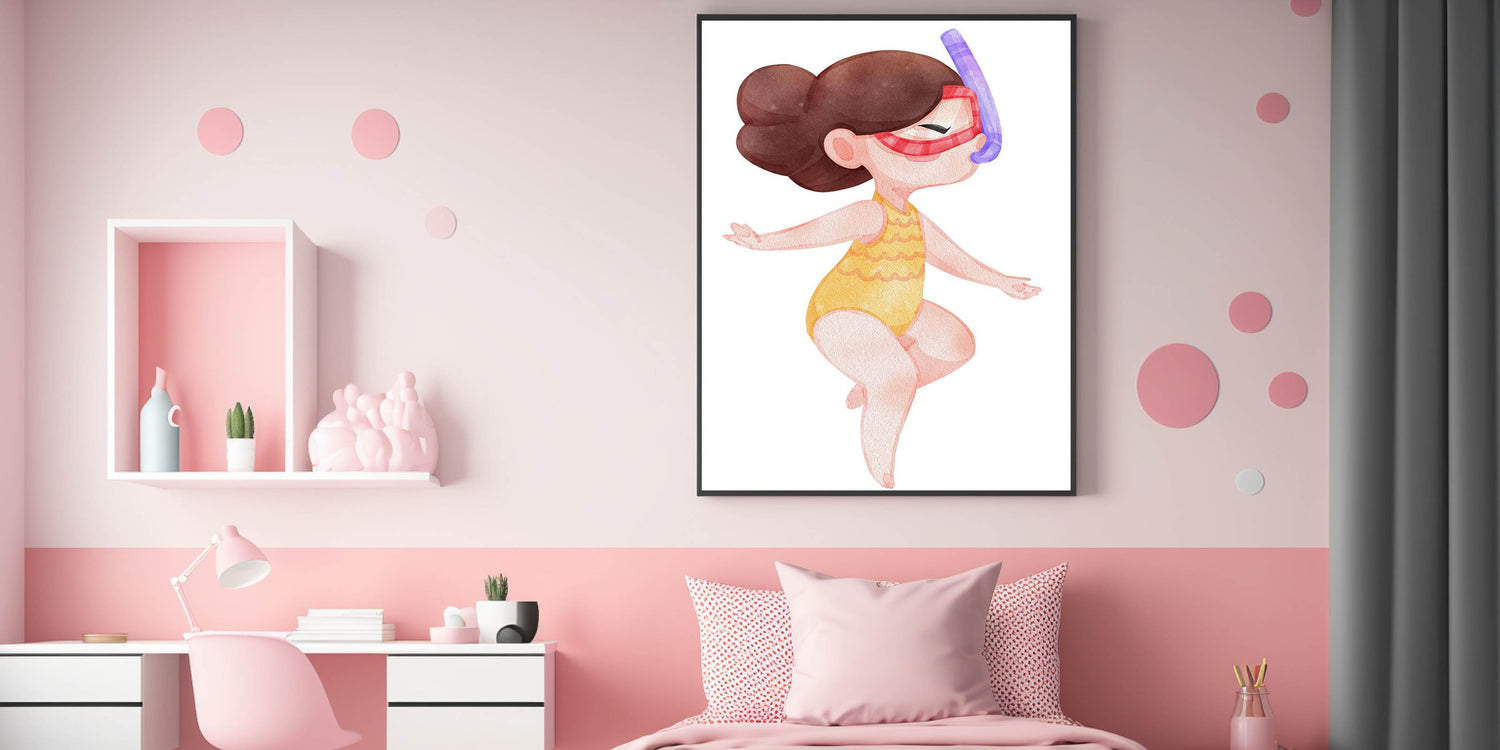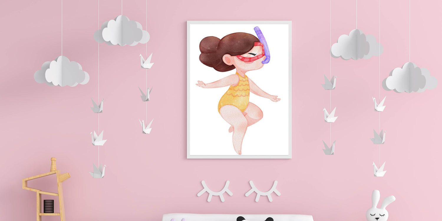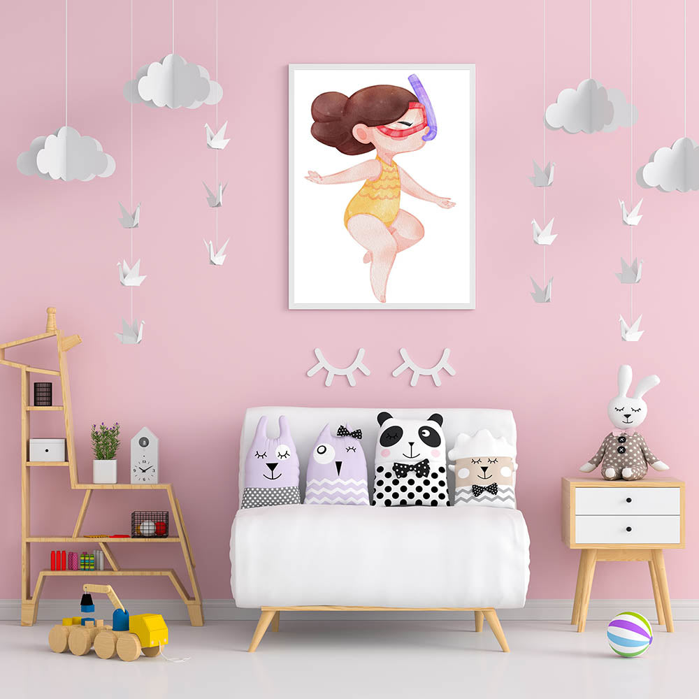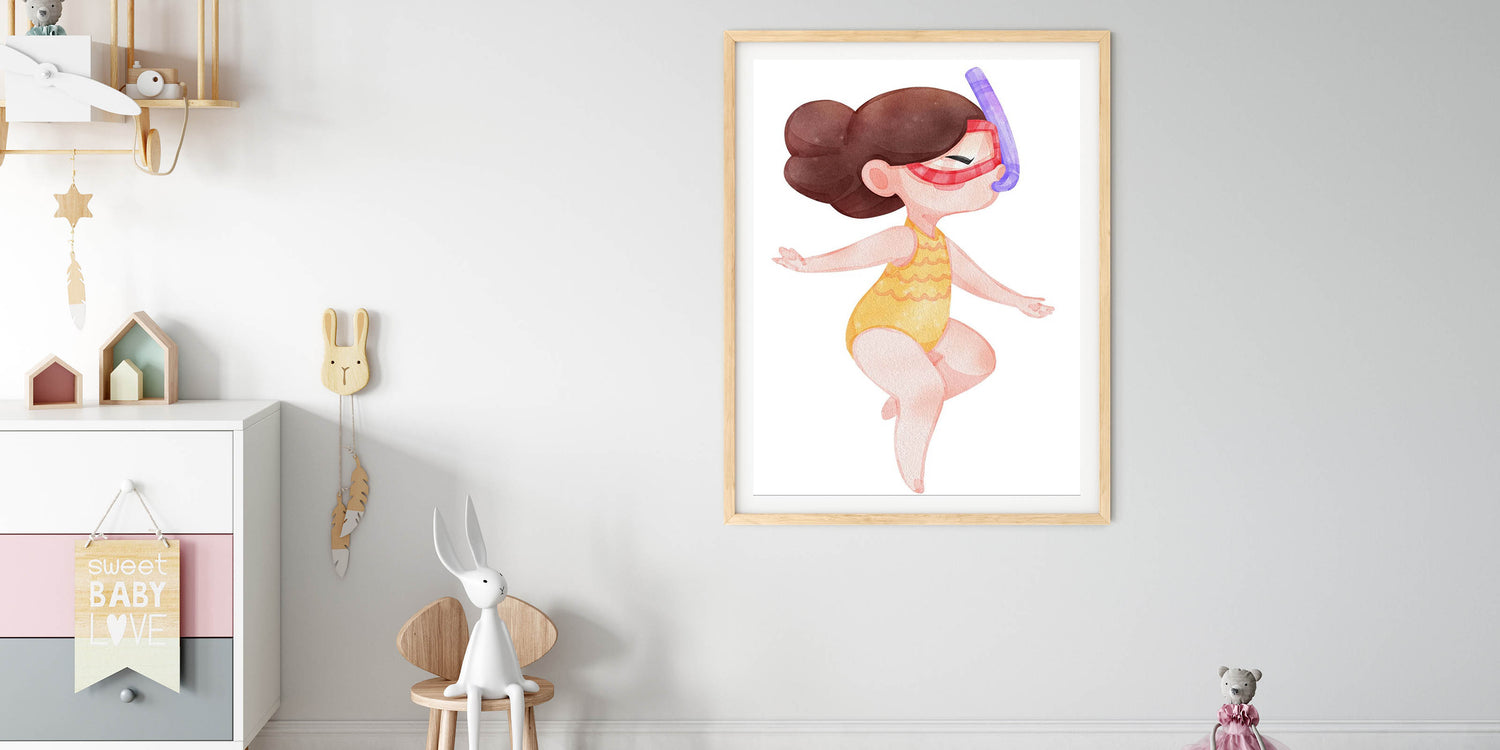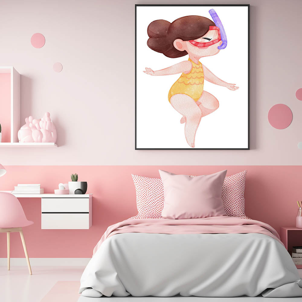 Bring a splash of fun and adventure to your child’s space with this underwater swimmer wall art. Featuring a young girl floating gracefully underwater with a snorkel mask and a bright yellow swimsuit, this playful illustration captures the joy of swimming and exploration. The soft pastel tones and watercolor texture make it a calming yet exciting piece for nurseries, playrooms, or girls' bedrooms.