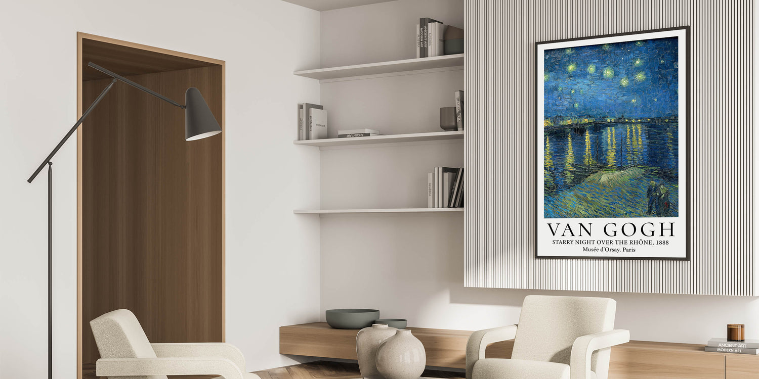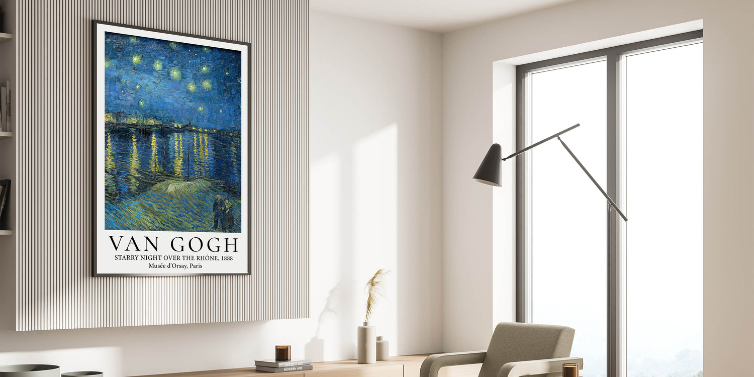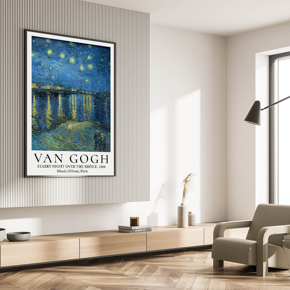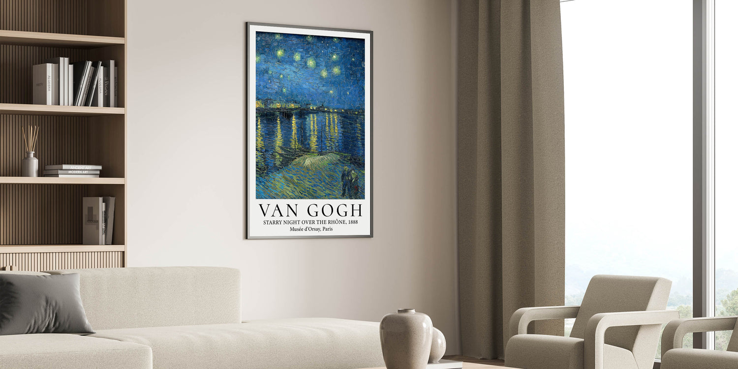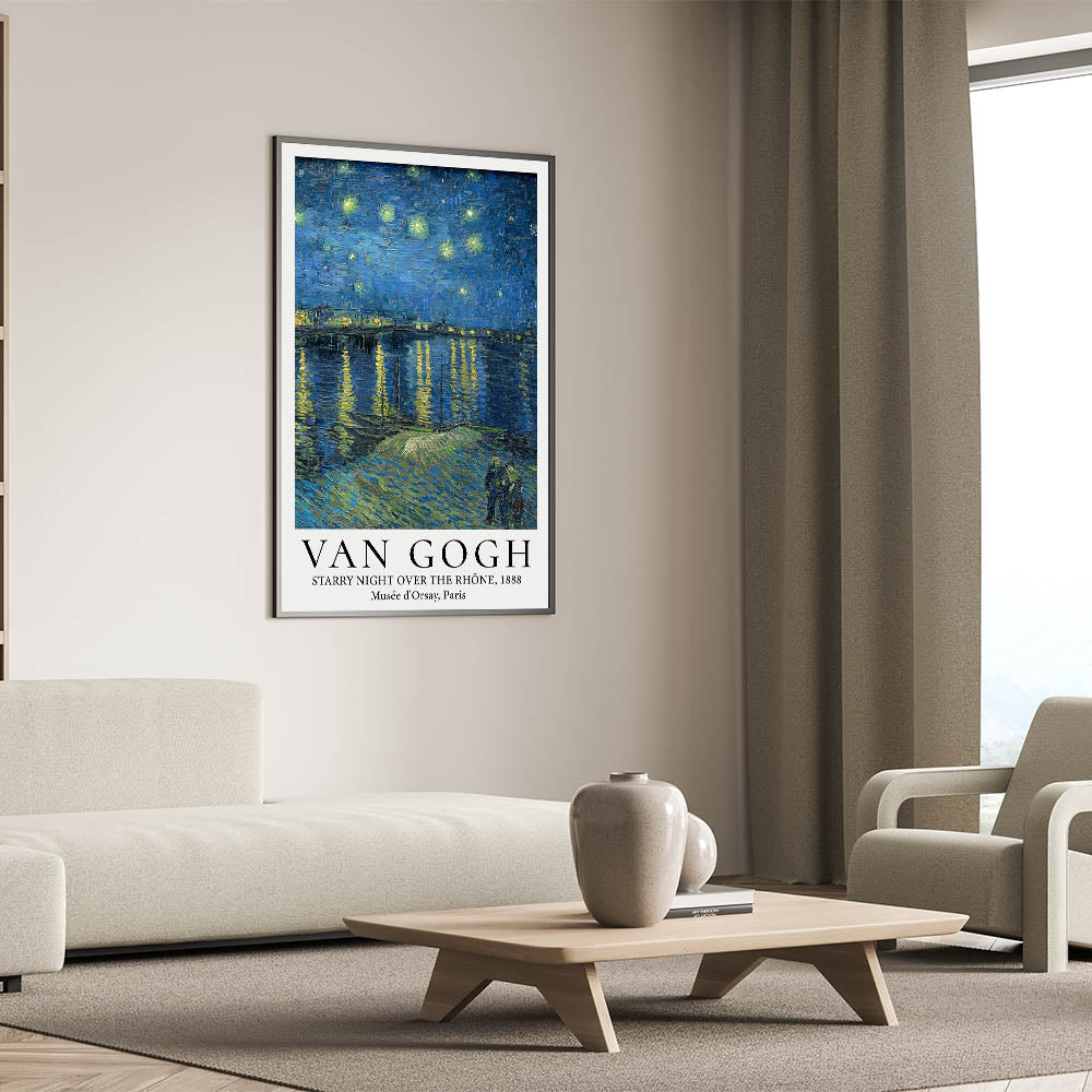 Transform your home with the serene beauty of Van Gogh art prints featuring Starry Night Over the Rhône. This mesmerizing poster showcases the brilliance of Van Gogh's night sky, where shimmering stars reflect on the calm waters of the Rhône River. The couple strolling along the riverbank adds a touch of intimacy to this enchanting masterpiece, making it a timeless addition to any art lover's collection.