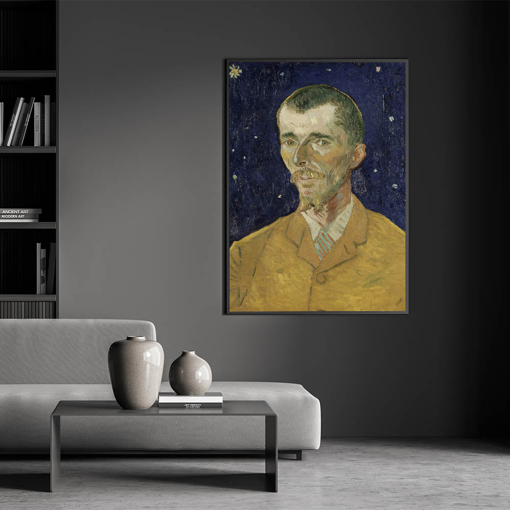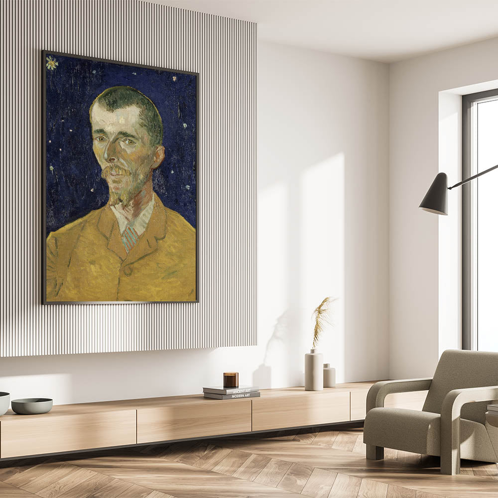 Bring the elegance and intimacy of Vincent van Gogh's "Portrait of Eugène Boch" into your home. This evocative masterpiece captures the refined features of Eugène Boch, a fellow artist and friend, set against a starry, deep blue background. Van Gogh's textured brushwork and striking color palette create a haunting yet captivating atmosphere, making it a standout addition to any art collection.
