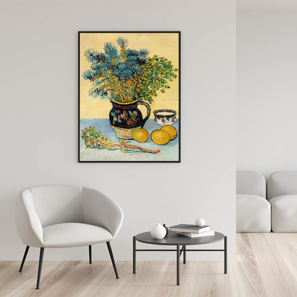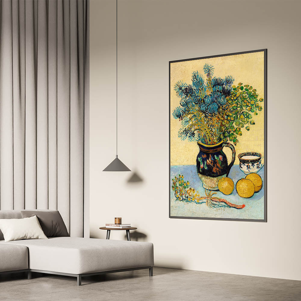 Brighten your space with this captivating Vincent van Gogh wall art, featuring a vibrant still life arrangement of flowers, fruits, and an intricately designed jug. This masterpiece embodies Van Gogh's expressive brushstrokes and bold use of color, making it an exquisite addition to any home. The harmonious balance of blues, greens, yellows, and earthy tones brings warmth and vitality to your decor.