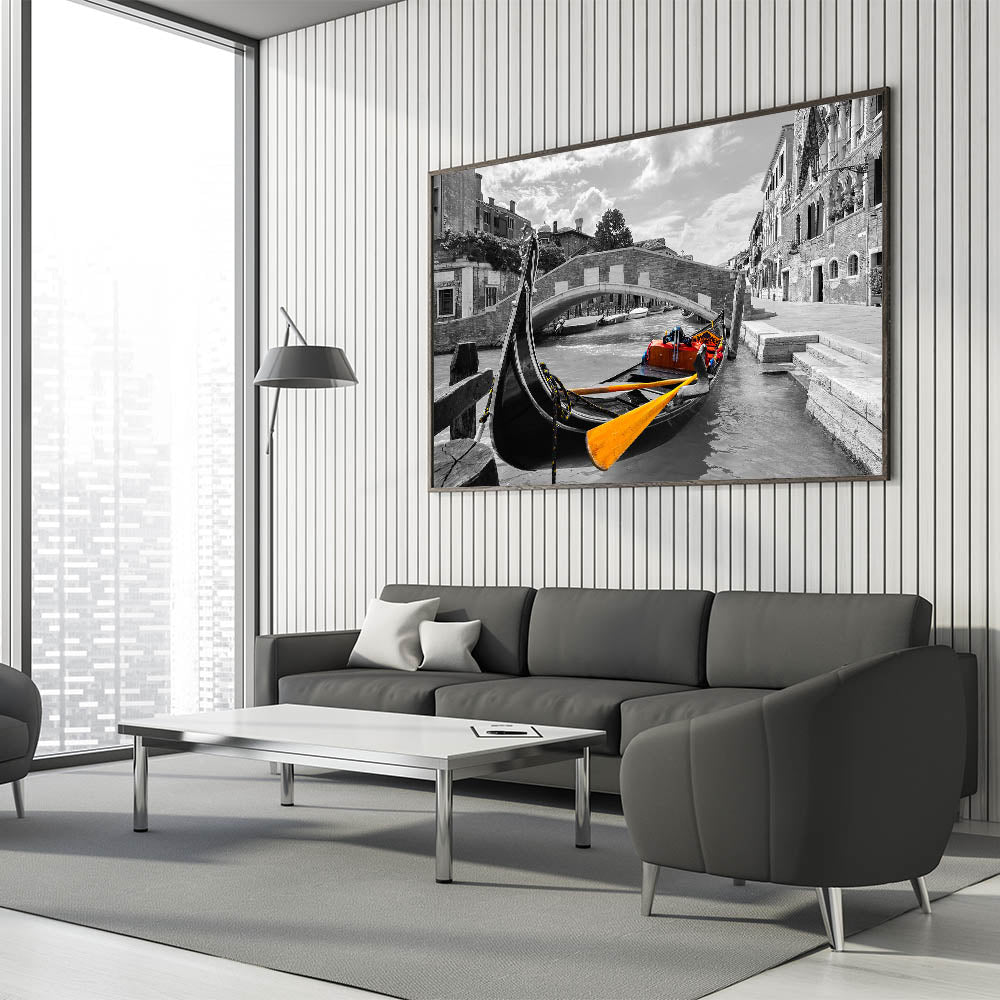 This striking Venice framed art captures a gondola at rest beside a historic stone bridge. With a unique pop of color against a black and white backdrop, this piece beautifully combines modern photography techniques with classic Venetian scenery, offering a perfect balance of history and artistry.