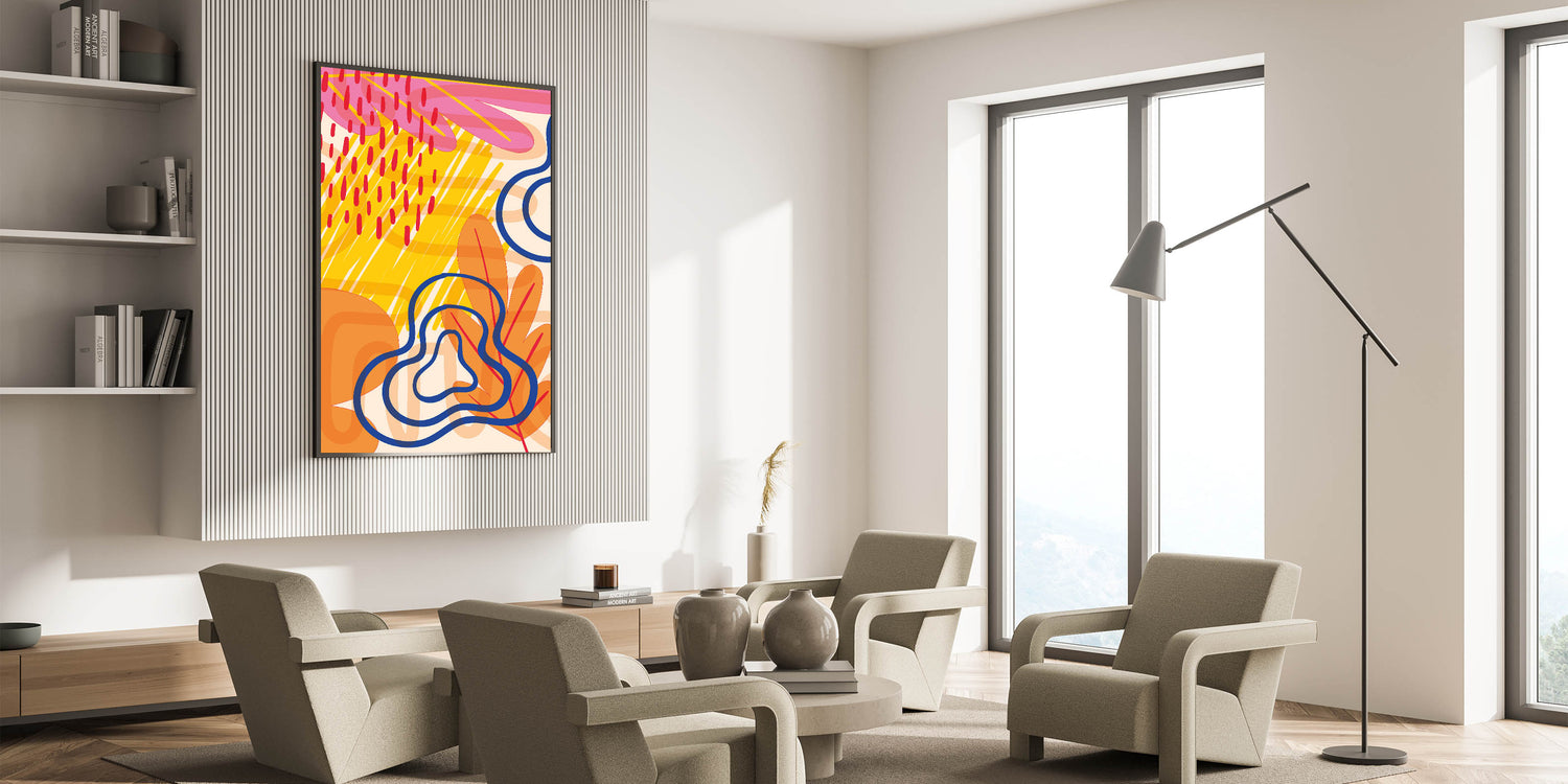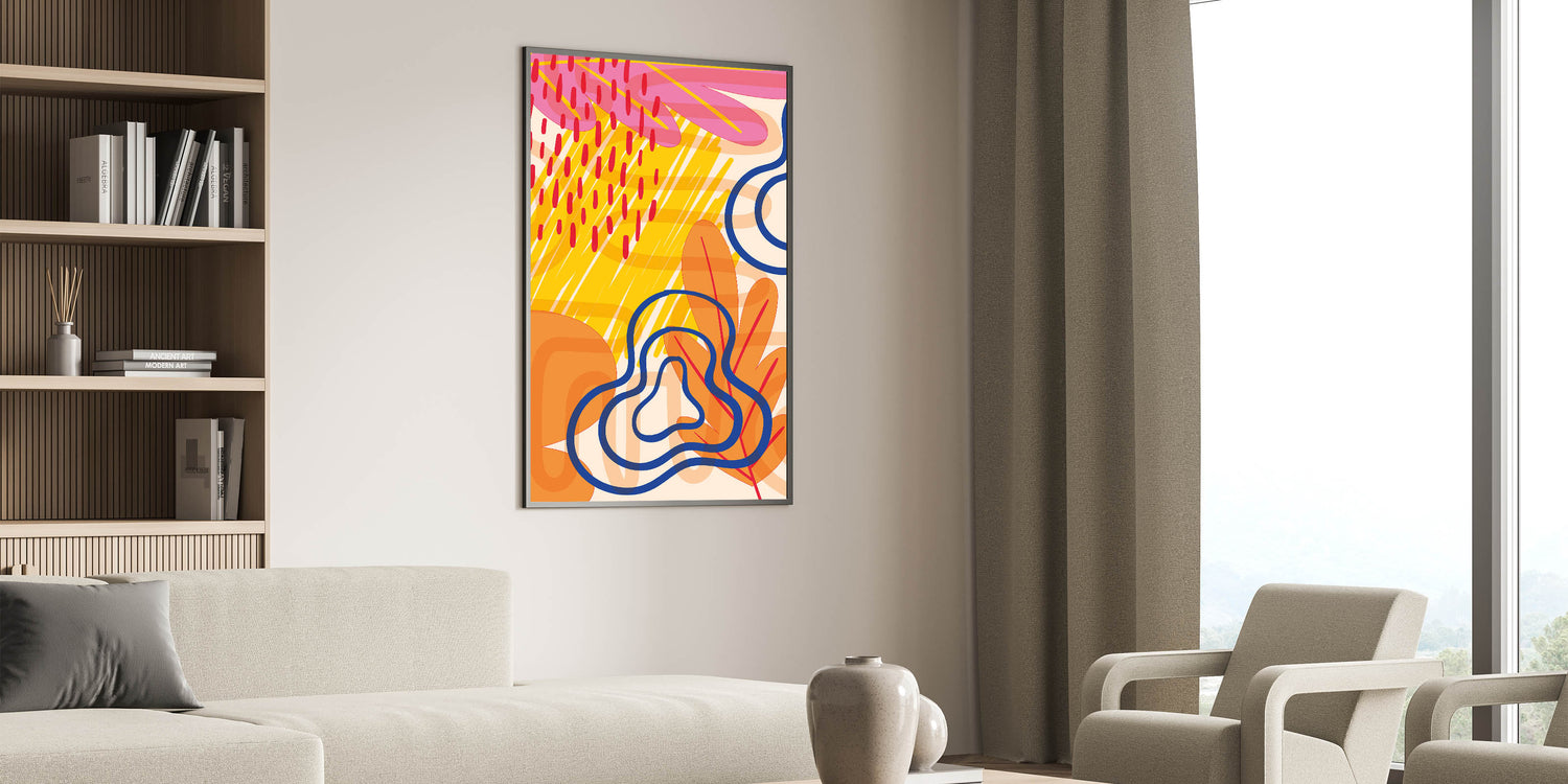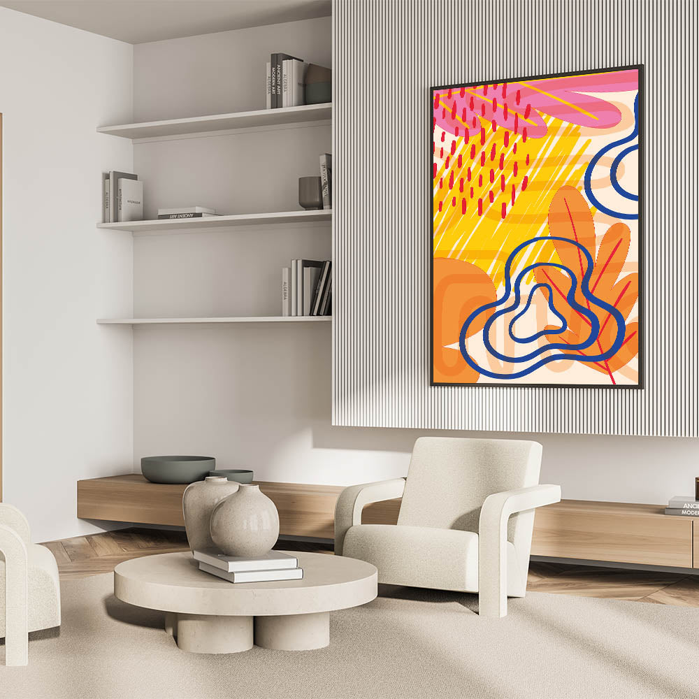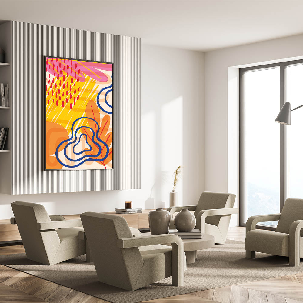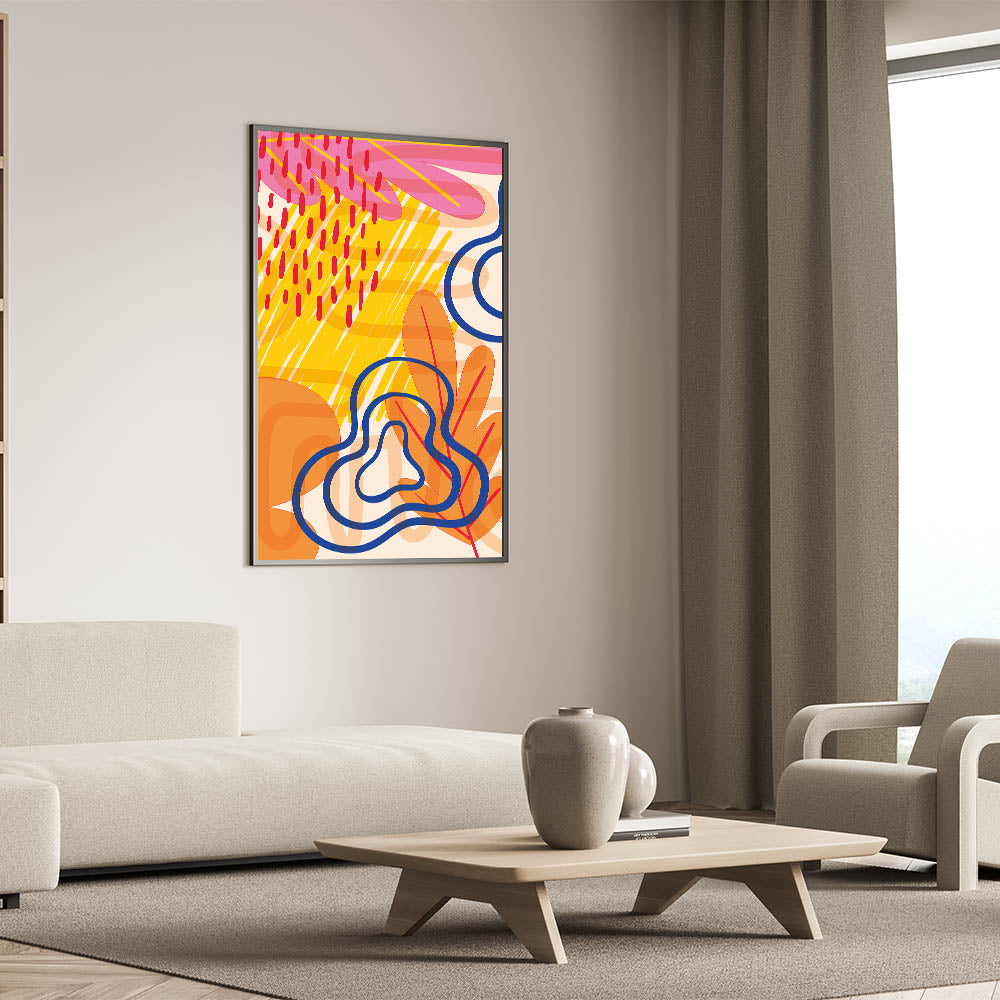 Inject a burst of color and energy into your space with this vibrant abstract Bohemian wall art. The eclectic mix of bright yellow, bold red, deep blue, and warm orange creates a dynamic and lively design that is perfect for adding personality to any room. The playful and abstract shapes combined with rich, contrasting colors make this piece a standout addition to your decor.