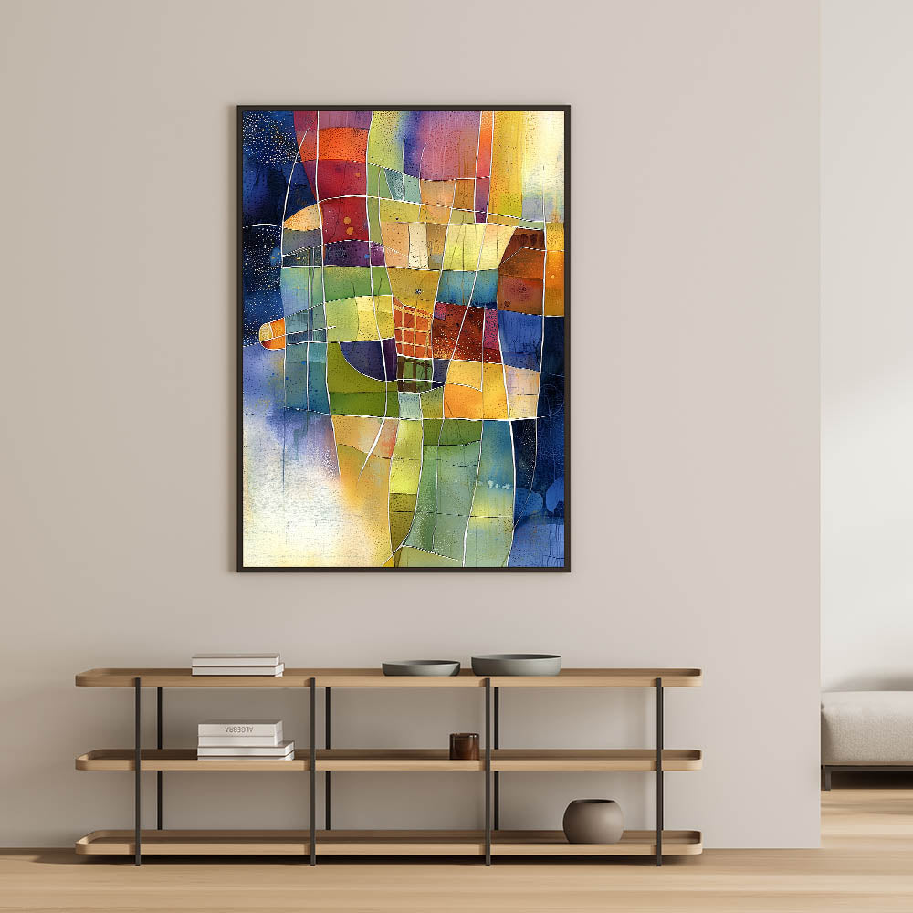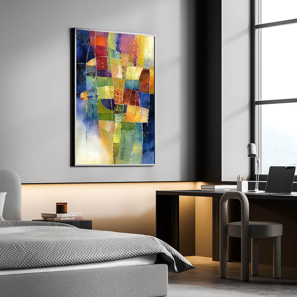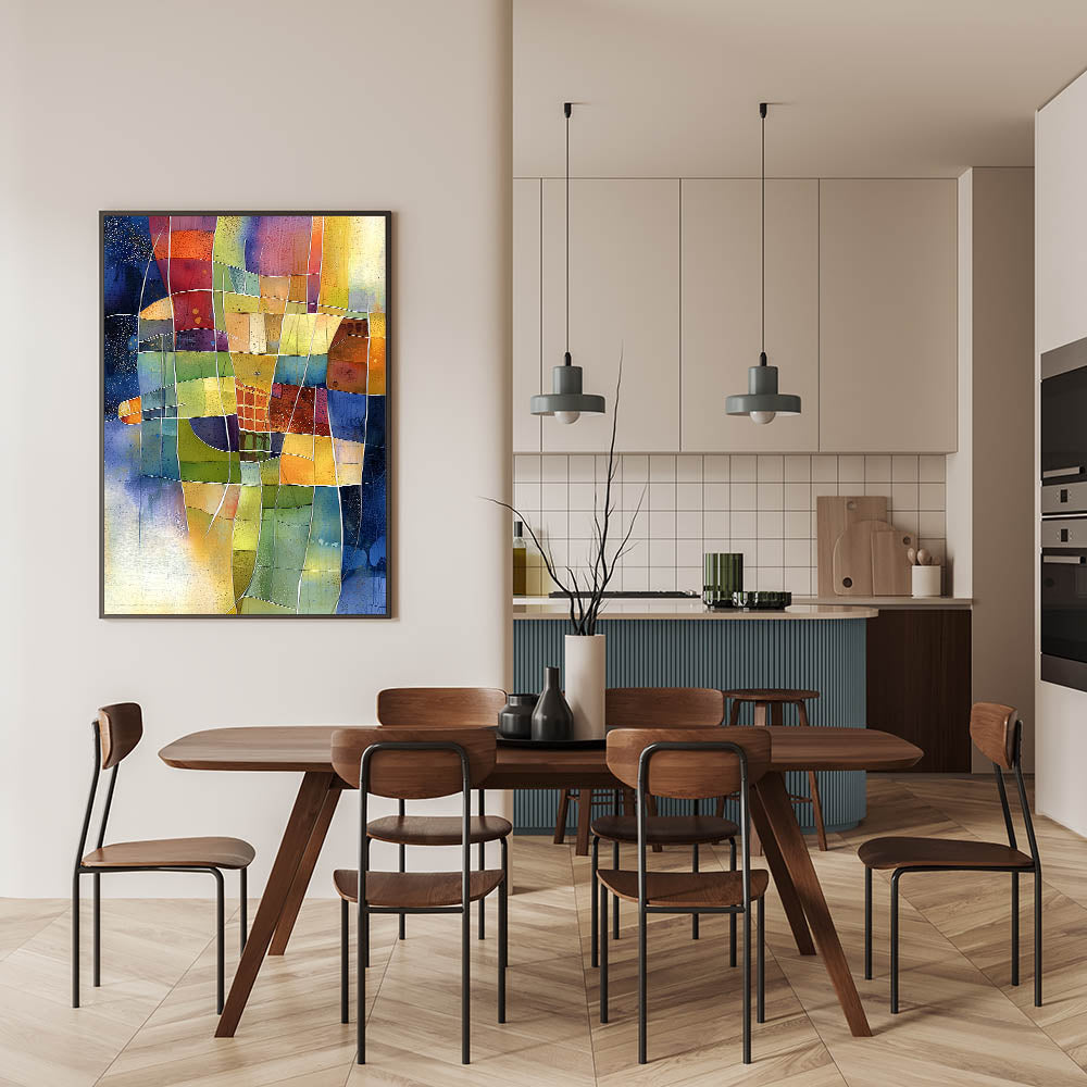 Elevate your home décor with this vibrant abstract living room wall art, a stunning fusion of color and geometry. This modern wall art features a dynamic mosaic of warm yellows, deep blues, rich reds, and earthy greens, making it a striking centerpiece for any modern living room decor.