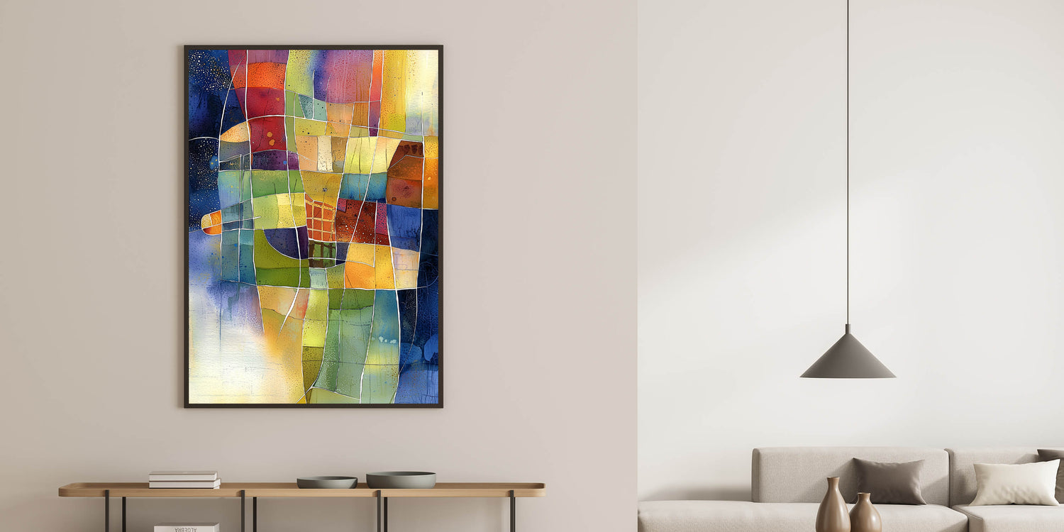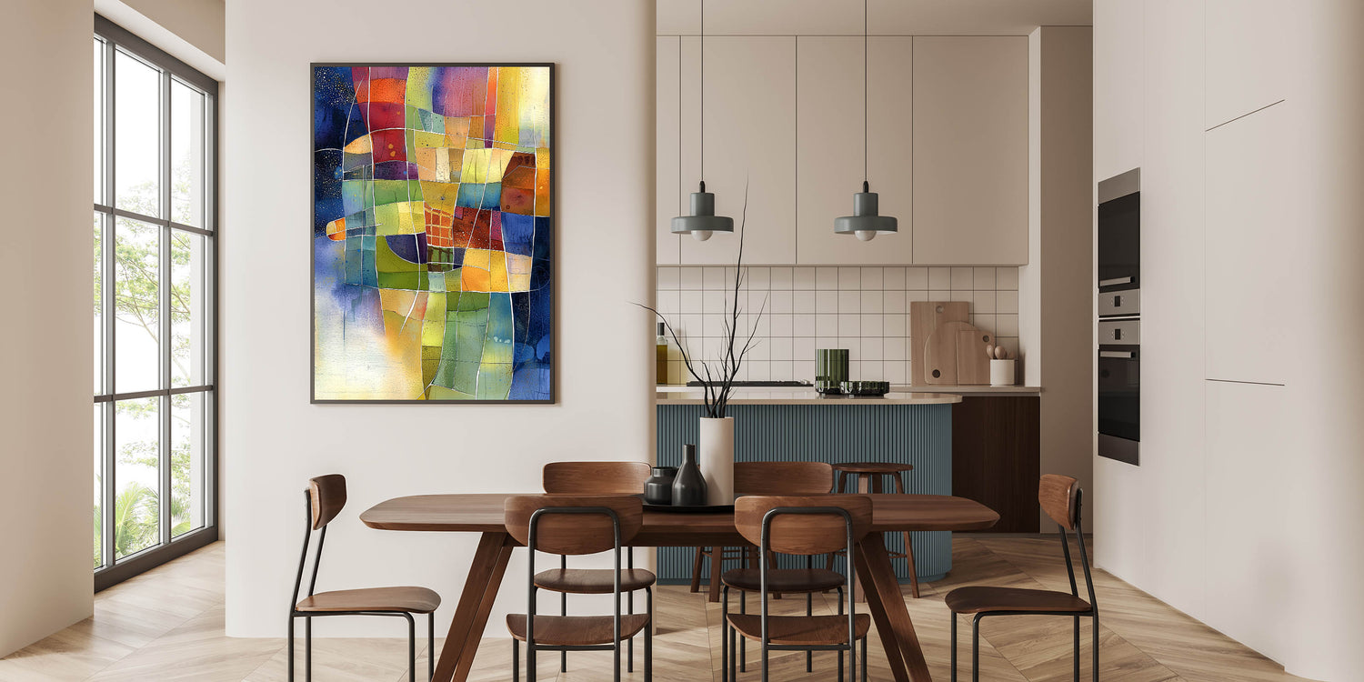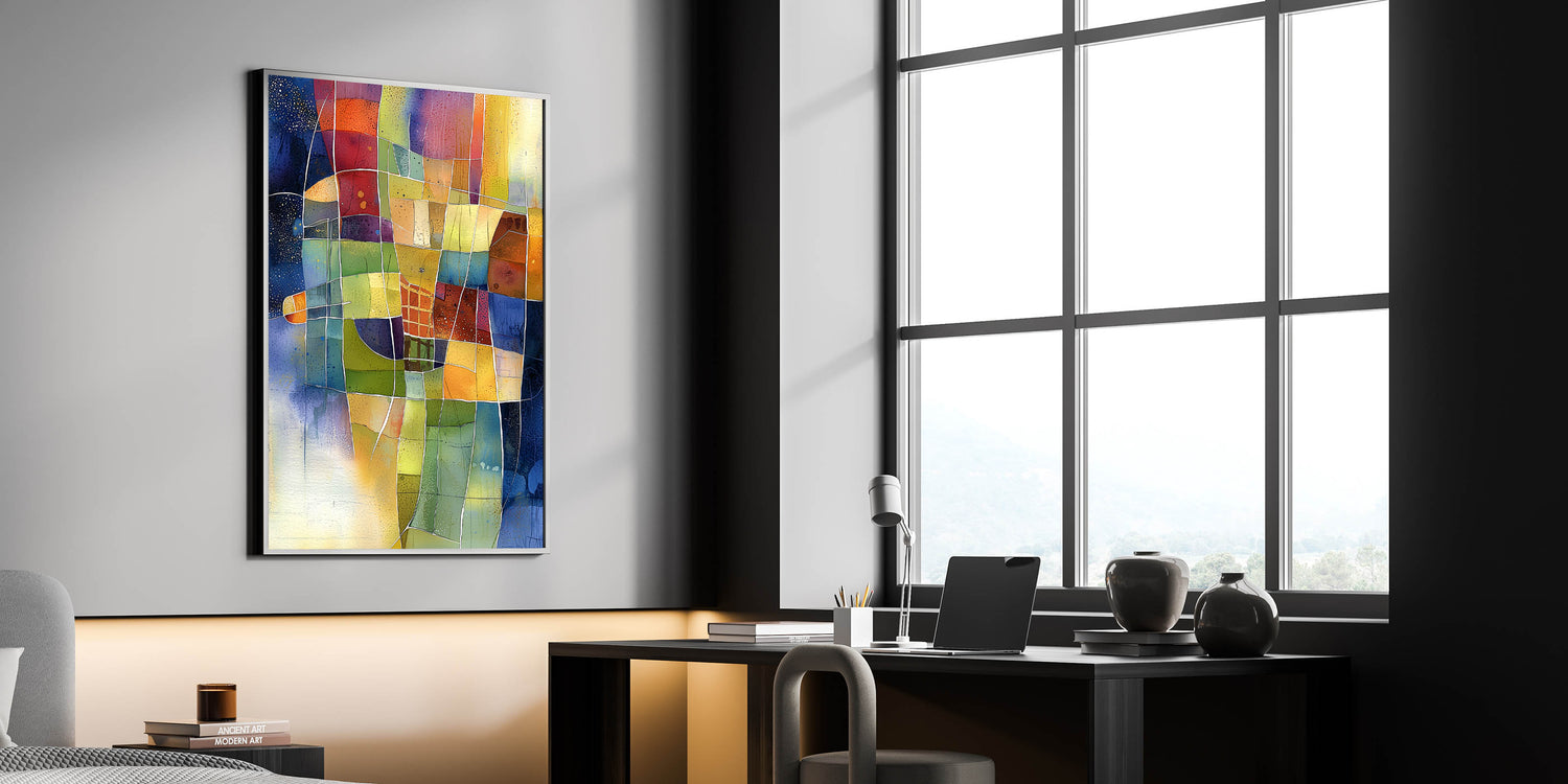 Elevate your home décor with this vibrant abstract living room wall art, a stunning fusion of color and geometry. This modern wall art features a dynamic mosaic of warm yellows, deep blues, rich reds, and earthy greens, making it a striking centerpiece for any modern living room decor.
