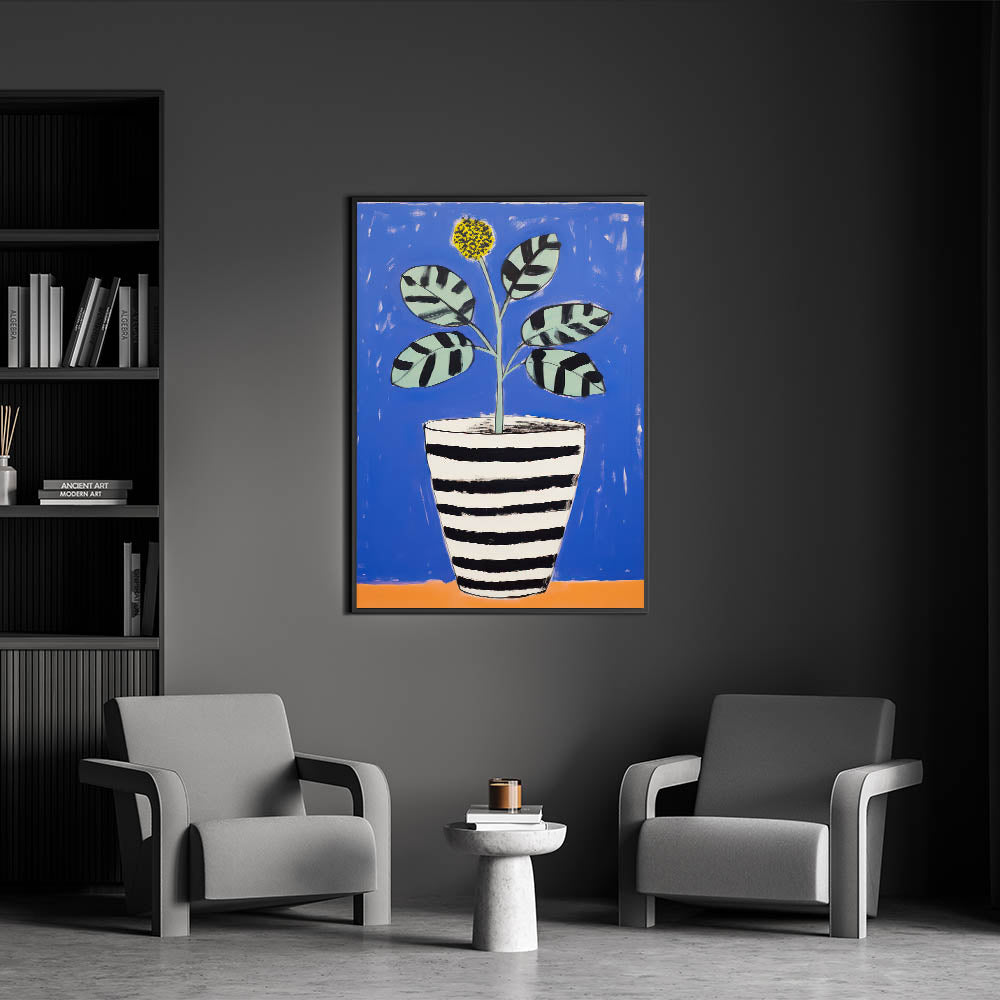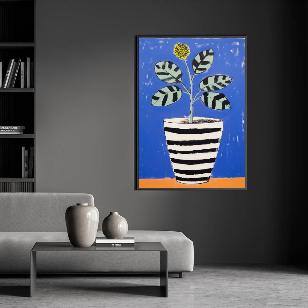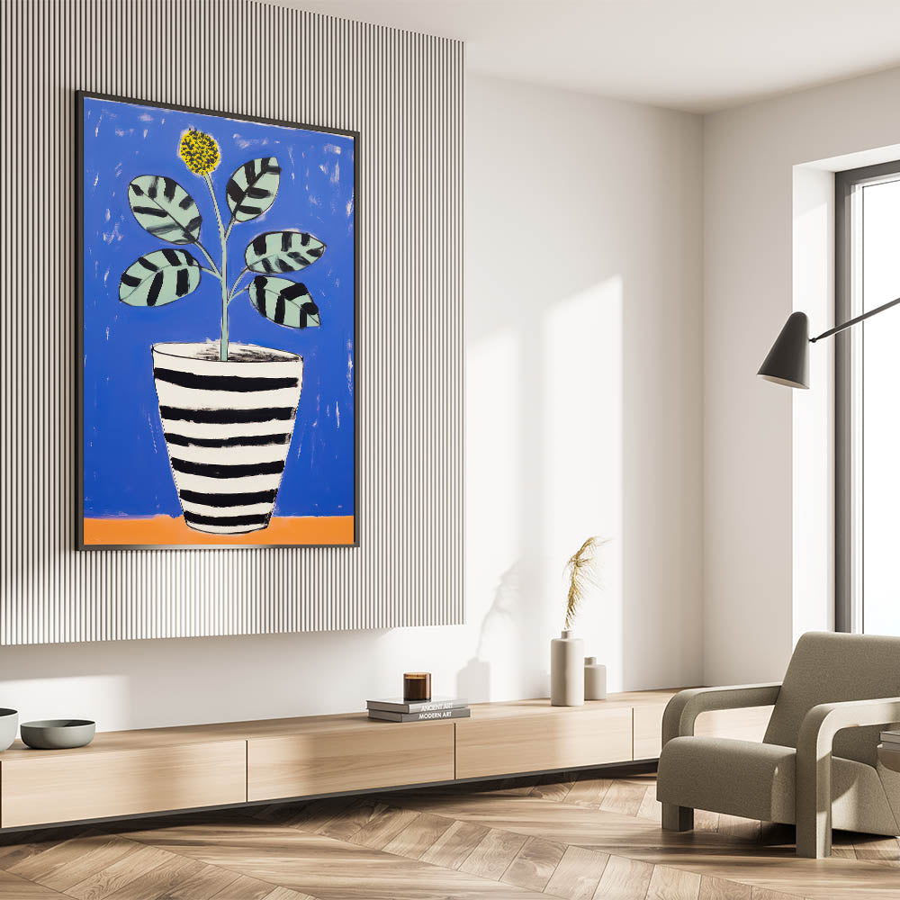 Brighten up your space with this Vibrant Electric Botanical Art, featuring a playful potted plant against a bold blue background. The artwork combines modern, abstract shapes with a vibrant palette of blue, black, and yellow, creating a lively and engaging design. The black and white striped pot contrasts beautifully with the colorful leaves and flower, giving the piece a contemporary, stylish look. This art is perfect for modern, eclectic, or playful interiors seeking a fresh and artistic touch.