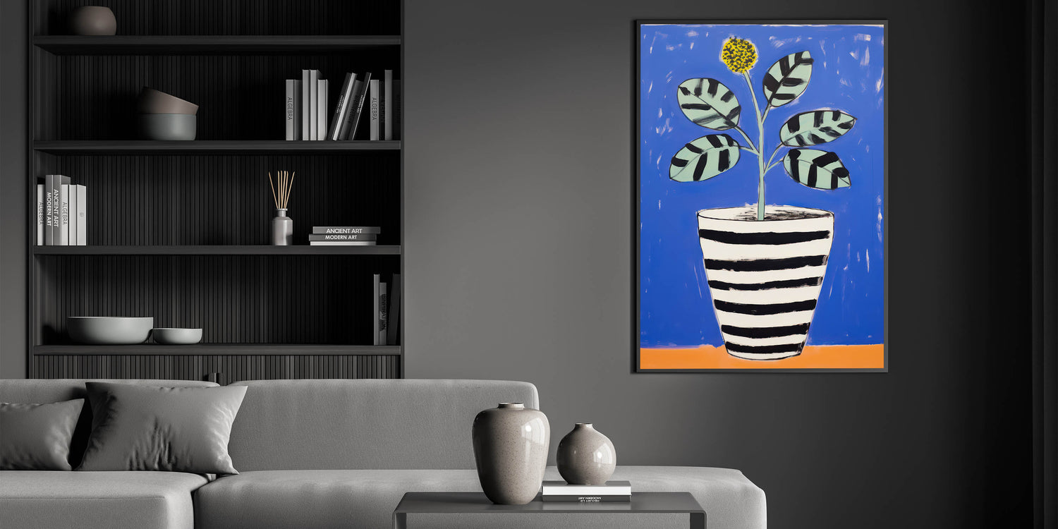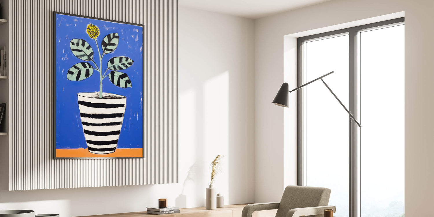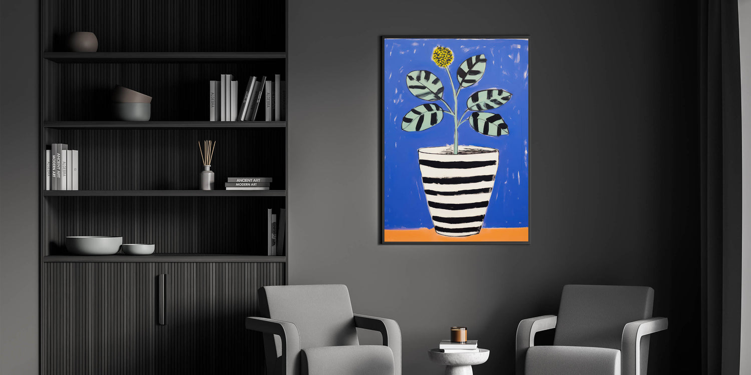 Brighten up your space with this Vibrant Electric Botanical Art, featuring a playful potted plant against a bold blue background. The artwork combines modern, abstract shapes with a vibrant palette of blue, black, and yellow, creating a lively and engaging design. The black and white striped pot contrasts beautifully with the colorful leaves and flower, giving the piece a contemporary, stylish look. This art is perfect for modern, eclectic, or playful interiors seeking a fresh and artistic touch.