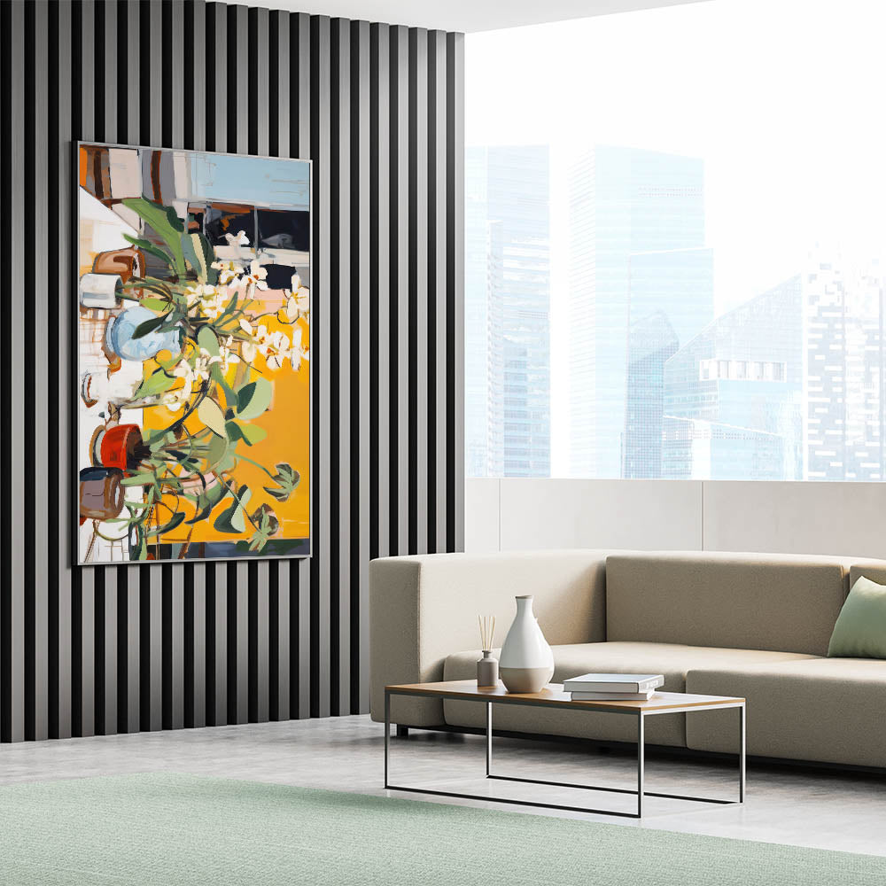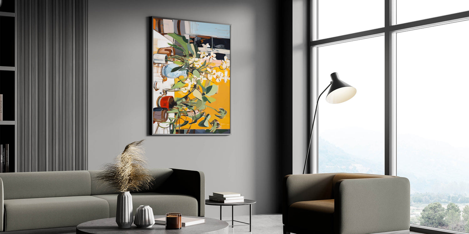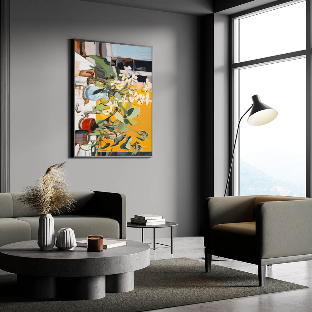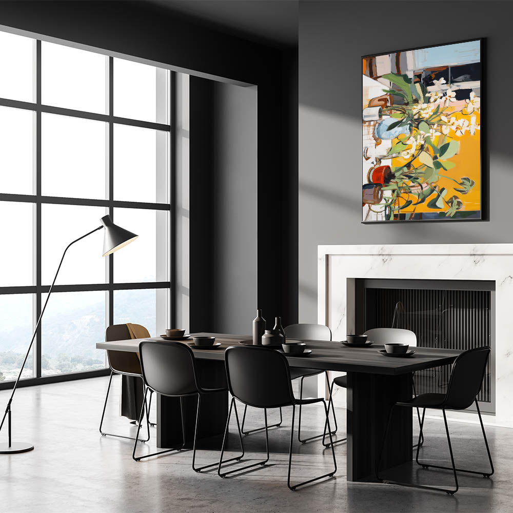 This vibrant electric wall art piece brings energy and life into any space with its dynamic composition of abstract floral and leaf patterns. Set against a bold yellow background, the artwork captures the essence of a sunlit garden, blending warm tones of yellow, green, and brown with the freshness of white blooms. The energetic arrangement and playful brushstrokes create a lively visual experience, making this piece ideal for spaces seeking to radiate warmth and positivity. Perfect for living rooms, dining areas, or offices, this artwork infuses any setting with a modern and contemporary aesthetic, while still connecting to nature’s vibrancy.