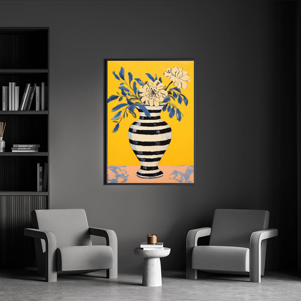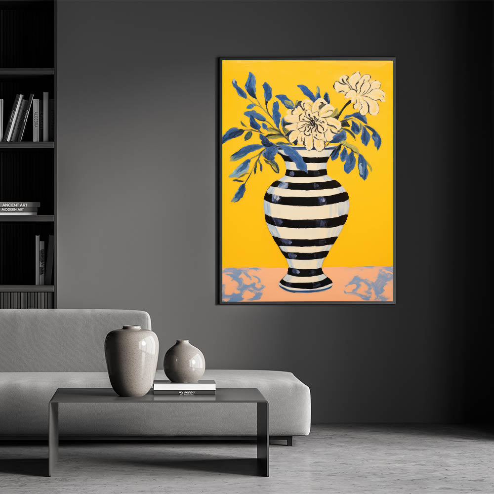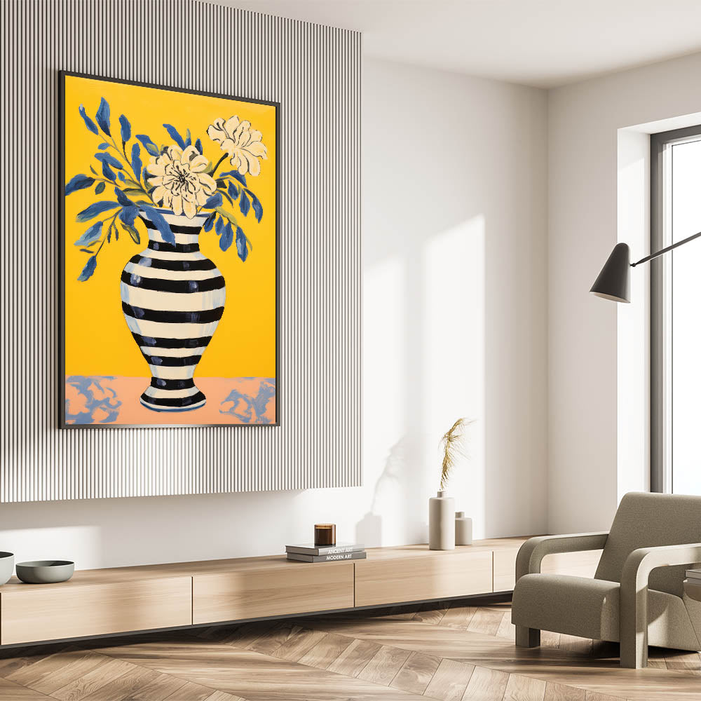 This vibrant electric floral art features a striped vase filled with expressive flowers against a bright yellow background. The striking combination of navy blue leaves and creamy blossoms creates a lively and dynamic visual, making it a bold statement piece for contemporary interiors. The playful use of color and abstract brushstrokes adds an element of modernity, perfect for art enthusiasts who appreciate energetic and eye-catching designs.