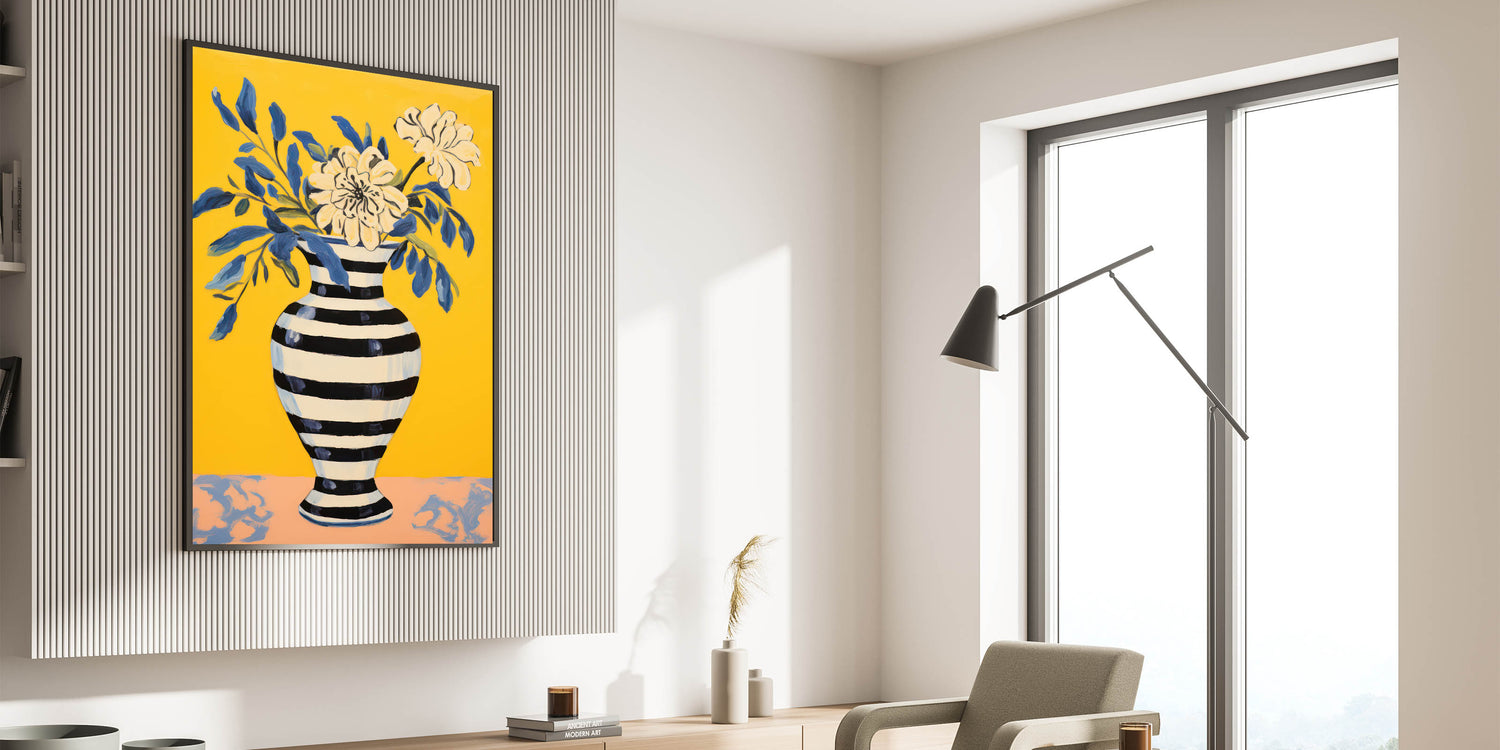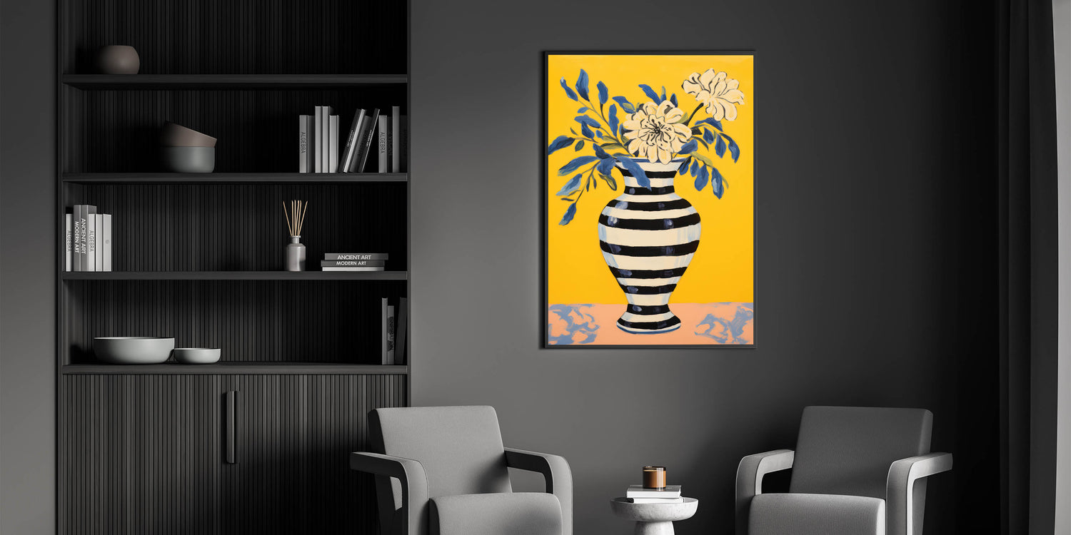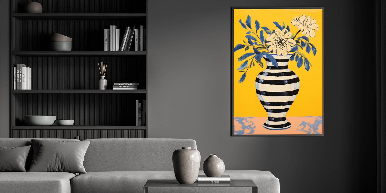 This vibrant electric floral art features a striped vase filled with expressive flowers against a bright yellow background. The striking combination of navy blue leaves and creamy blossoms creates a lively and dynamic visual, making it a bold statement piece for contemporary interiors. The playful use of color and abstract brushstrokes adds an element of modernity, perfect for art enthusiasts who appreciate energetic and eye-catching designs.