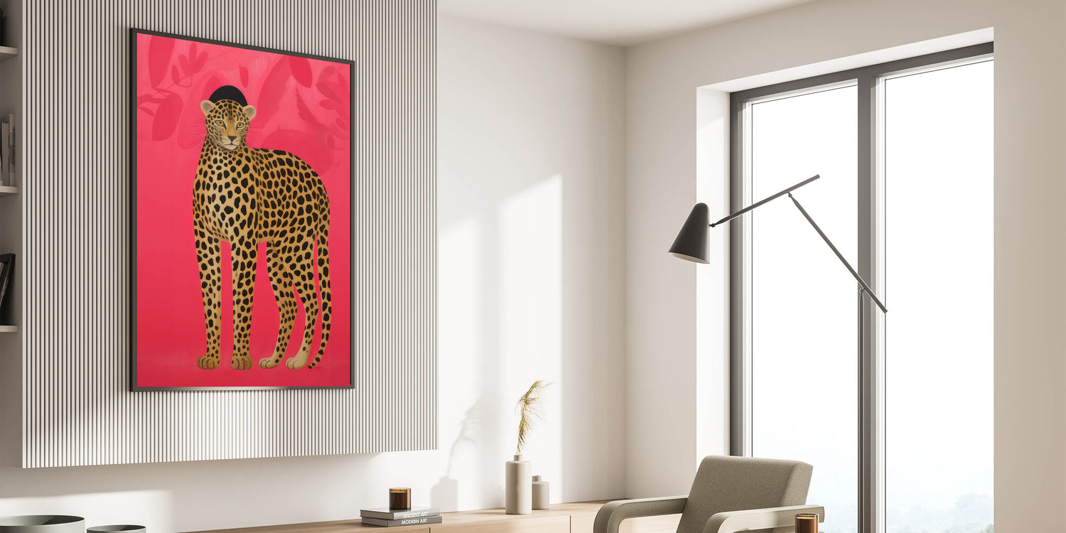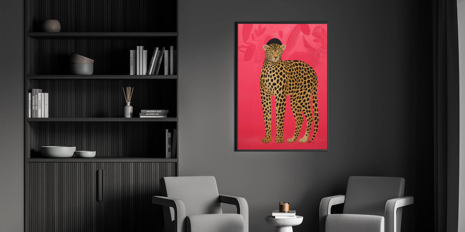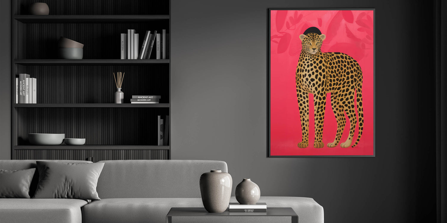 Bring the wild into your space with this vibrant electric wall art, featuring a majestic leopard set against a bold pink background. The artwork’s striking contrast between the leopard’s golden fur and the vivid pink backdrop creates an eye-catching piece that demands attention. This detailed depiction of a leopard in its regal stance adds a dynamic, energetic vibe, perfect for modern and eclectic interiors.