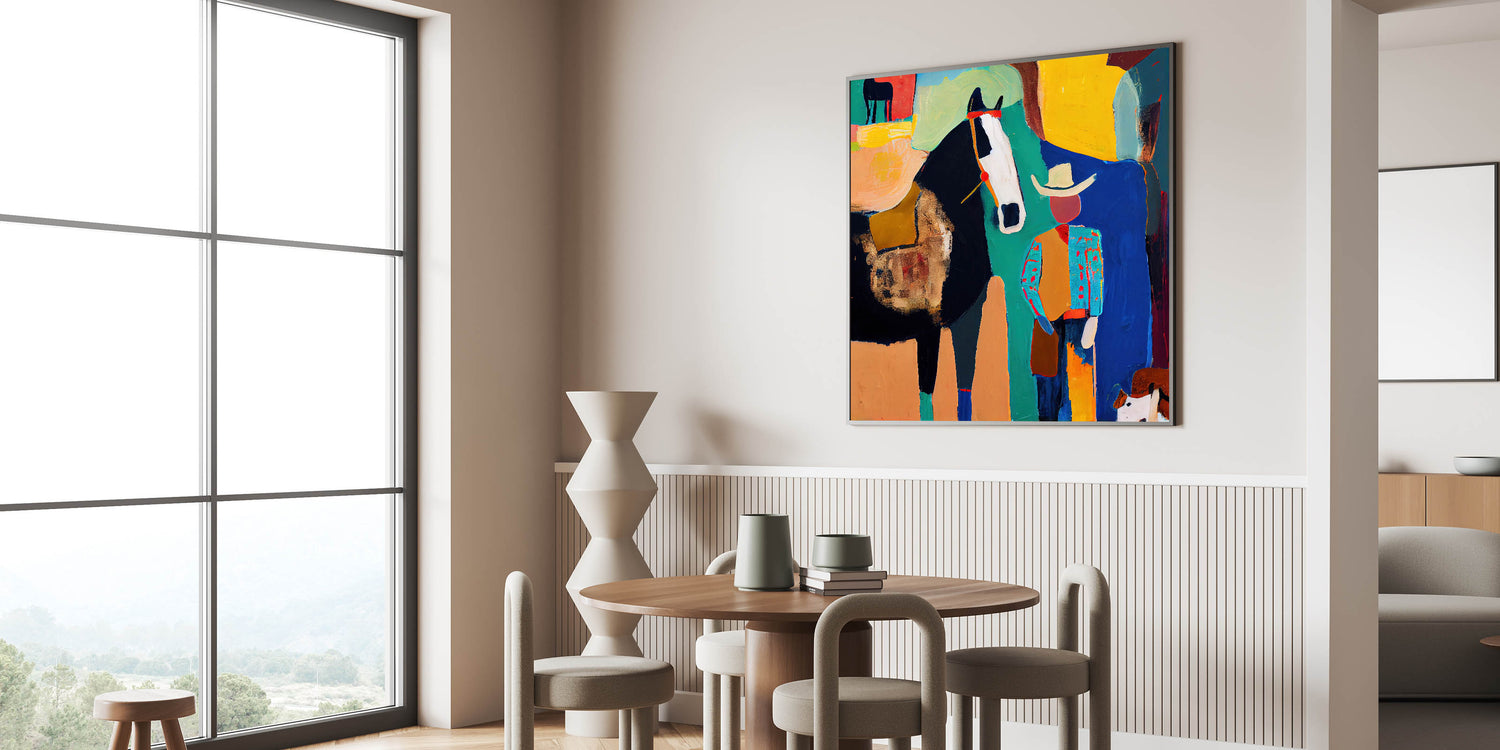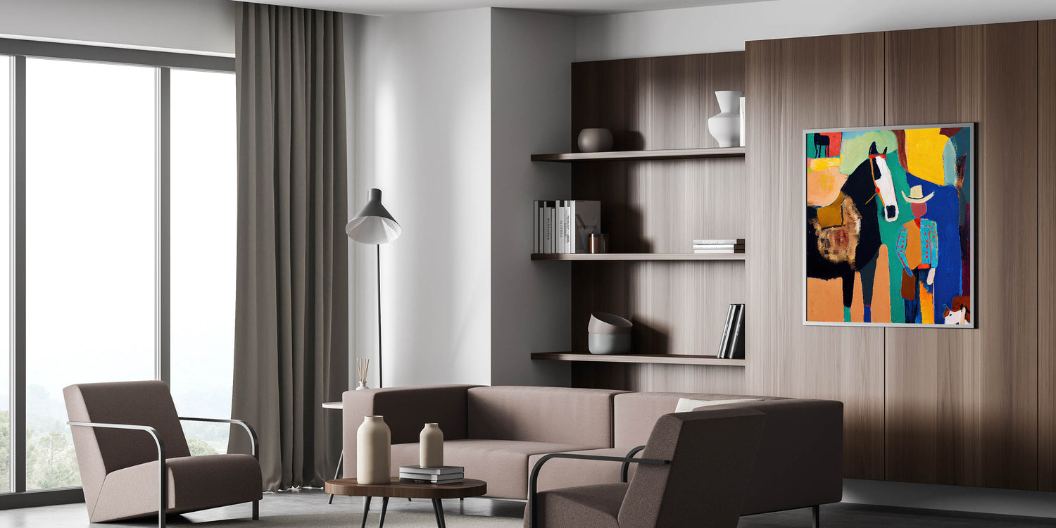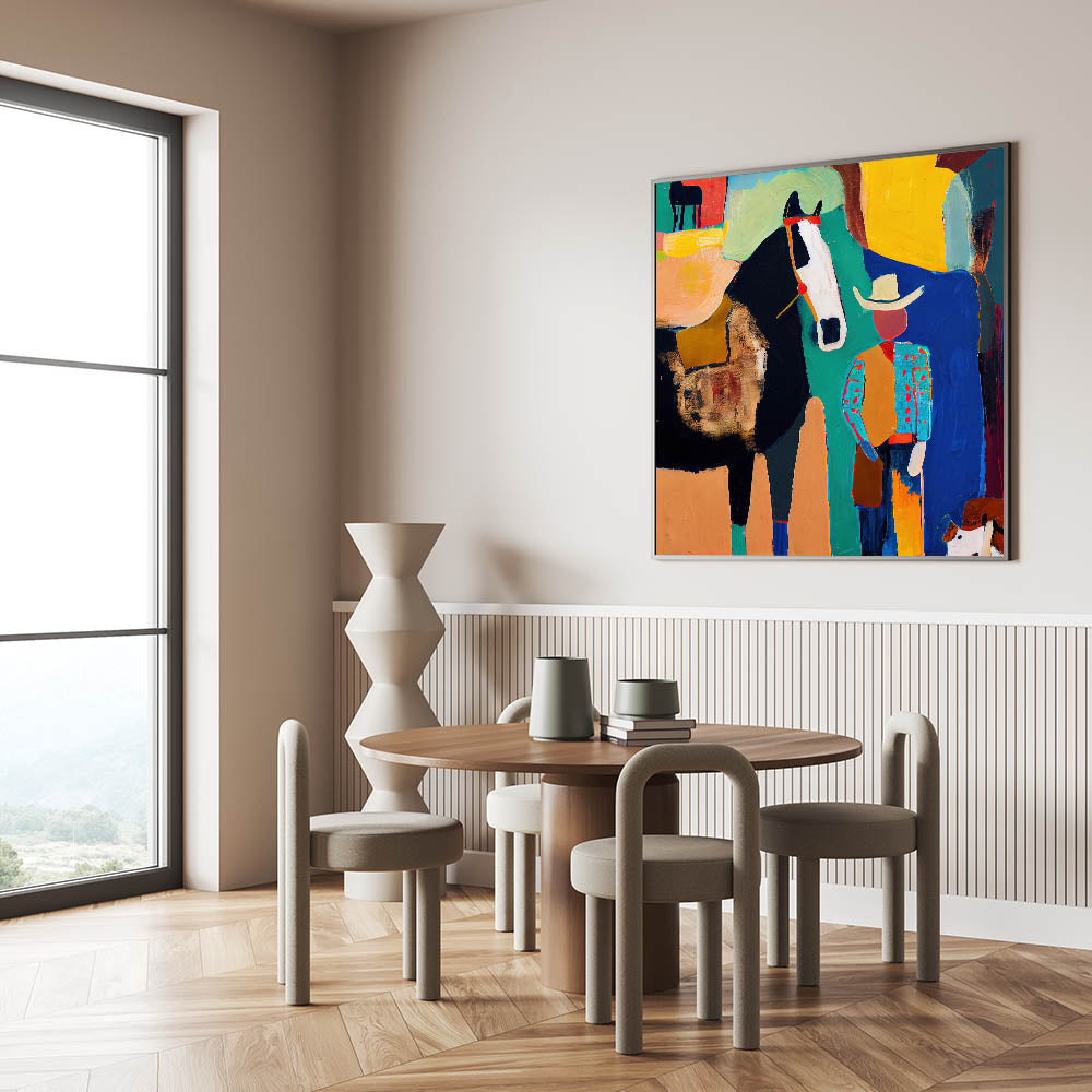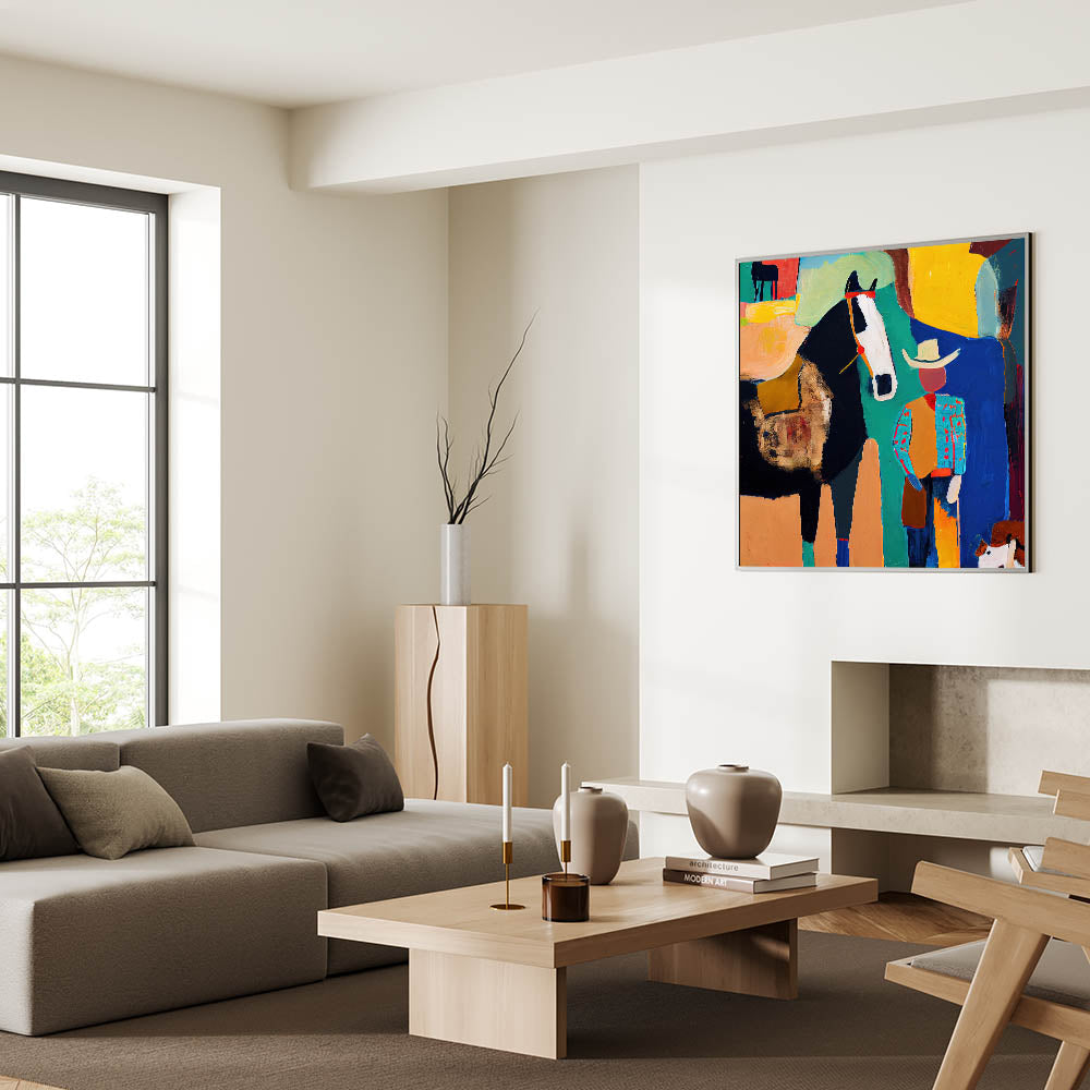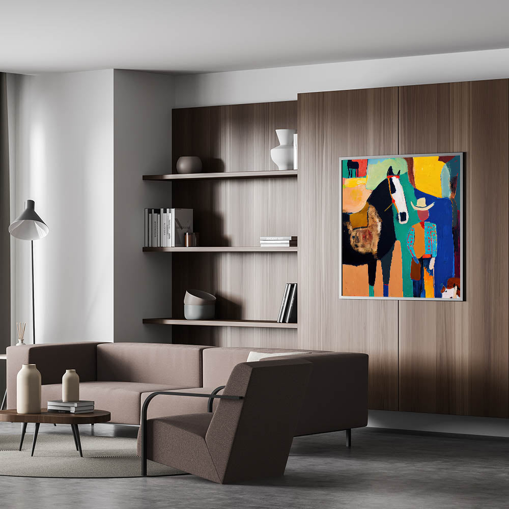 Bring bold colors and rustic charm into your home with this modern wall art, featuring a striking cowboy and horse composition in black, turquoise, yellow, orange, and blue. This living room wall art blends abstract expression with Western elements, making it a statement piece for lovers of abstract art pieces with character. Whether displayed as canvas wall art or framed wall art, this artwork enhances modern living room decor with its vivid energy.