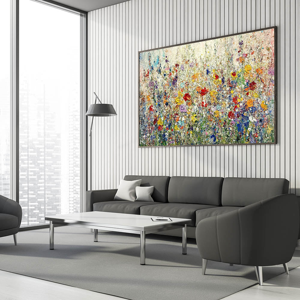 Brighten your space with the breathtaking beauty of this vibrant abstract wildflower wall art. Featuring lush reds, yellows, purples, and blues blooming across a soft pastel background, this artwork captures the joy and energy of a sunlit meadow. The rich textures and expressive brushstrokes create depth and movement, making it a stunning focal point for modern living room decor.