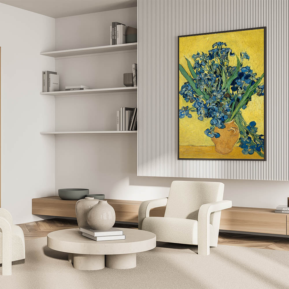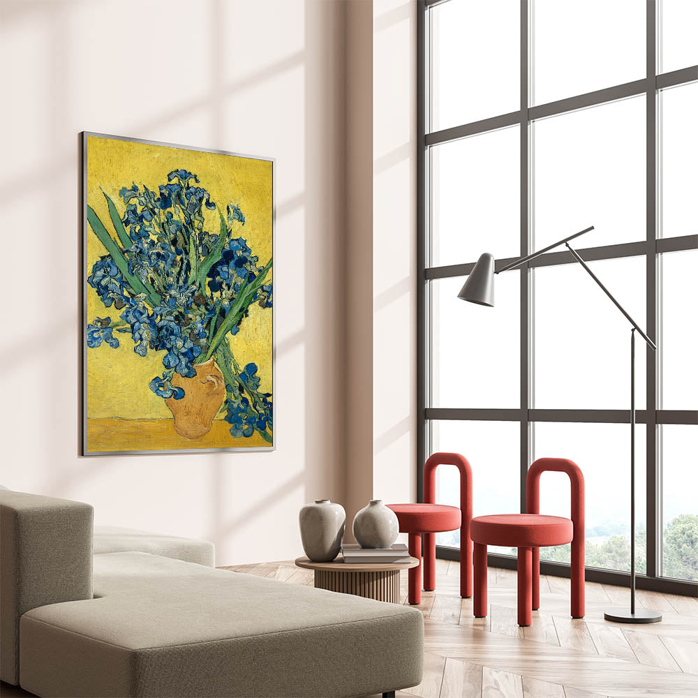 Brighten your space with Vincent van Gogh's "Irises in a Vase," a stunning representation of nature's elegance. This masterpiece captures a bouquet of vivid blue irises set against a warm yellow background, showcasing van Gogh's expressive brushstrokes and impeccable use of contrasting colors. The composition exudes vitality and sophistication, making it a perfect addition to any art collection.