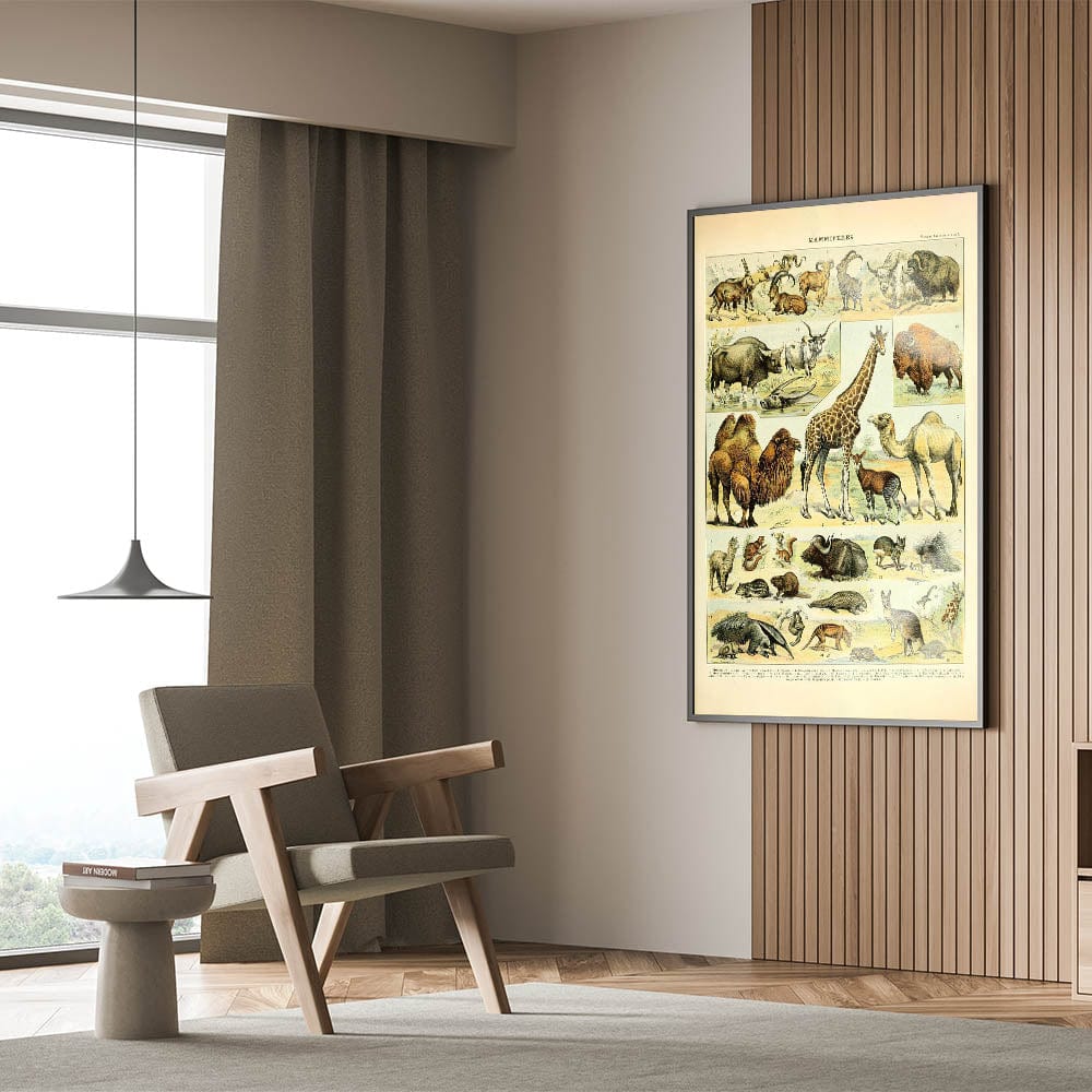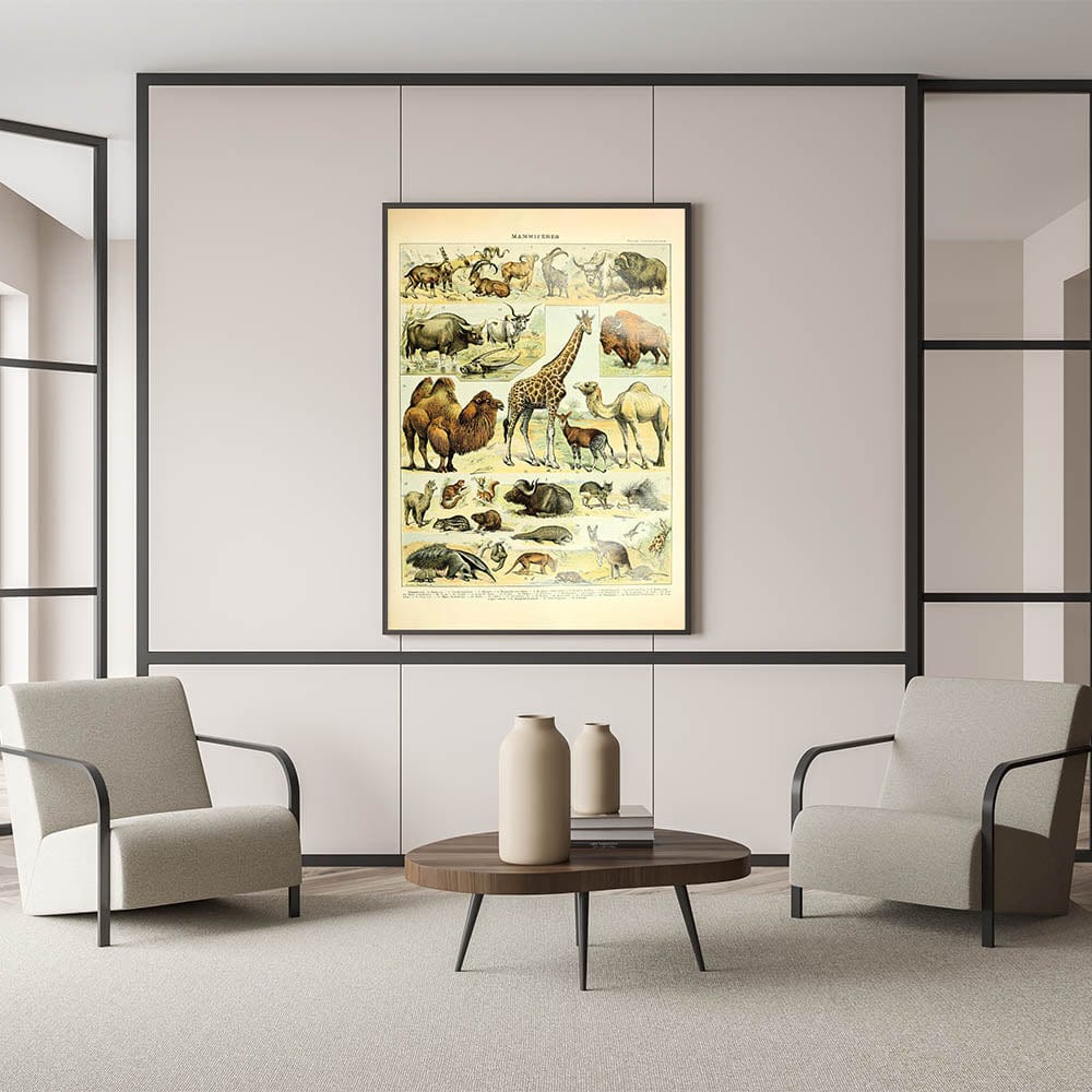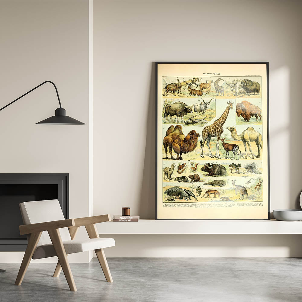 This stunning vintage animal art print presents a beautifully detailed collection of wild mammals, including giraffes, camels, buffalo, antelopes, and more. Illustrated in a scientific vintage style, this handcrafted animal illustration is a perfect decor piece for wildlife enthusiasts, zoologists, and collectors. The artwork’s intricate details and natural tones create a timeless vintage animal art aesthetic that complements any space.