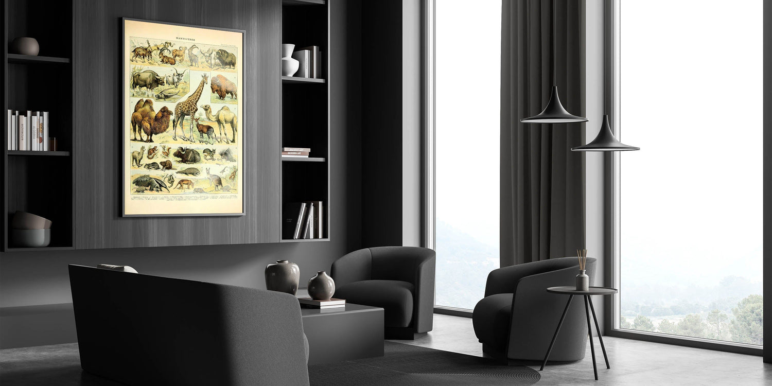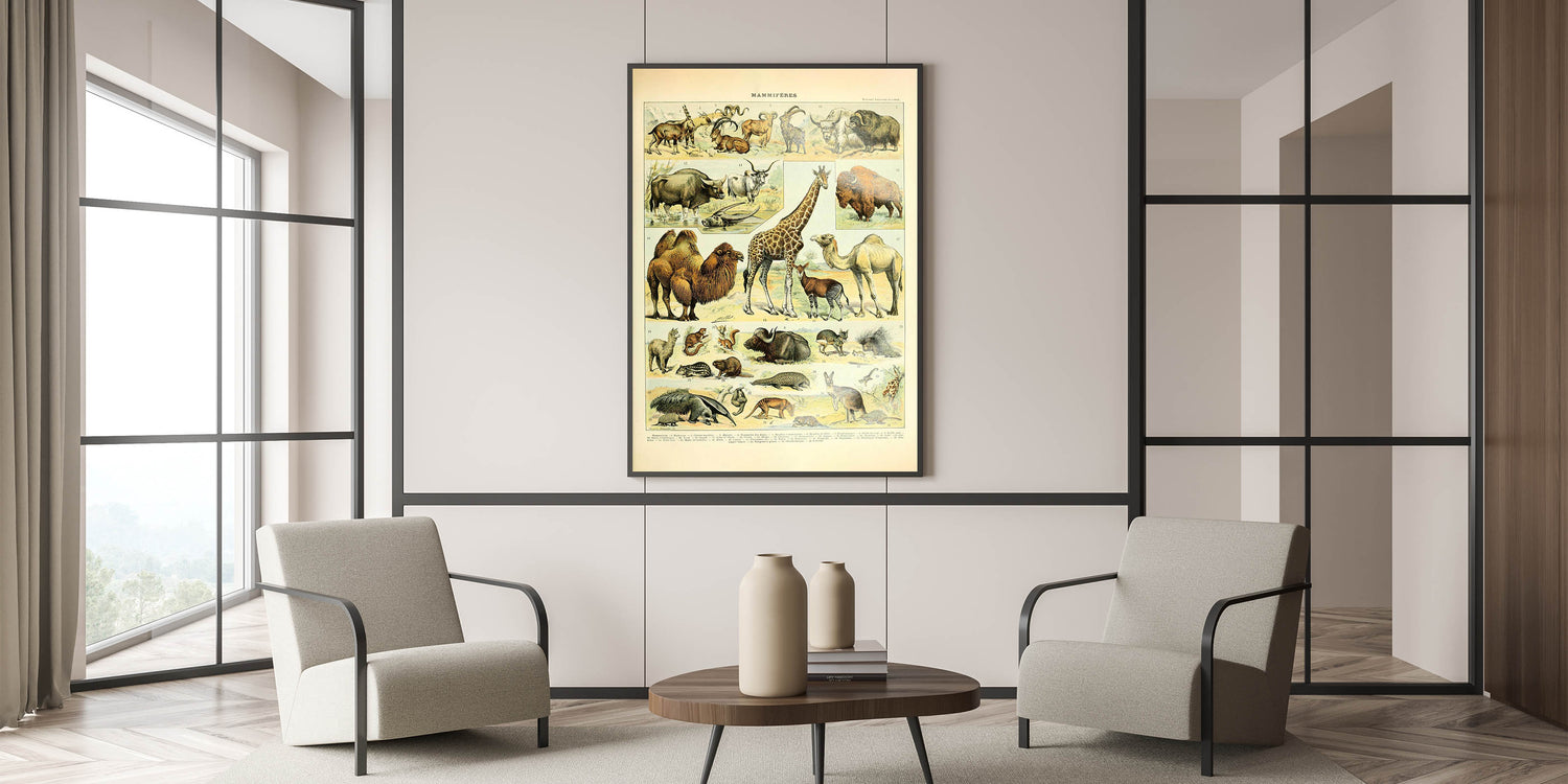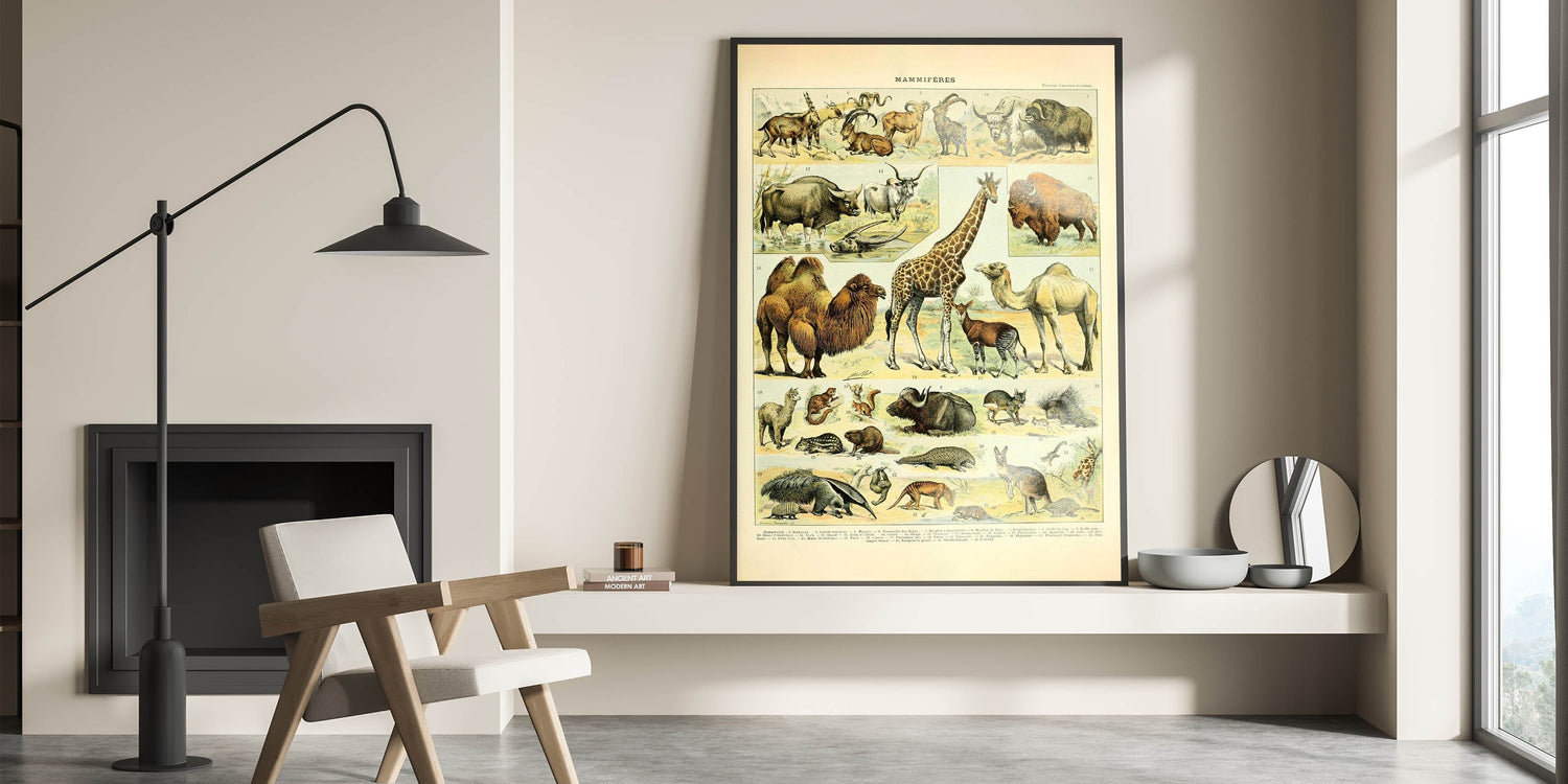 This stunning vintage animal art print presents a beautifully detailed collection of wild mammals, including giraffes, camels, buffalo, antelopes, and more. Illustrated in a scientific vintage style, this handcrafted animal illustration is a perfect decor piece for wildlife enthusiasts, zoologists, and collectors. The artwork’s intricate details and natural tones create a timeless vintage animal art aesthetic that complements any space.