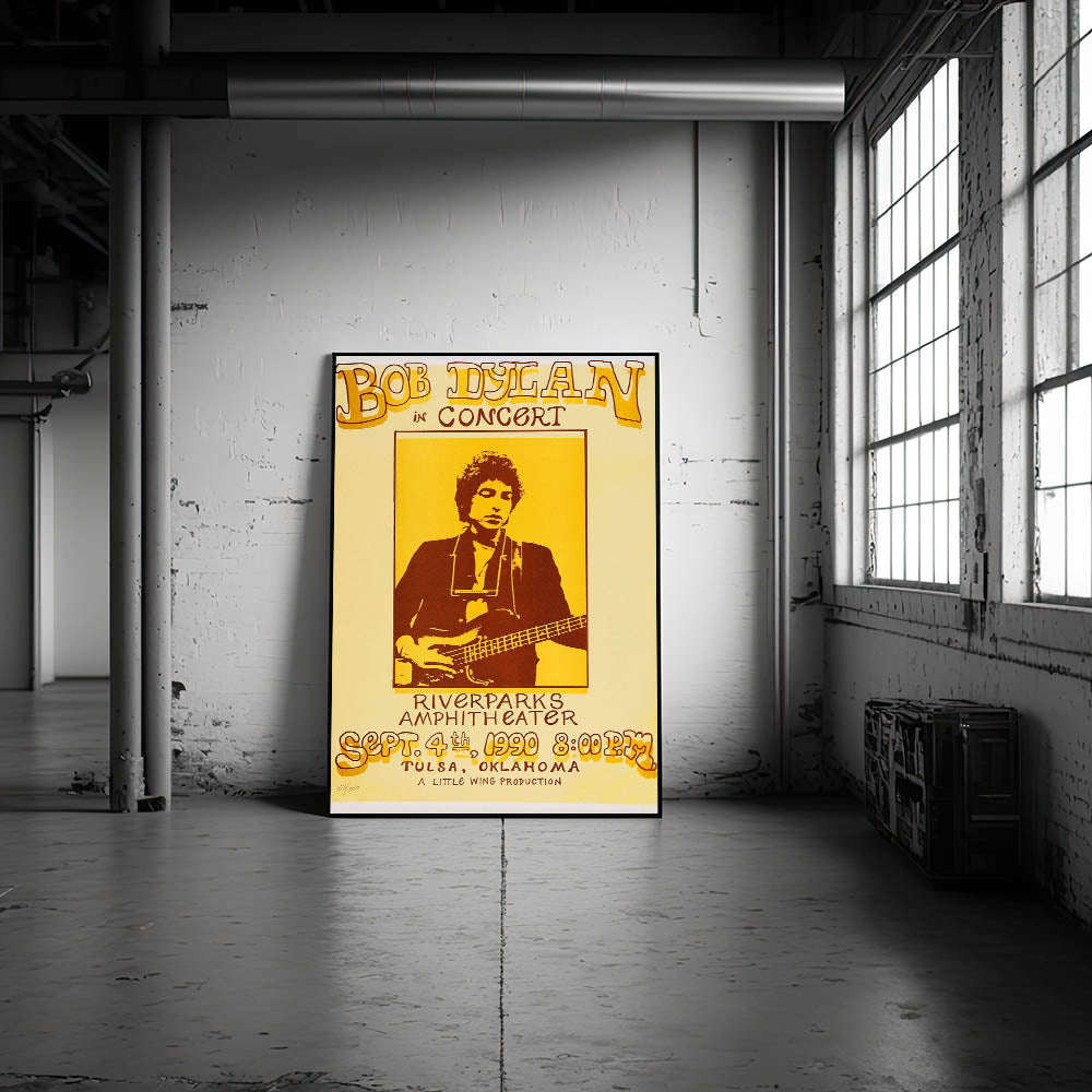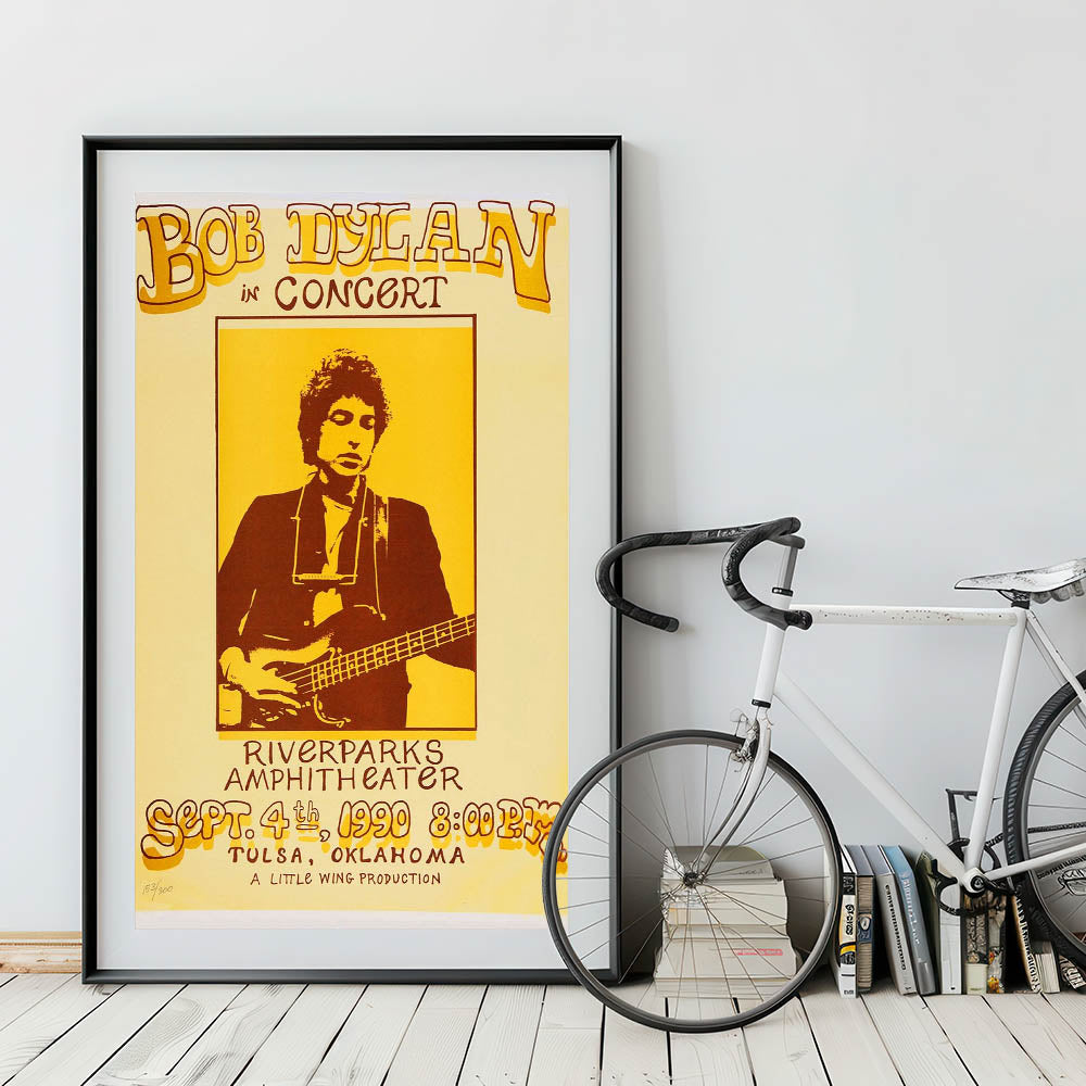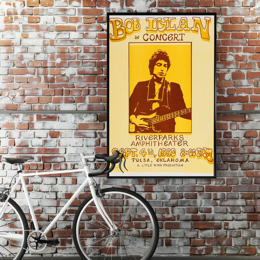 Celebrate the legendary Bob Dylan with this Vintage Bob Dylan Concert Poster from his iconic 1990 performance at the Riverparks Amphitheater in Tulsa, Oklahoma. Featuring a striking retro aesthetic with vibrant yellow and brown tones, this vintage print captures the spirit of classic retro style and nostalgic art prints. Perfect for any Bob Dylan fan or lover of vintage music posters, this artwork brings a timeless piece of music history into your home.