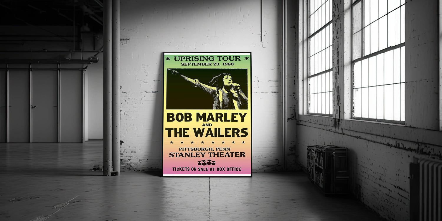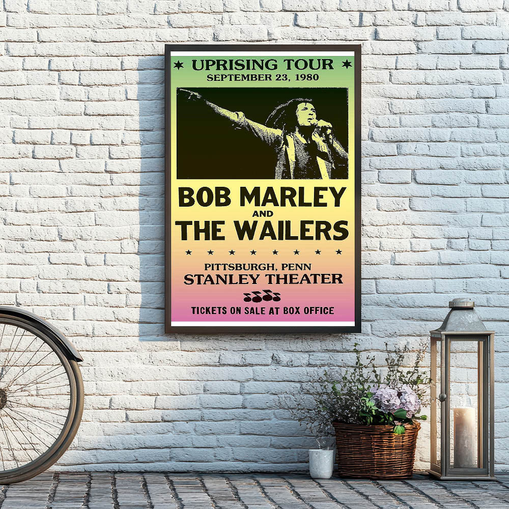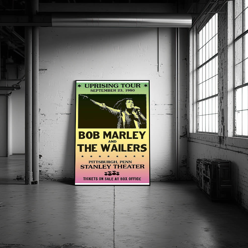 Celebrate the legendary Bob Marley & The Wailers with this Vintage Uprising Tour Poster from their iconic 1980 performance in Pittsburgh. Featuring a vibrant yellow-to-green gradient background, this retro music wall art captures Bob Marley’s commanding presence on stage during the Uprising Tour, making it a must-have for fans of Bob Marley and vintage concert posters. The bold design and bright colors bring the energy of the concert to life, making it a timeless piece of nostalgic art.