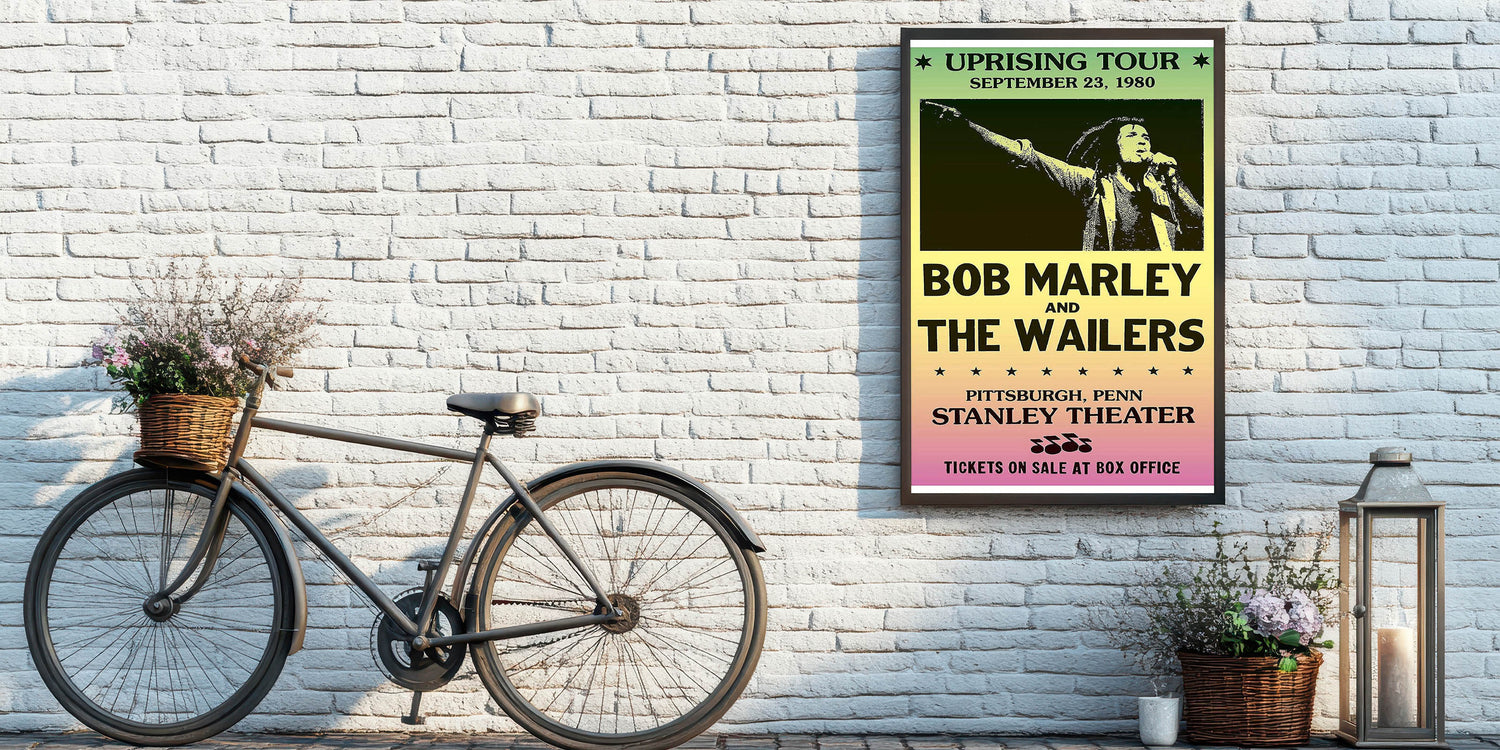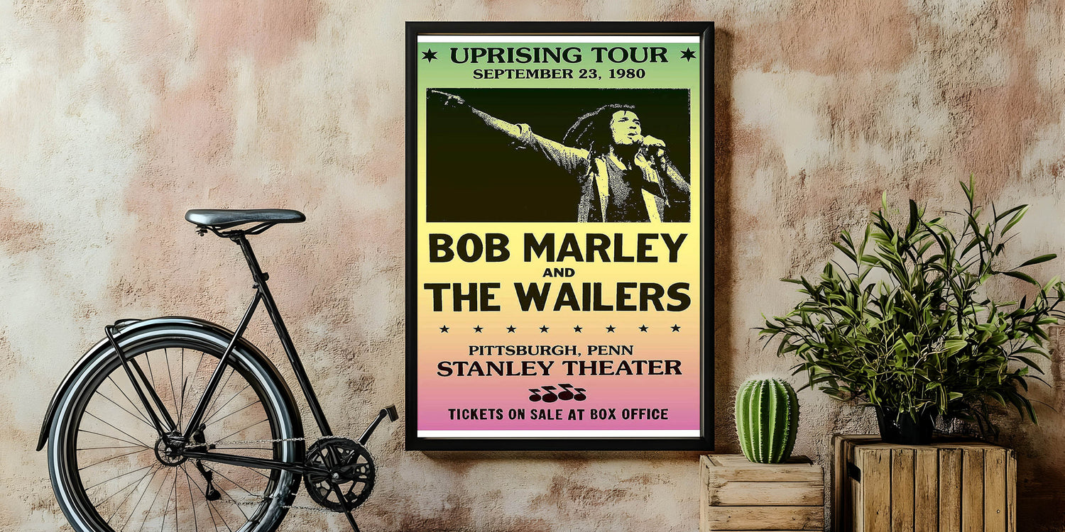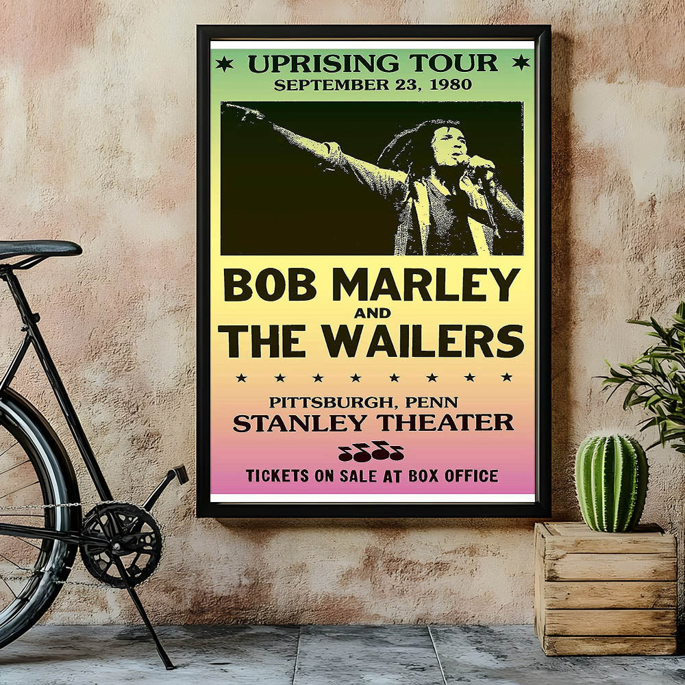 Celebrate the legendary Bob Marley & The Wailers with this Vintage Uprising Tour Poster from their iconic 1980 performance in Pittsburgh. Featuring a vibrant yellow-to-green gradient background, this retro music wall art captures Bob Marley’s commanding presence on stage during the Uprising Tour, making it a must-have for fans of Bob Marley and vintage concert posters. The bold design and bright colors bring the energy of the concert to life, making it a timeless piece of nostalgic art.