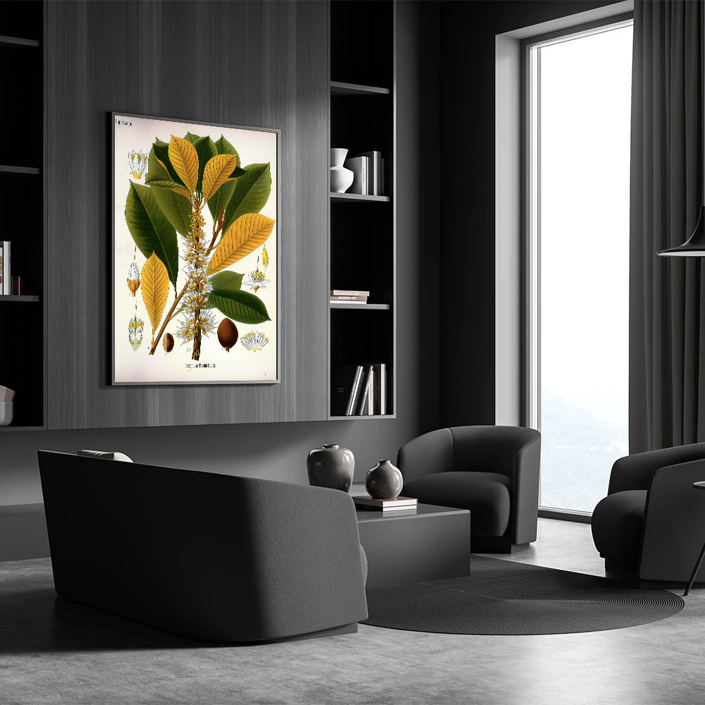 This vintage botanical art print features the detailed illustration of the Palquium tree, showcasing its rich green leaves and delicate white flowers. The vibrant yellow accents on the leaves add a touch of elegance to this nature-inspired piece. Perfect for art enthusiasts and those who appreciate botanical beauty, this print will bring a timeless charm to your space.