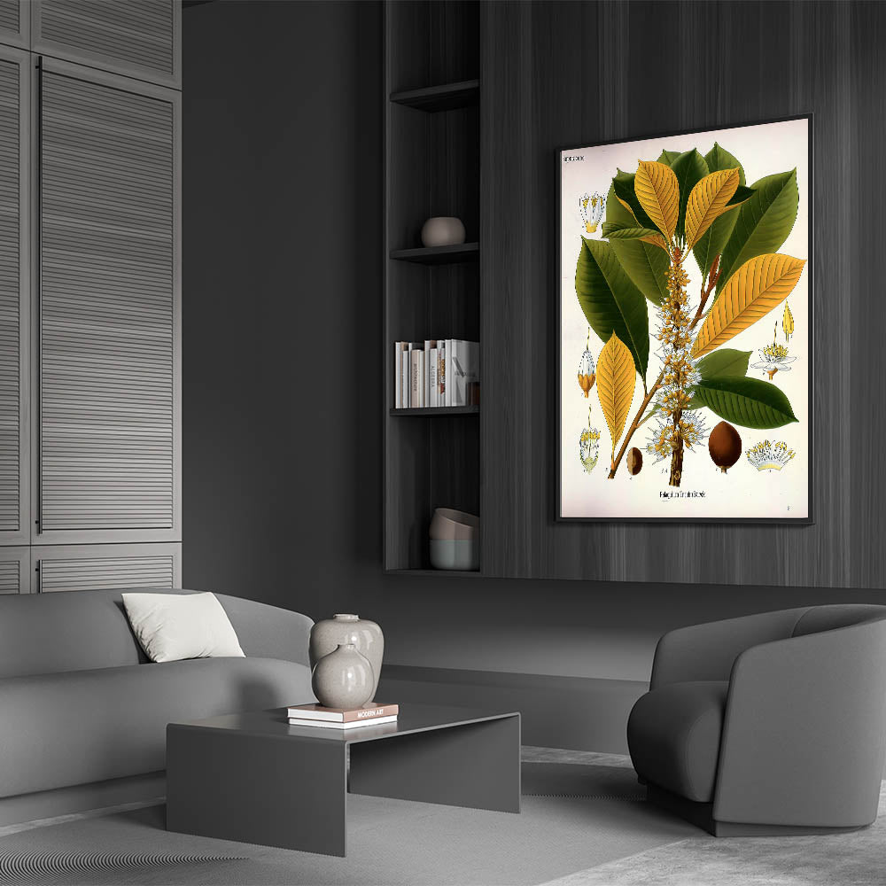 - Beautifully detailed botanical illustration art featuring the Palquium tree with yellow-accented leaves and intricate white flowers.