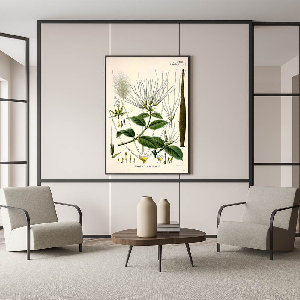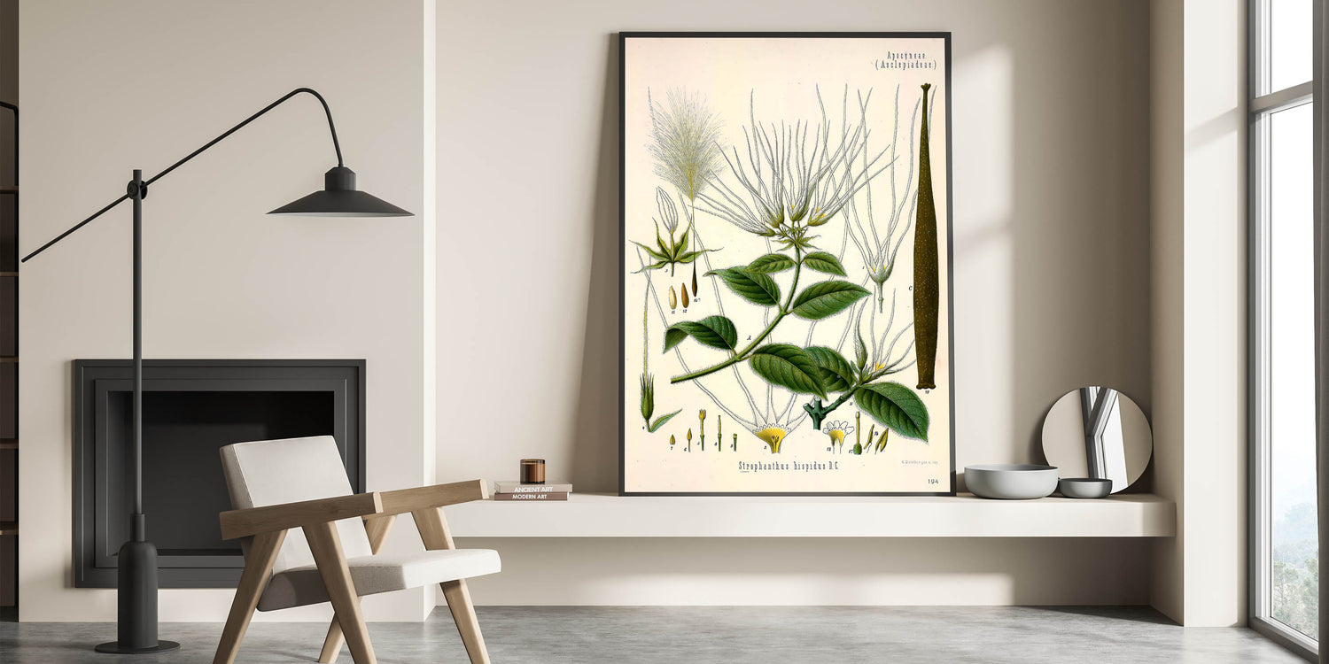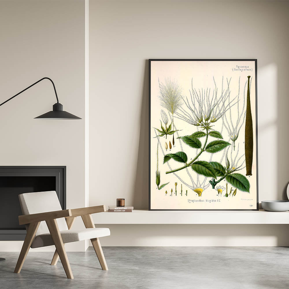 This vintage botanical art print beautifully captures the intricate details of the Strophanthus flower. With its fine lines and delicate green leaves, this botanical illustration art brings a serene, nature-inspired elegance to any space. Perfect for art enthusiasts and nature lovers, this piece adds timeless beauty to your home decor.