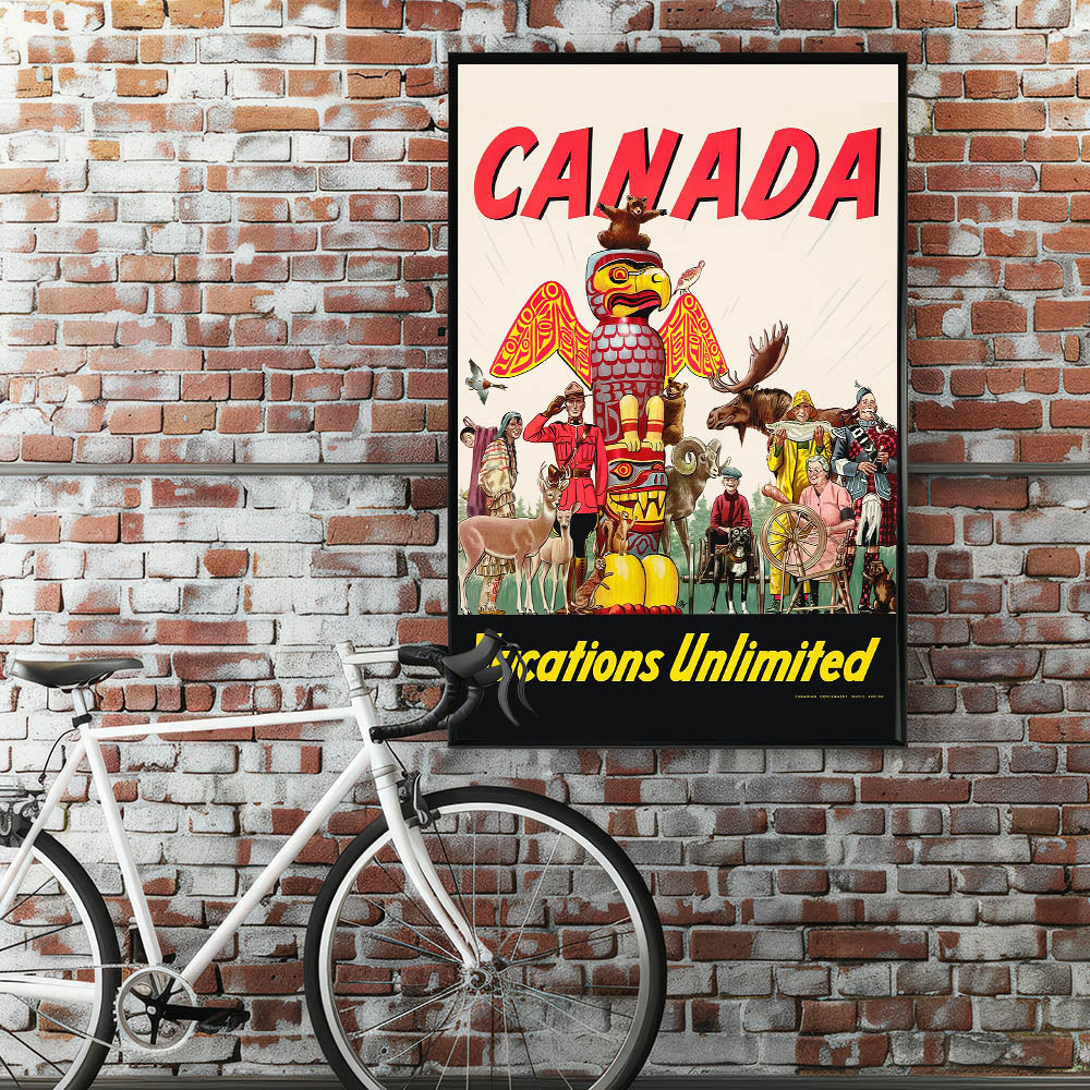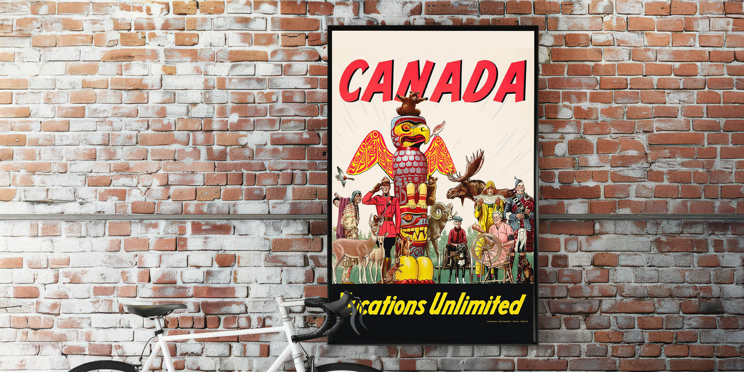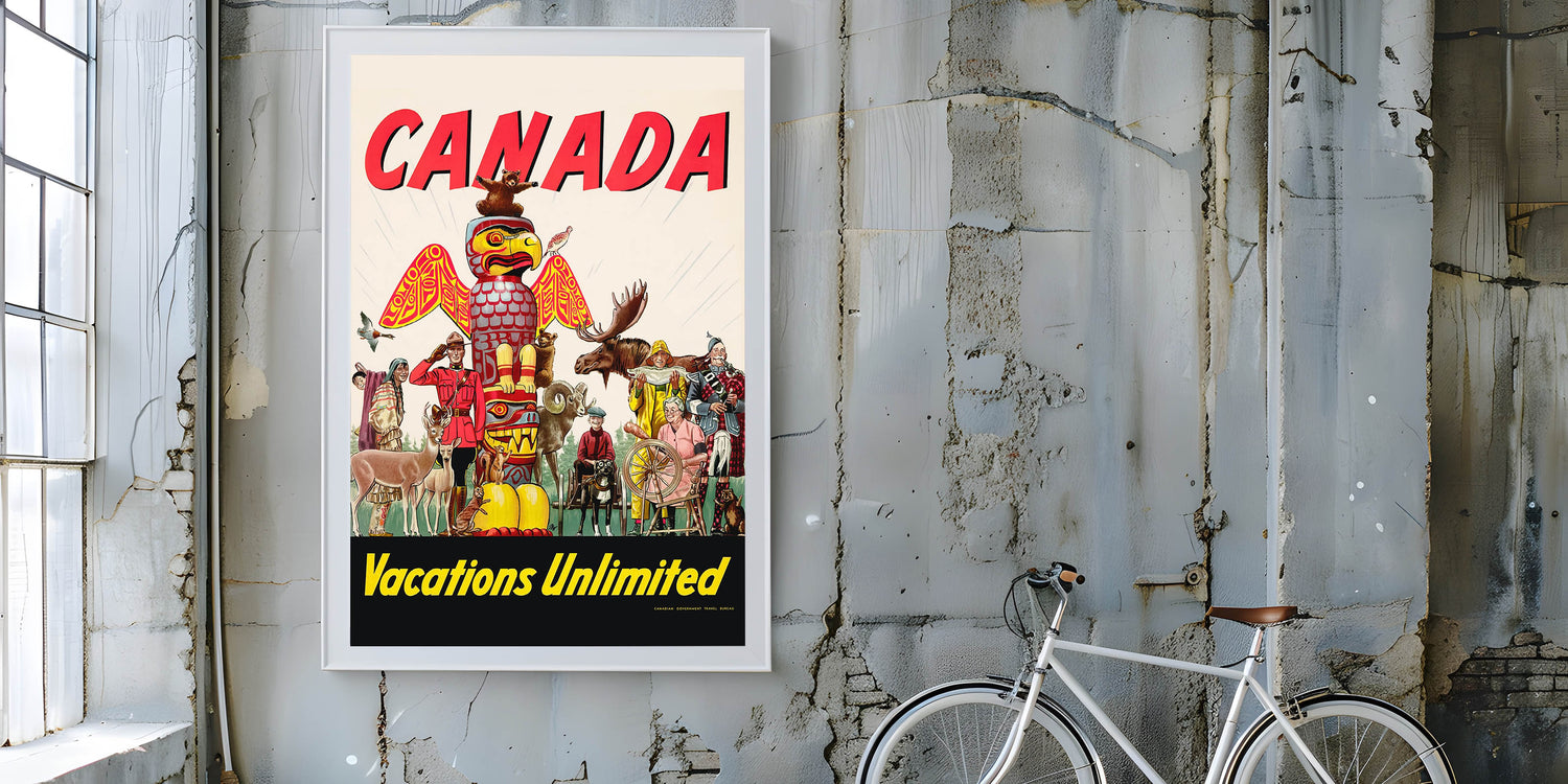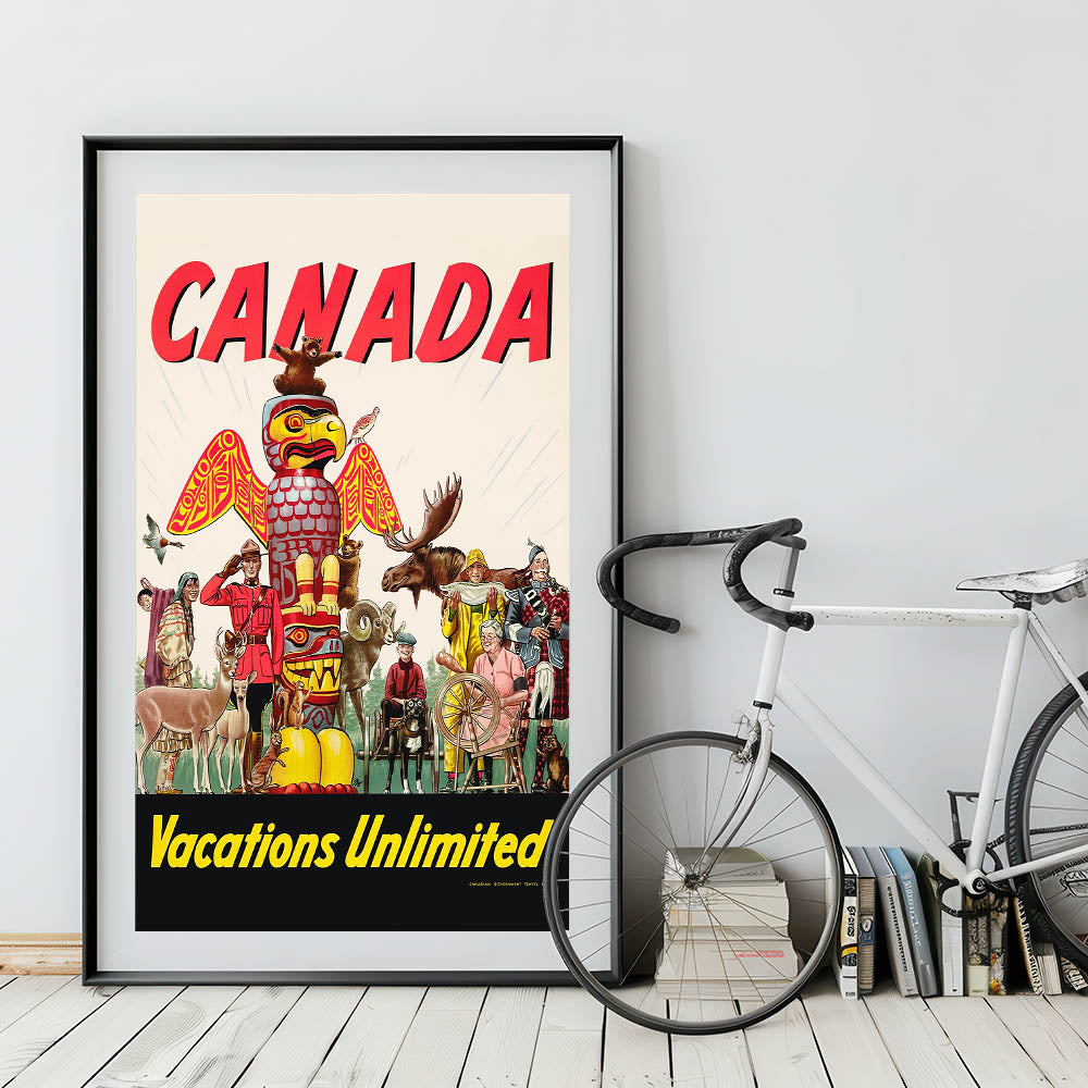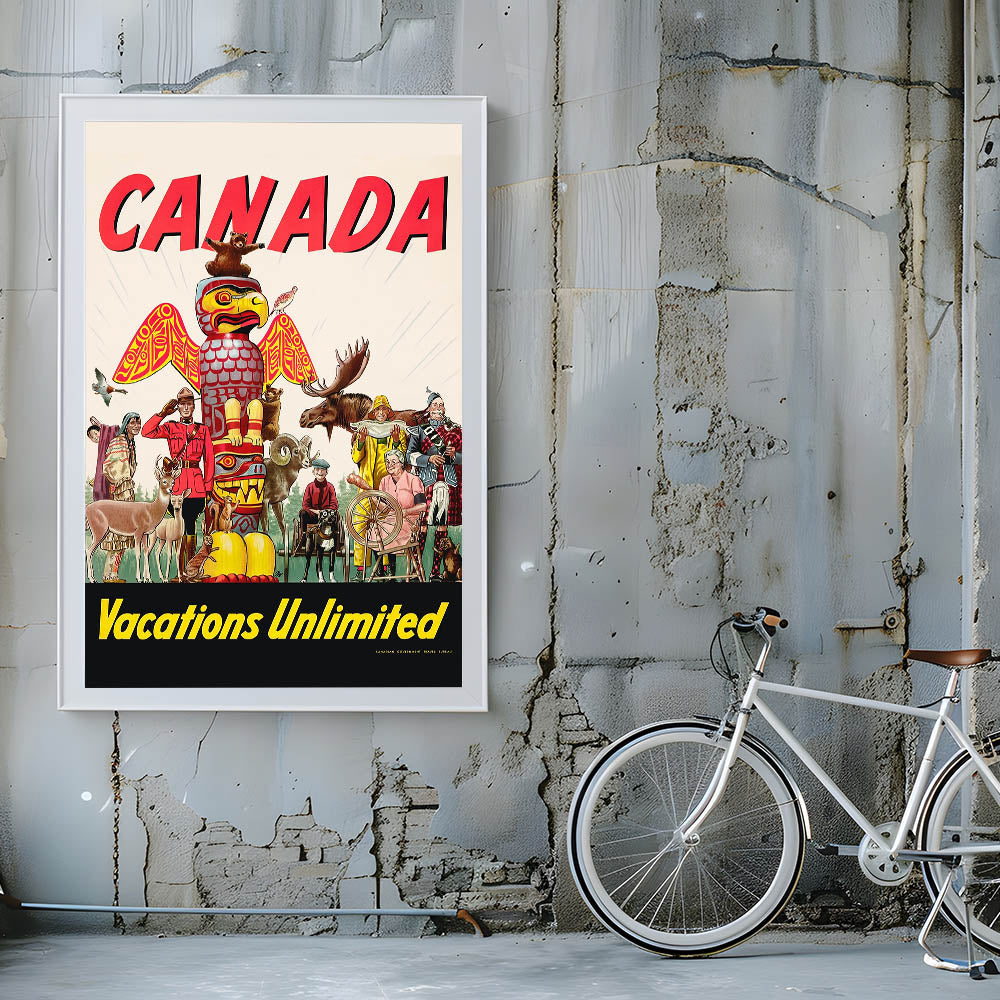 Explore the diverse beauty of Canada with this Vintage Canada Travel Poster, featuring the bold "Vacations Unlimited" slogan. Showcasing a vibrant totem pole, iconic wildlife, and cultural elements like Mounties and traditional attire, this retro travel print captures the essence of Canadian heritage and adventure. The detailed illustrations and lively color palette make it a must-have for those who appreciate nostalgic travel prints and authentic vintage travel art.