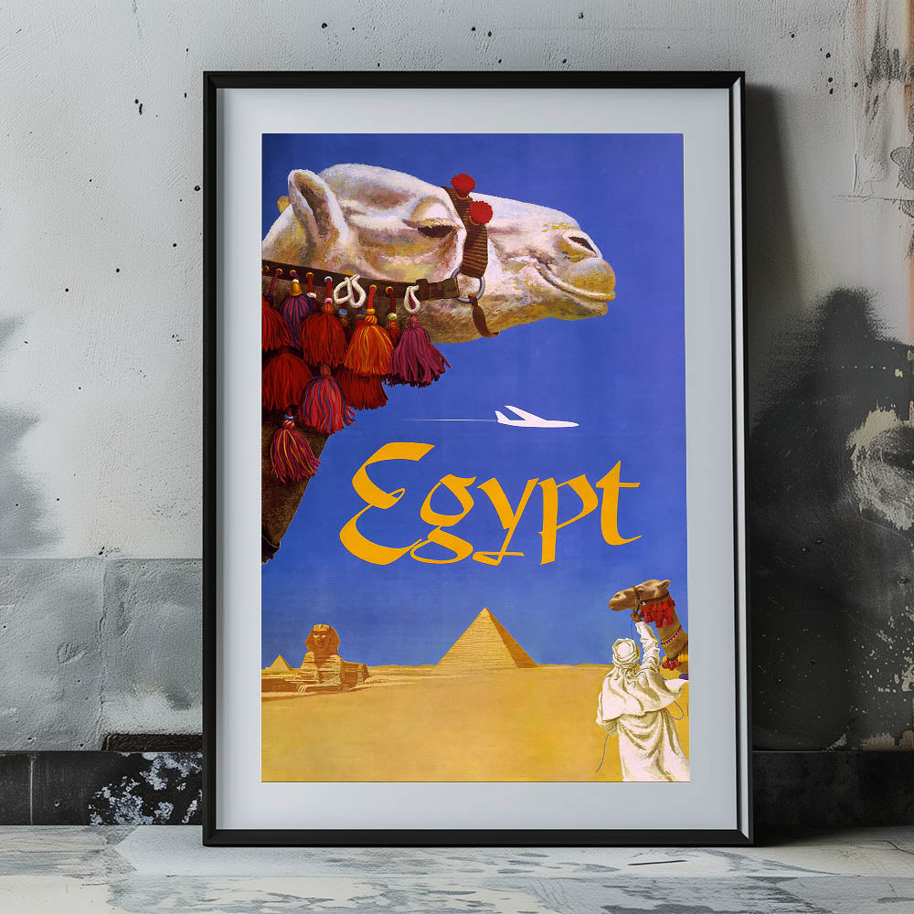 Step back in time with this Vintage Egypt Travel Poster, capturing the essence of classic destinations. Featuring a majestic camel adorned with vibrant tassels, the iconic Pyramids, and the Sphinx set against a rich blue sky, this retro travel print brings the allure of ancient Egypt to your space. Perfect for enthusiasts of classic travel decor and those who appreciate authentic vintage travel art.
