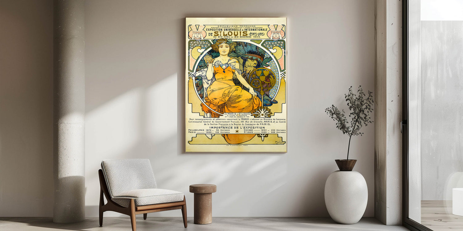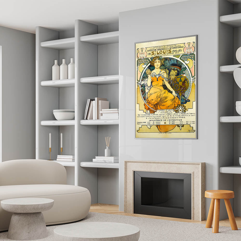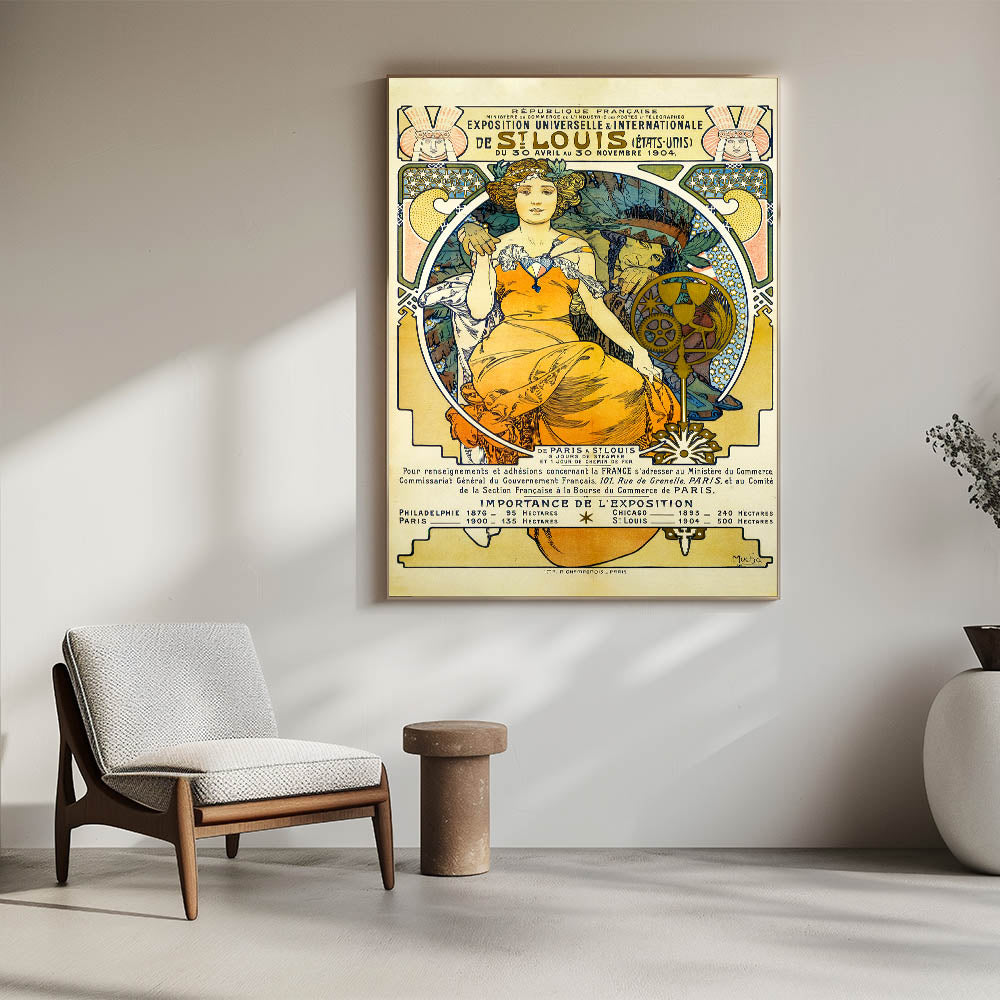 Experience the grandeur of the 1904 Exposition Universelle et Internationale de St. Louis with this stunning vintage exhibition poster. Designed by the famous artist Alphonse Mucha, this retro art print captures the spirit of the world’s fair through the graceful figure of a woman in an elaborate gown, surrounded by intricate floral and symbolic elements. The poster reflects the historical importance of the exposition and its influence on global culture at the time.