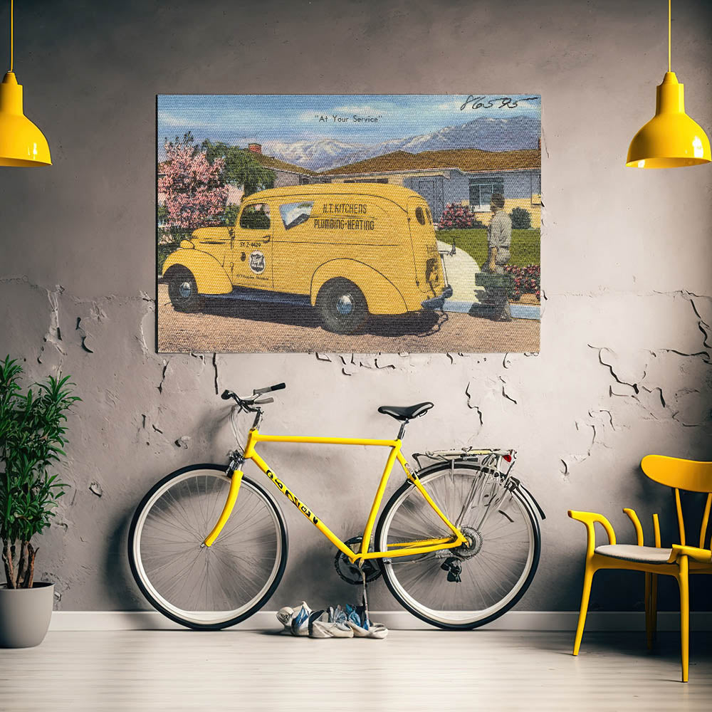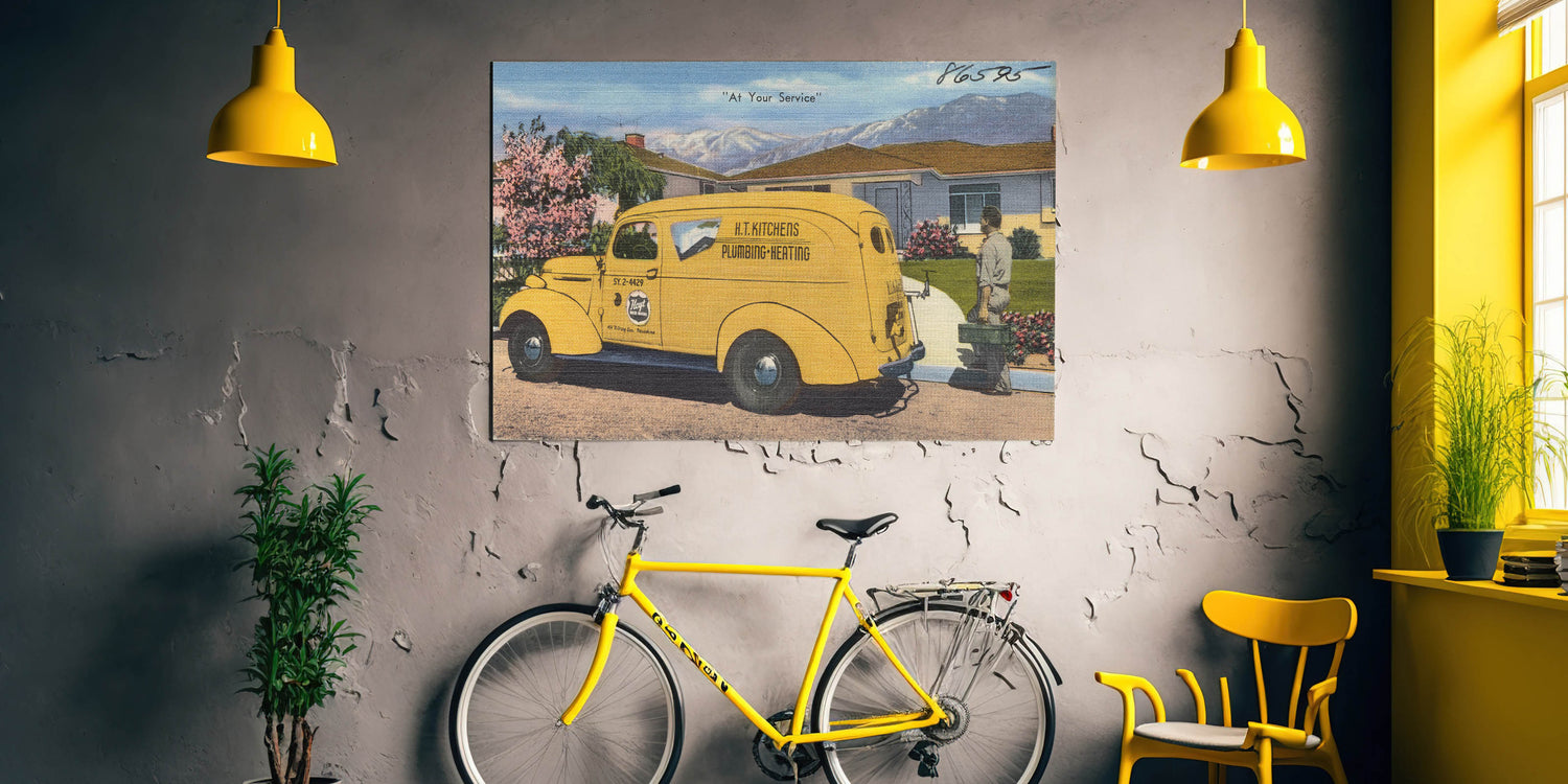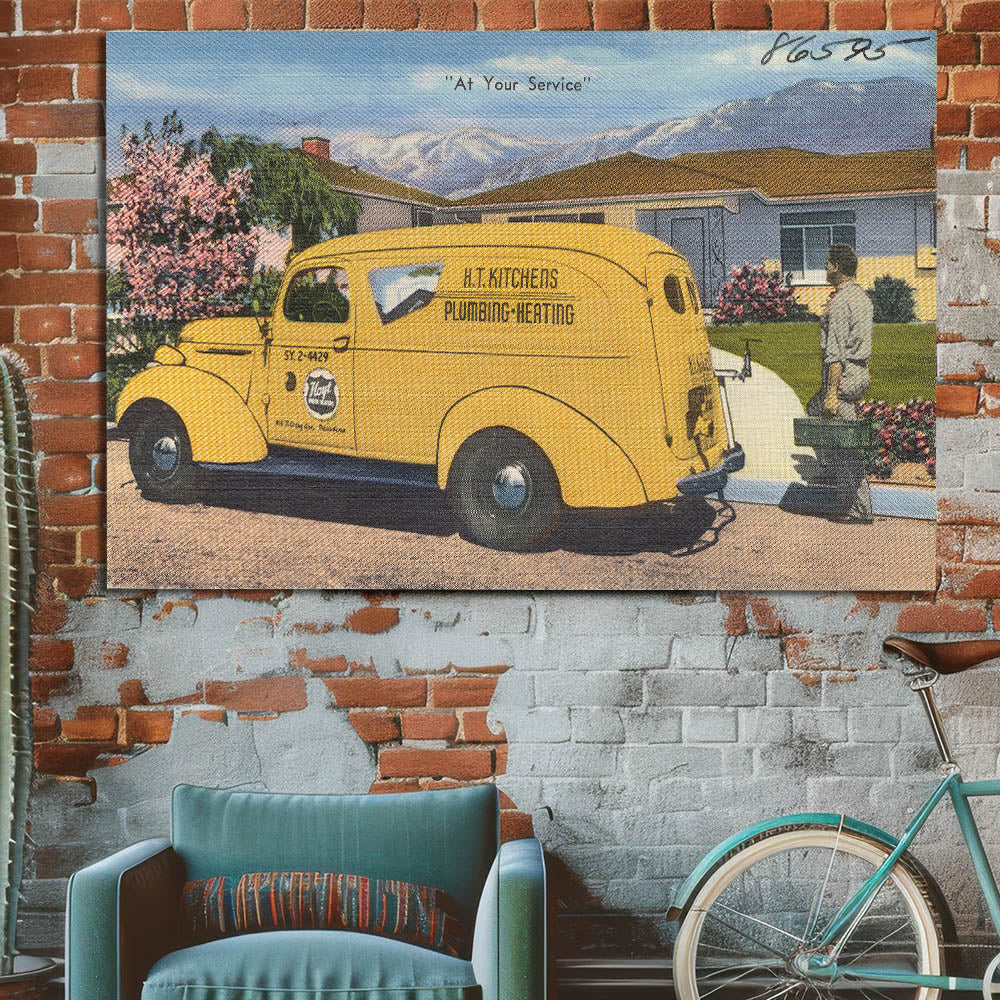 Add a touch of nostalgia to your space with this vintage poster of the H.T. Kitchens Plumbing and Heating van. The bright yellow van stands out against a picturesque backdrop of flowering trees and mountains, capturing the essence of mid-century service vehicles. Ideal for those who appreciate quirky vintage advertising and retro travel prints, this artwork brings a cheerful, service-oriented vibe to any room.