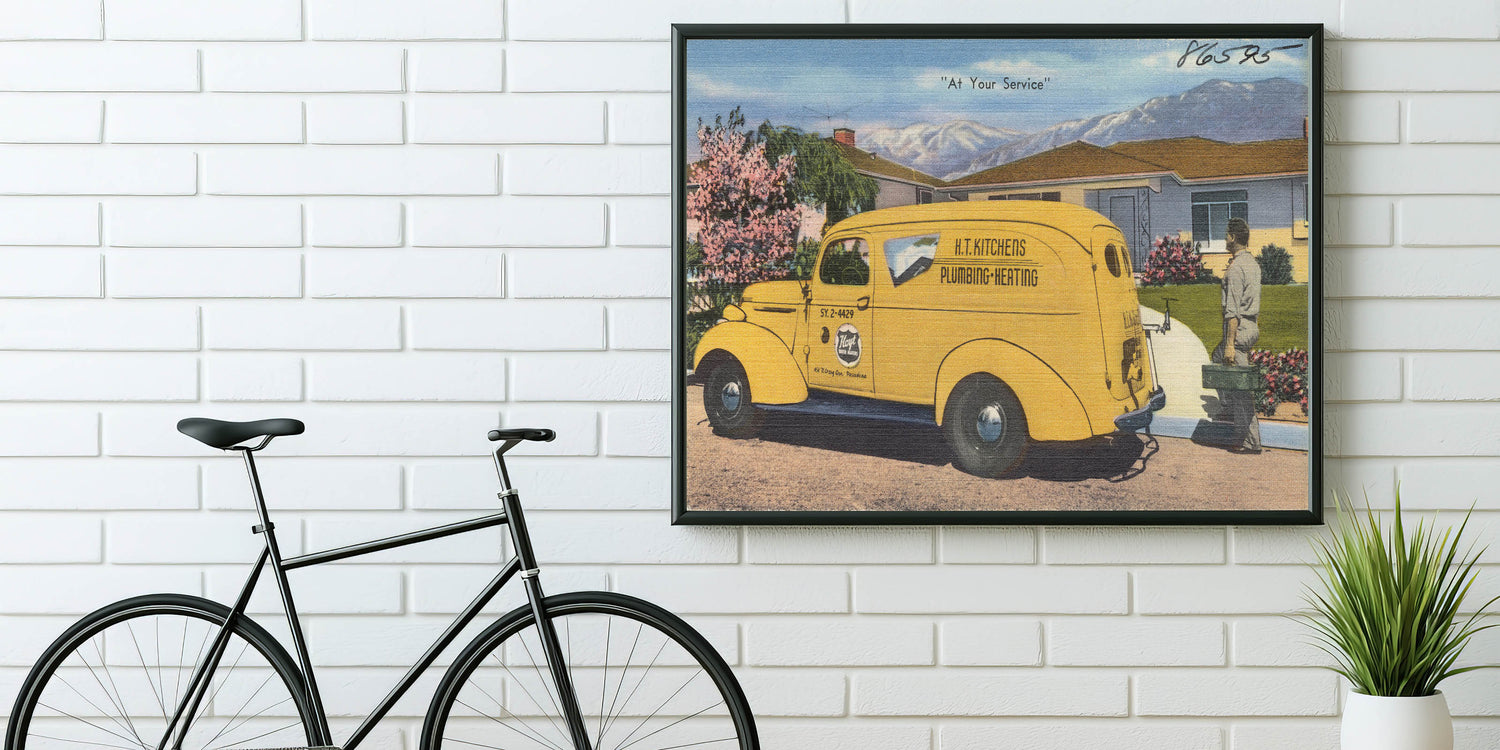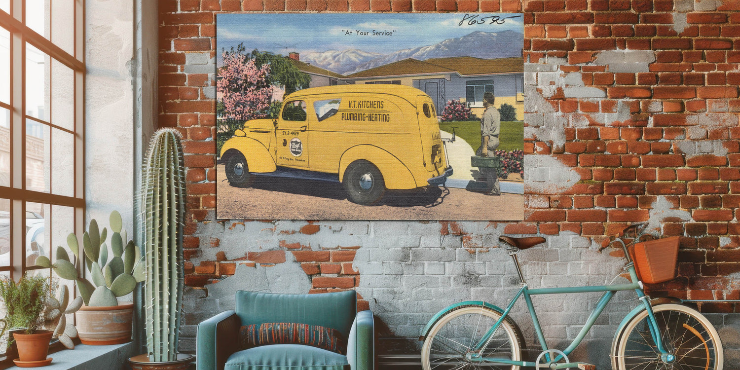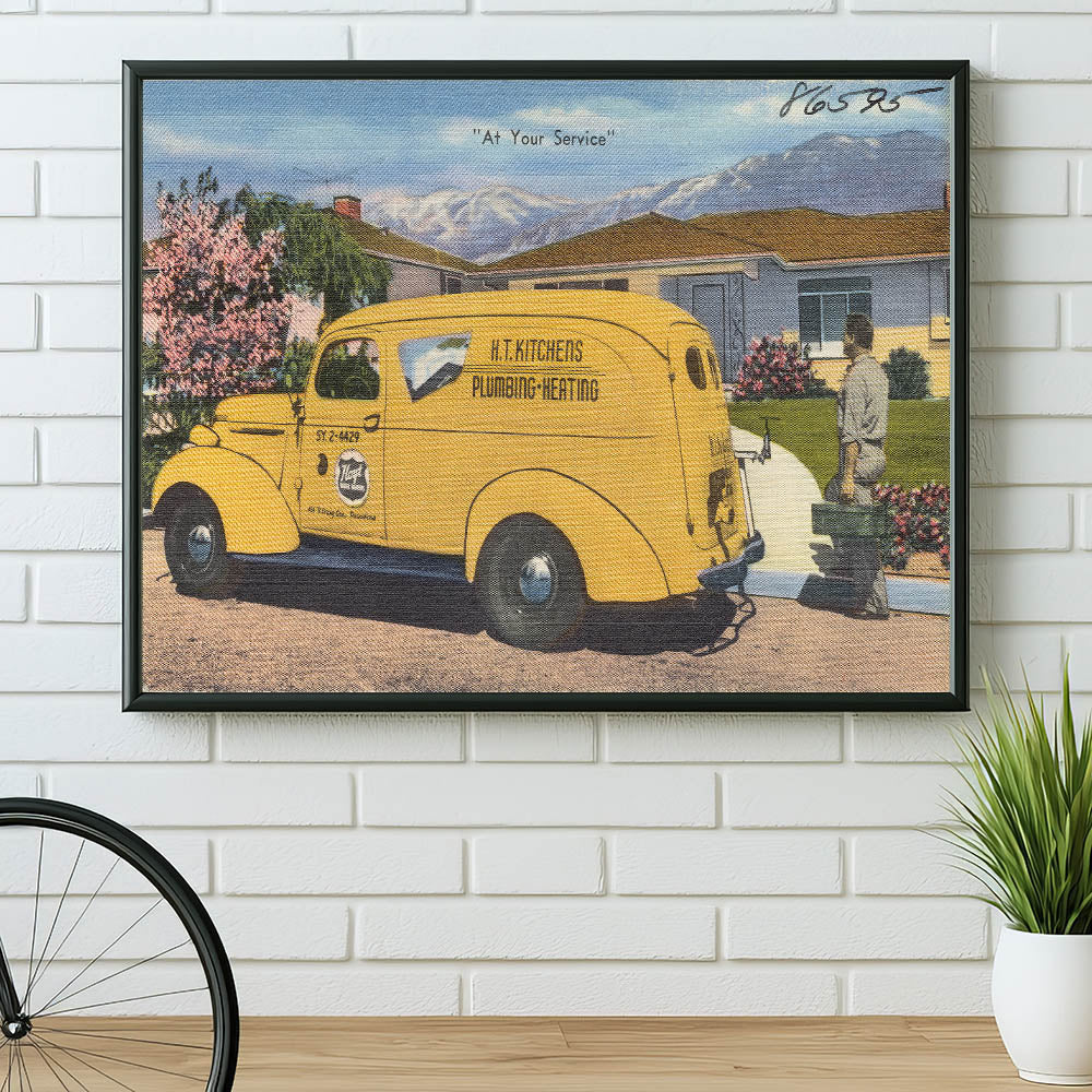 Add a touch of nostalgia to your space with this vintage poster of the H.T. Kitchens Plumbing and Heating van. The bright yellow van stands out against a picturesque backdrop of flowering trees and mountains, capturing the essence of mid-century service vehicles. Ideal for those who appreciate quirky vintage advertising and retro travel prints, this artwork brings a cheerful, service-oriented vibe to any room.