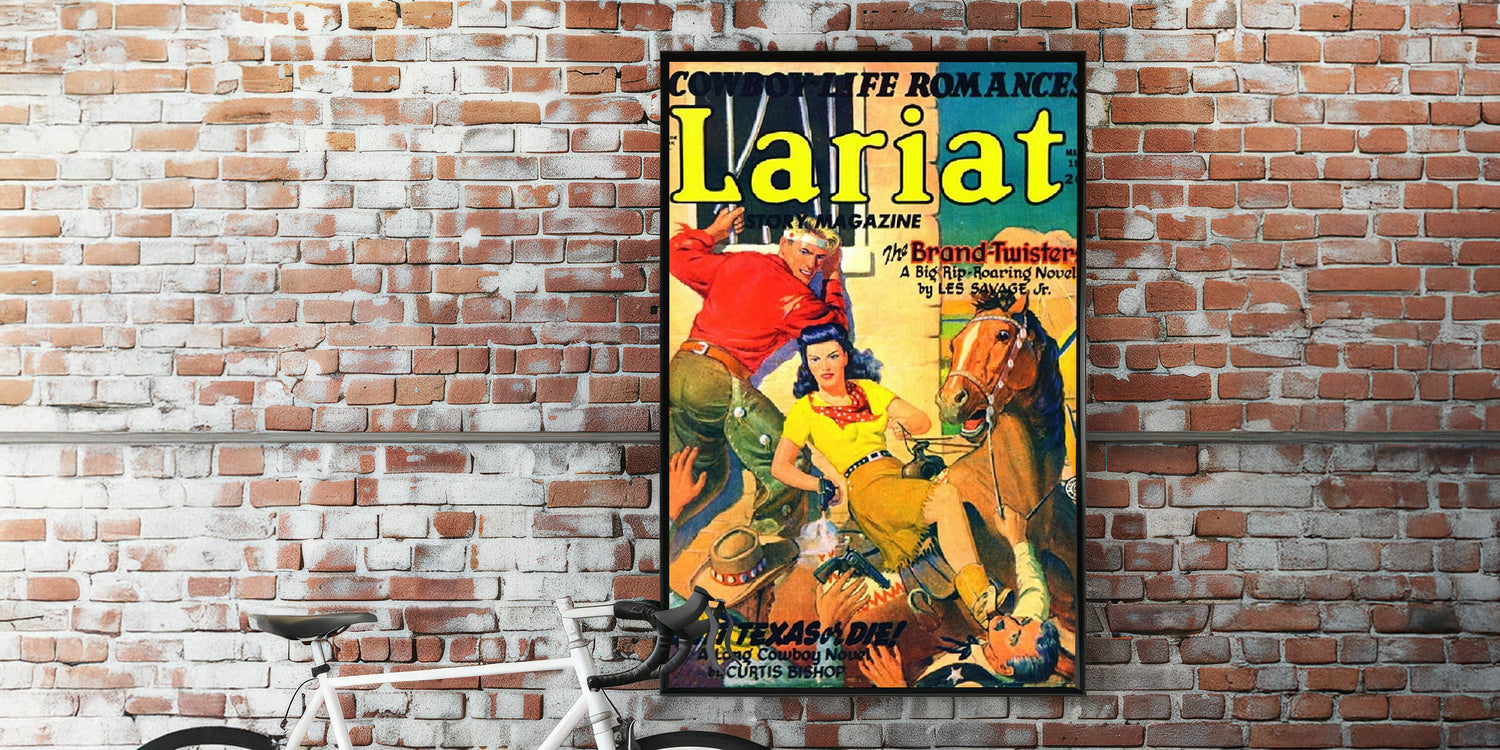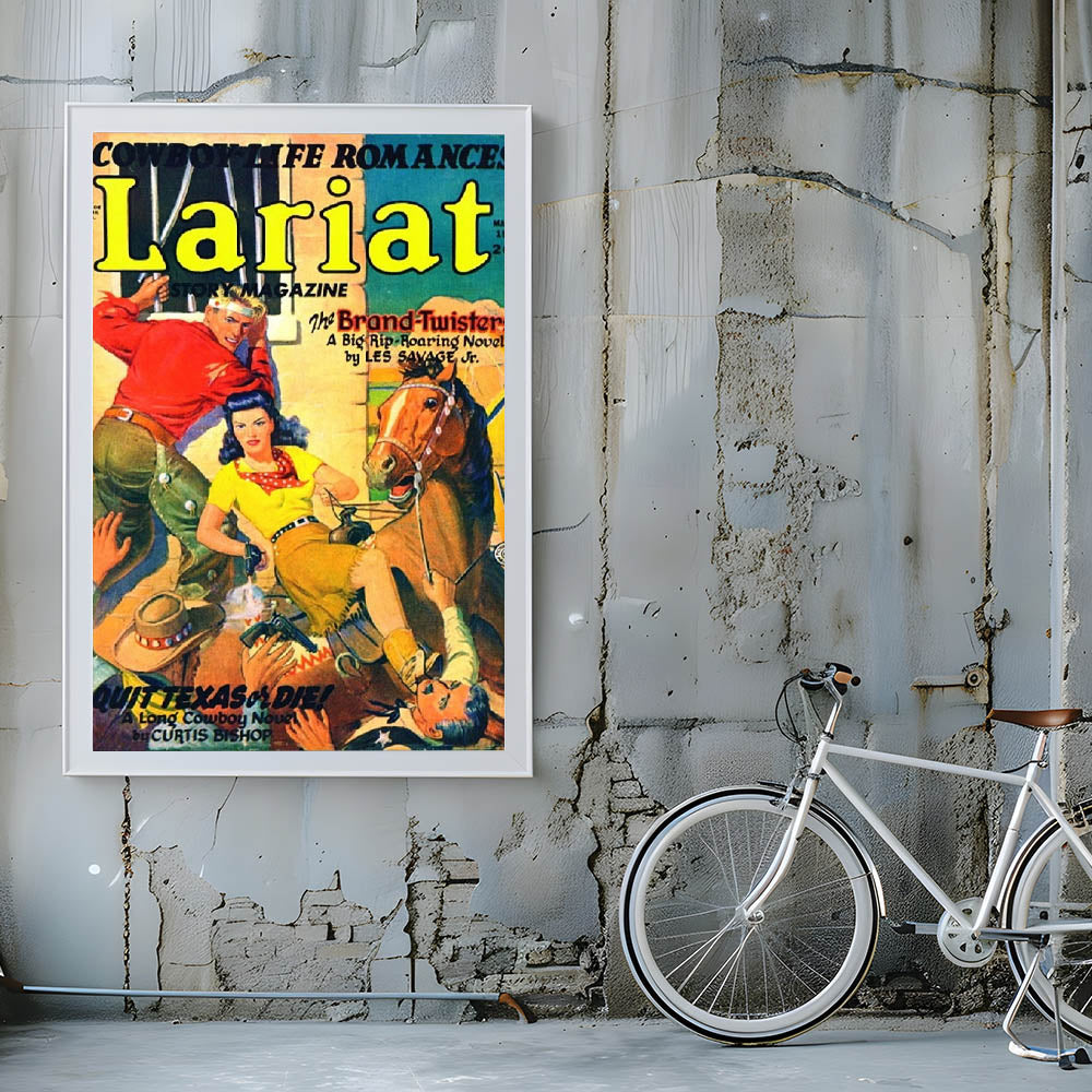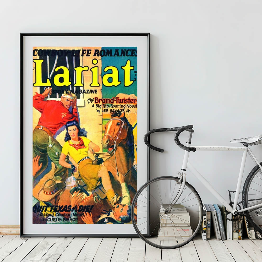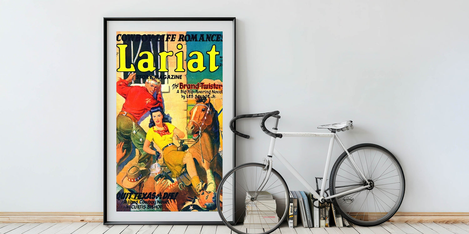 This antique magazine cover art brings vintage cowboy romance and action to life. Whether you are a collector of retro magazine cover prints or searching for a unique centerpiece, this print captures the essence of classic Western storytelling.