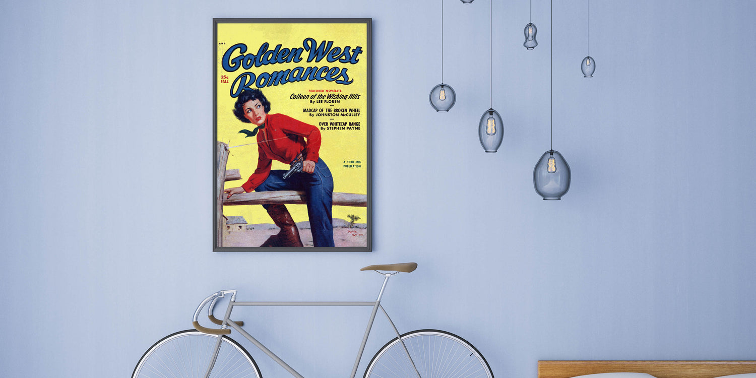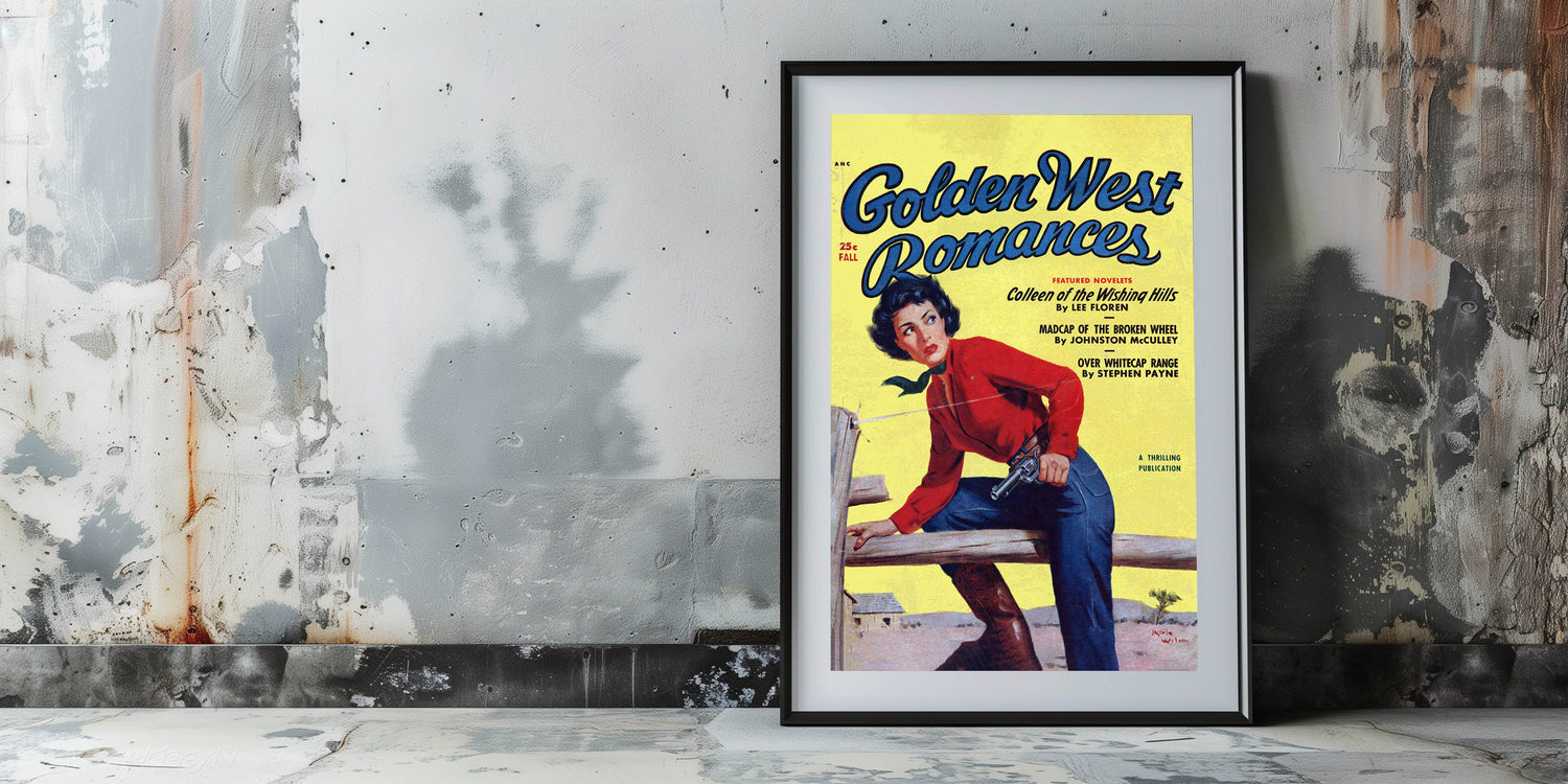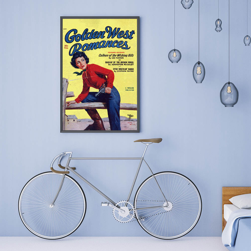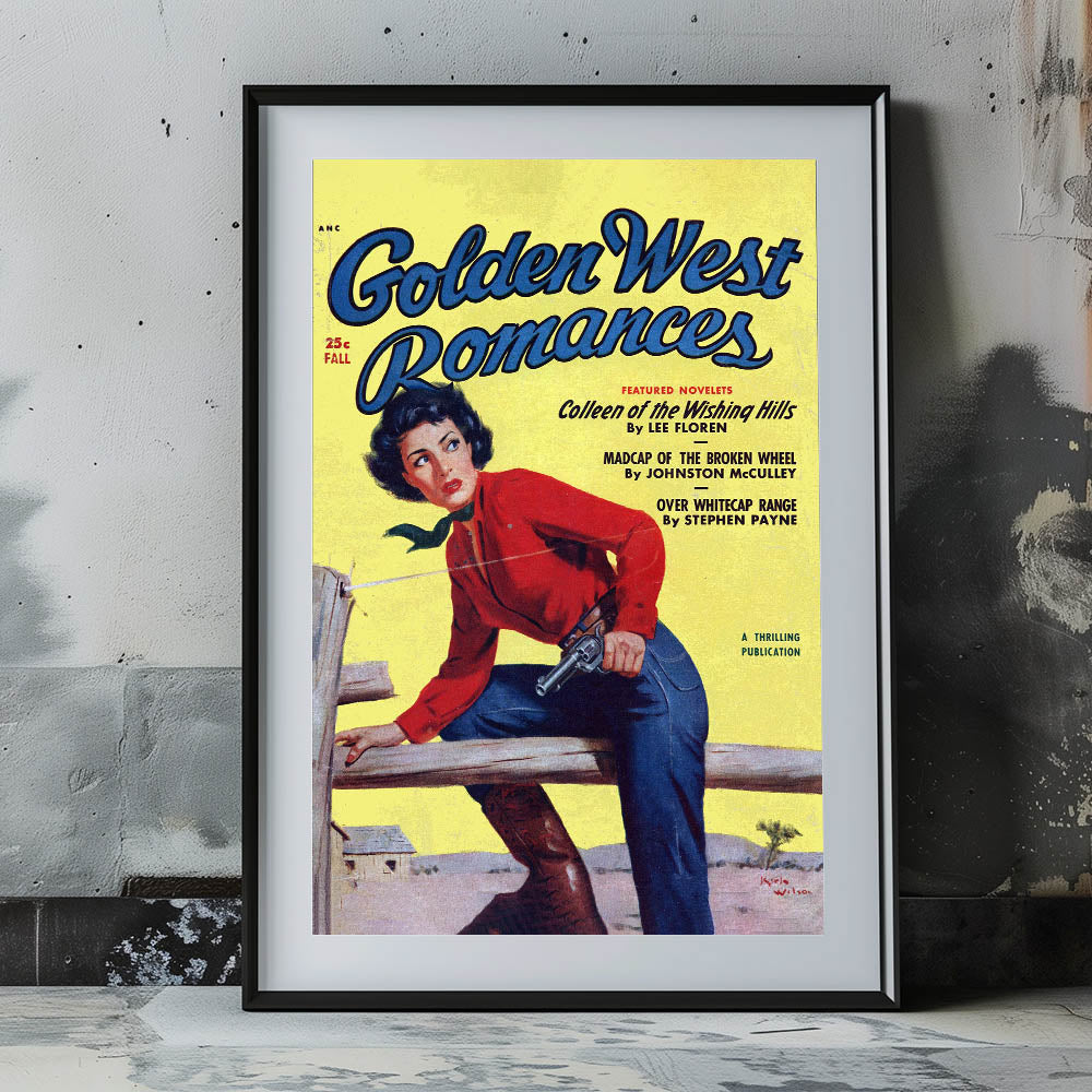 Step into the world of vintage magazine cover wall art with this captivating Western romance illustration. Featuring a bold female gunslinger in a dramatic standoff, this classic magazine cover artwork embodies the strength and resilience of frontier women. With its vibrant colors and nostalgic charm, this retro print for home decor is a perfect addition to any collection of Western-themed art.