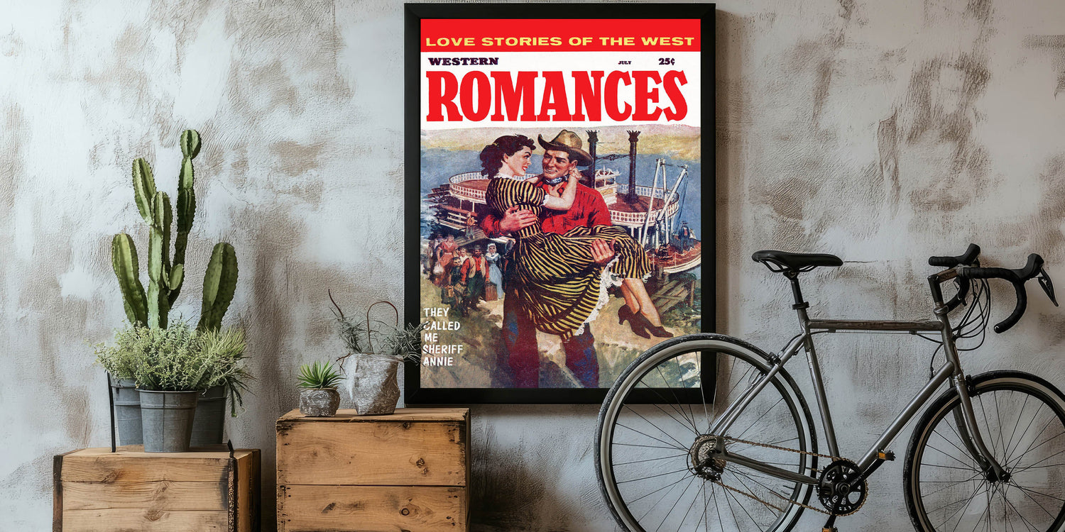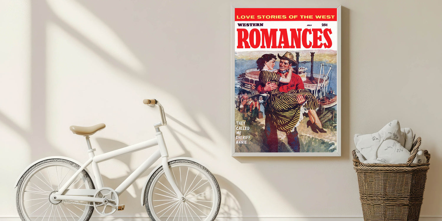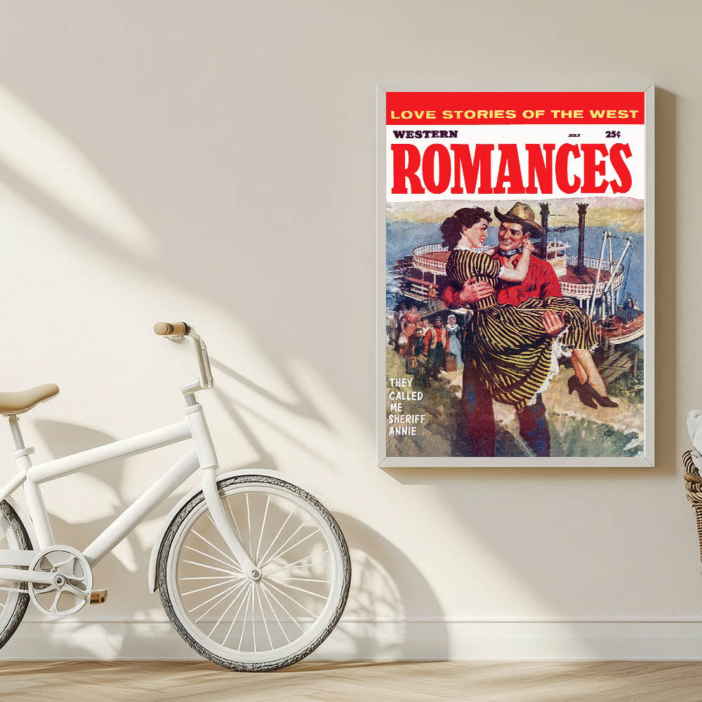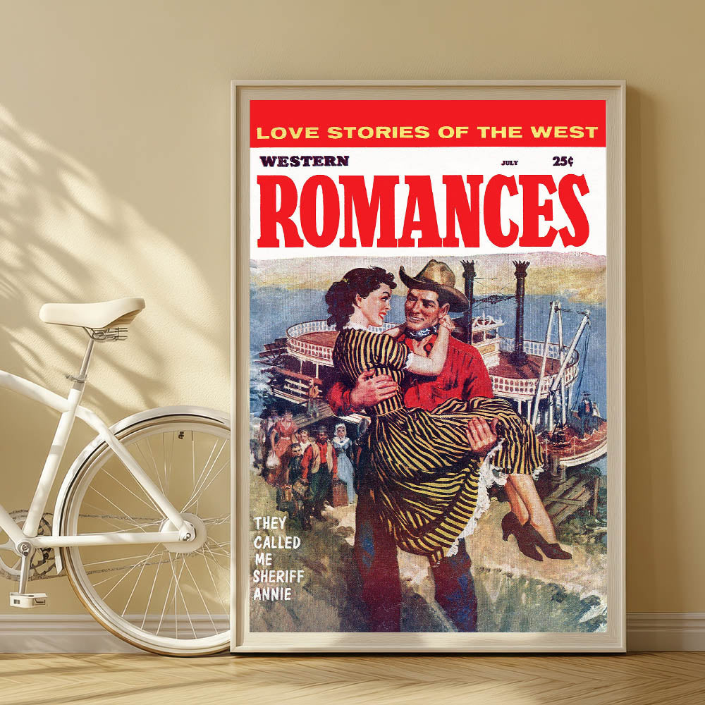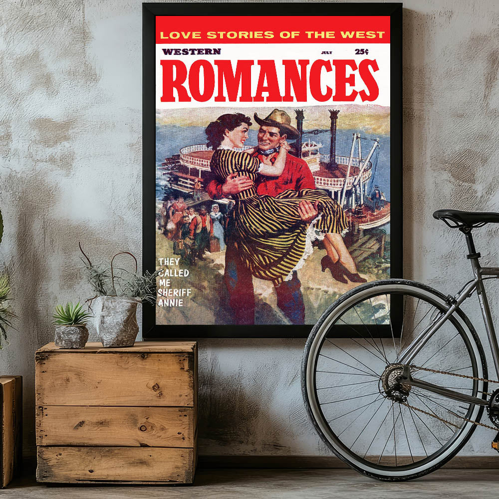 This Vintage Magazine Cover Wall Art showcases a charming and adventurous Western Romances Magazine cover, capturing the excitement of love stories set in the Wild West. The vibrant illustration features a cowboy carrying a woman in front of a classic riverboat, symbolizing romance, adventure, and frontier spirit. This classic magazine cover artwork is perfect for collectors, vintage romance enthusiasts, and fans of retro prints for home decor.