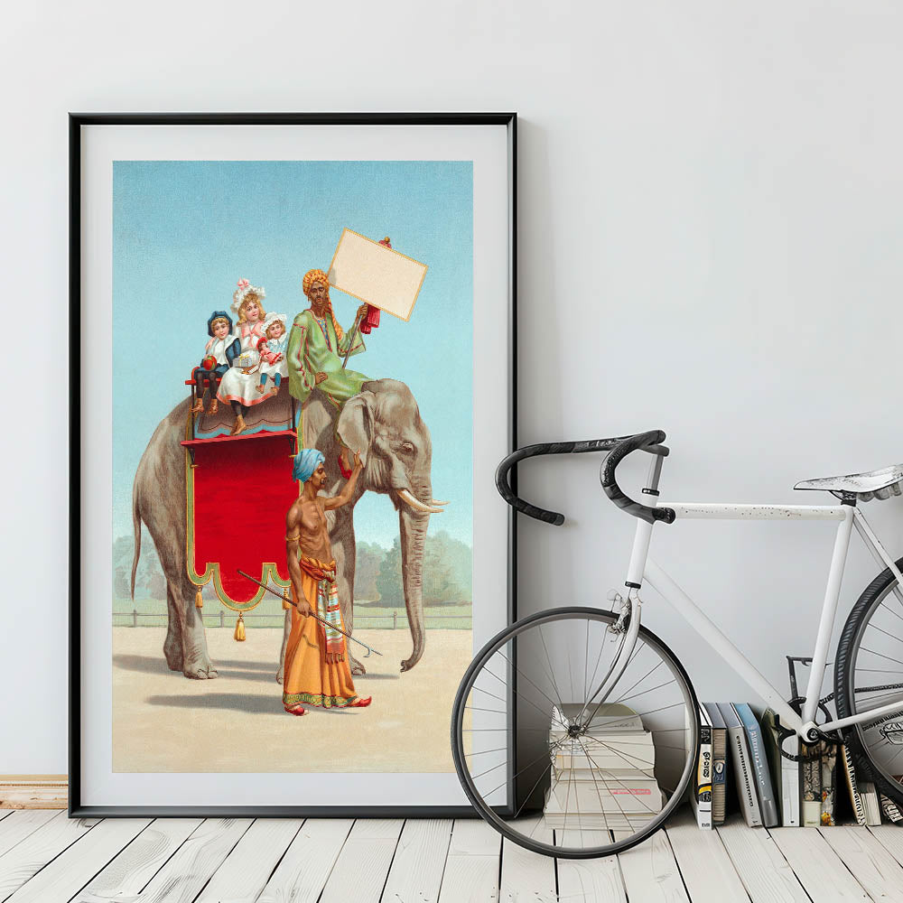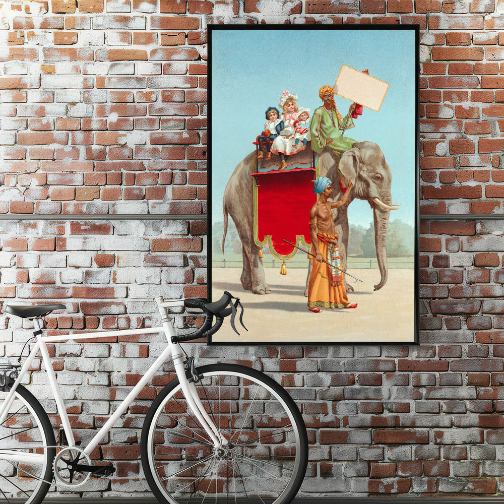 Step into a world of nostalgic fun with this Vintage Travel Poster featuring a whimsical circus scene. Depicting a joyful elephant ride with children seated in a colorful carriage, this artwork evokes the charm of classic family entertainment. The vibrant colors and lively design bring the energy and magic of the circus to life, making it a perfect addition to any space that celebrates fun and adventure.