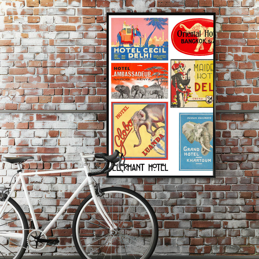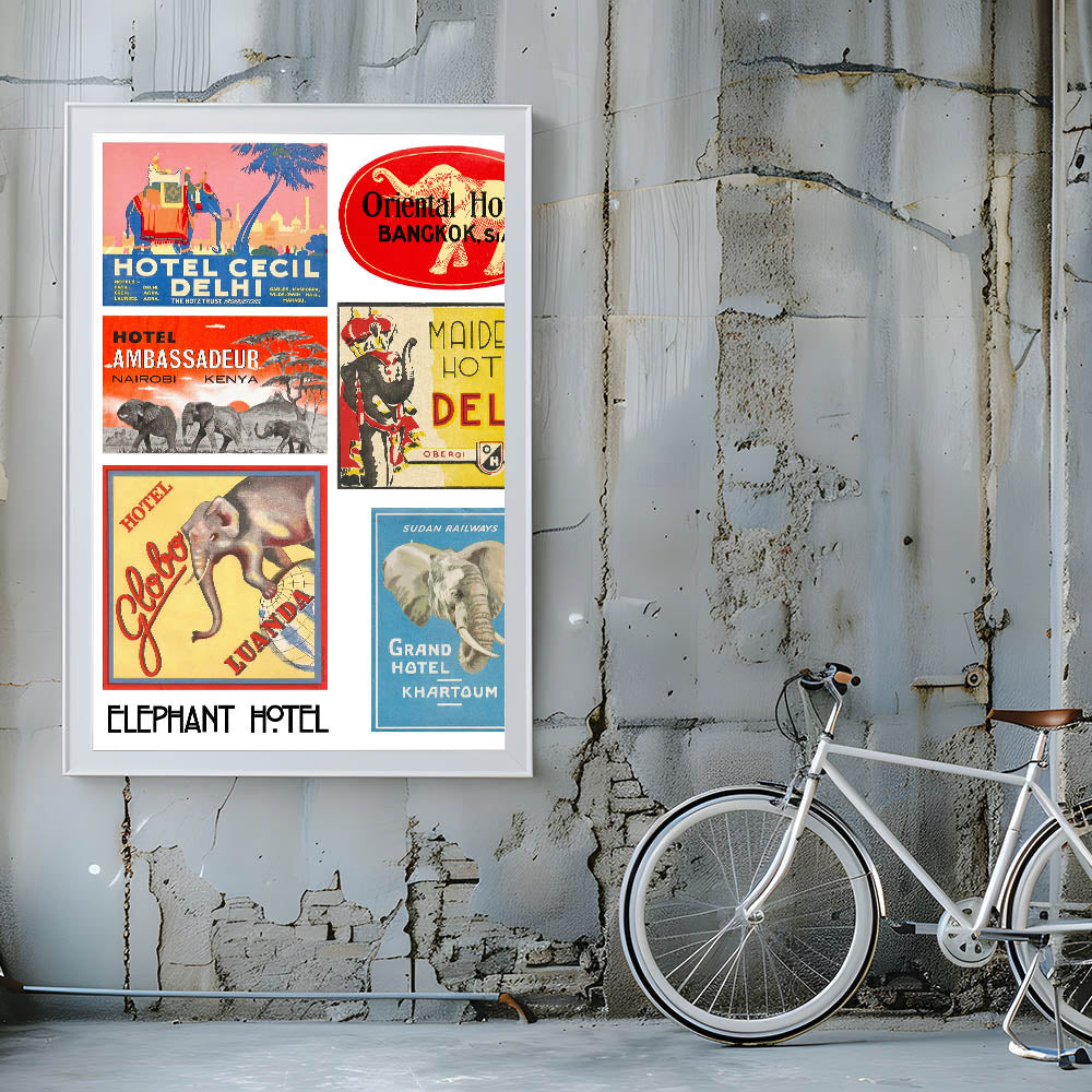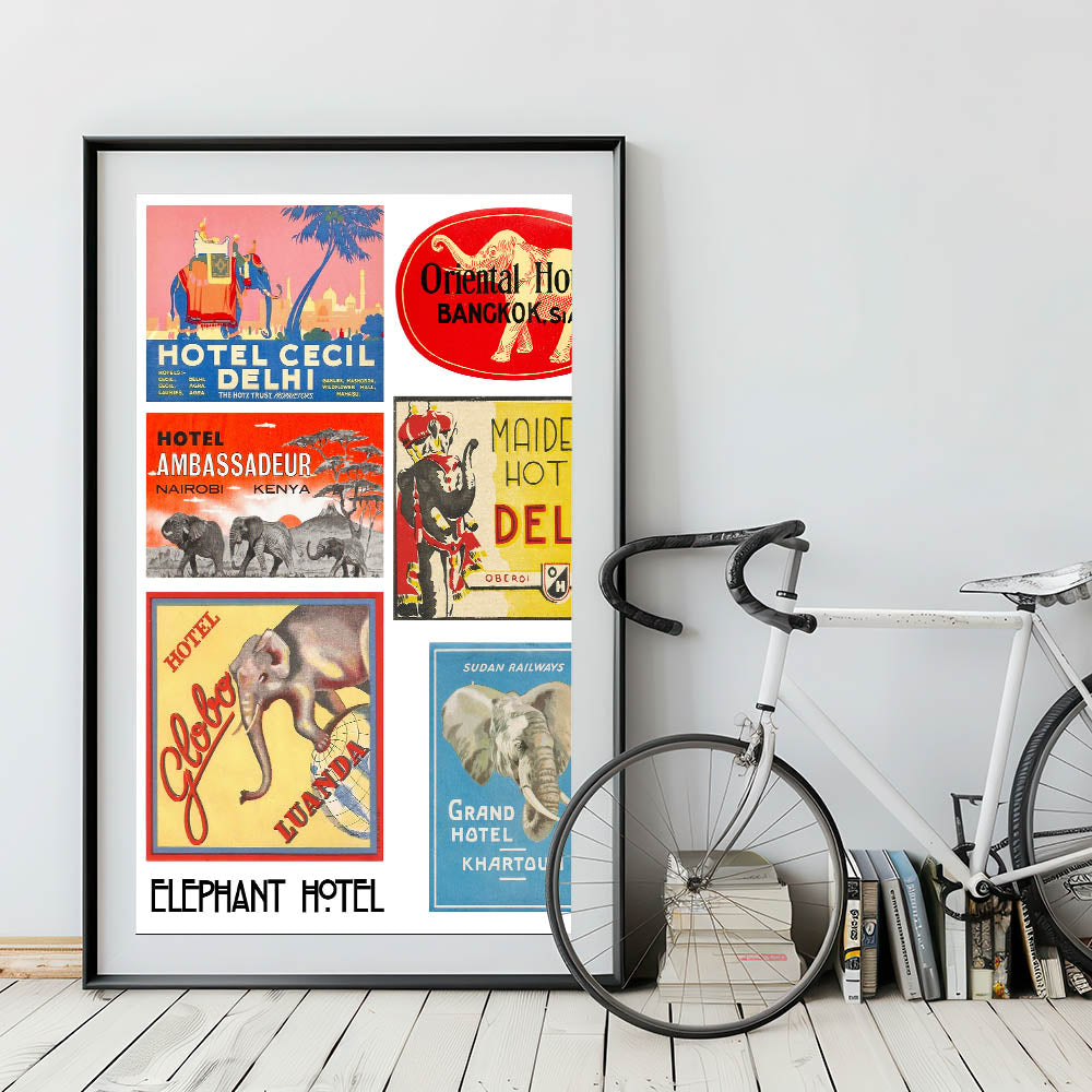- A beautiful collection of vintage hotel posters featuring the elephant as a central theme.