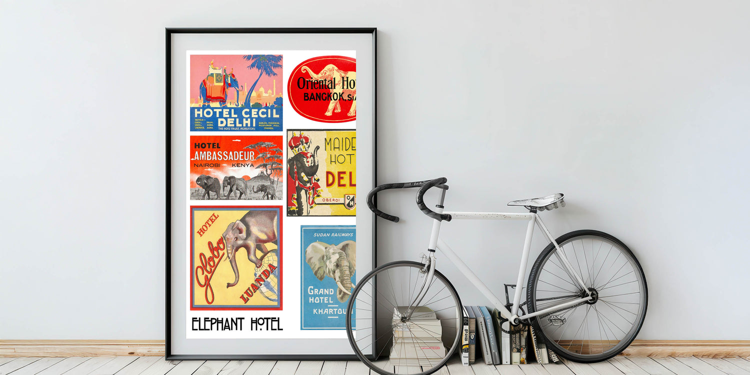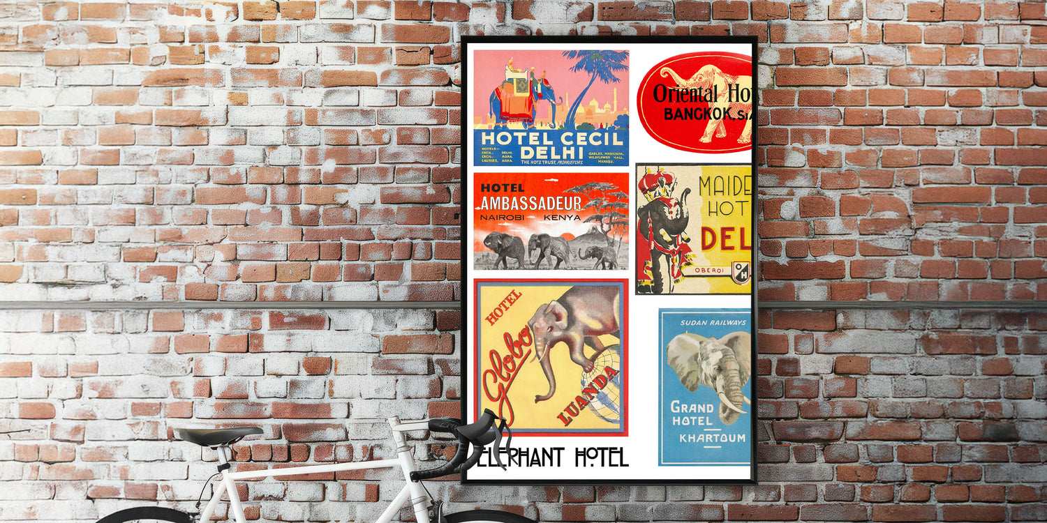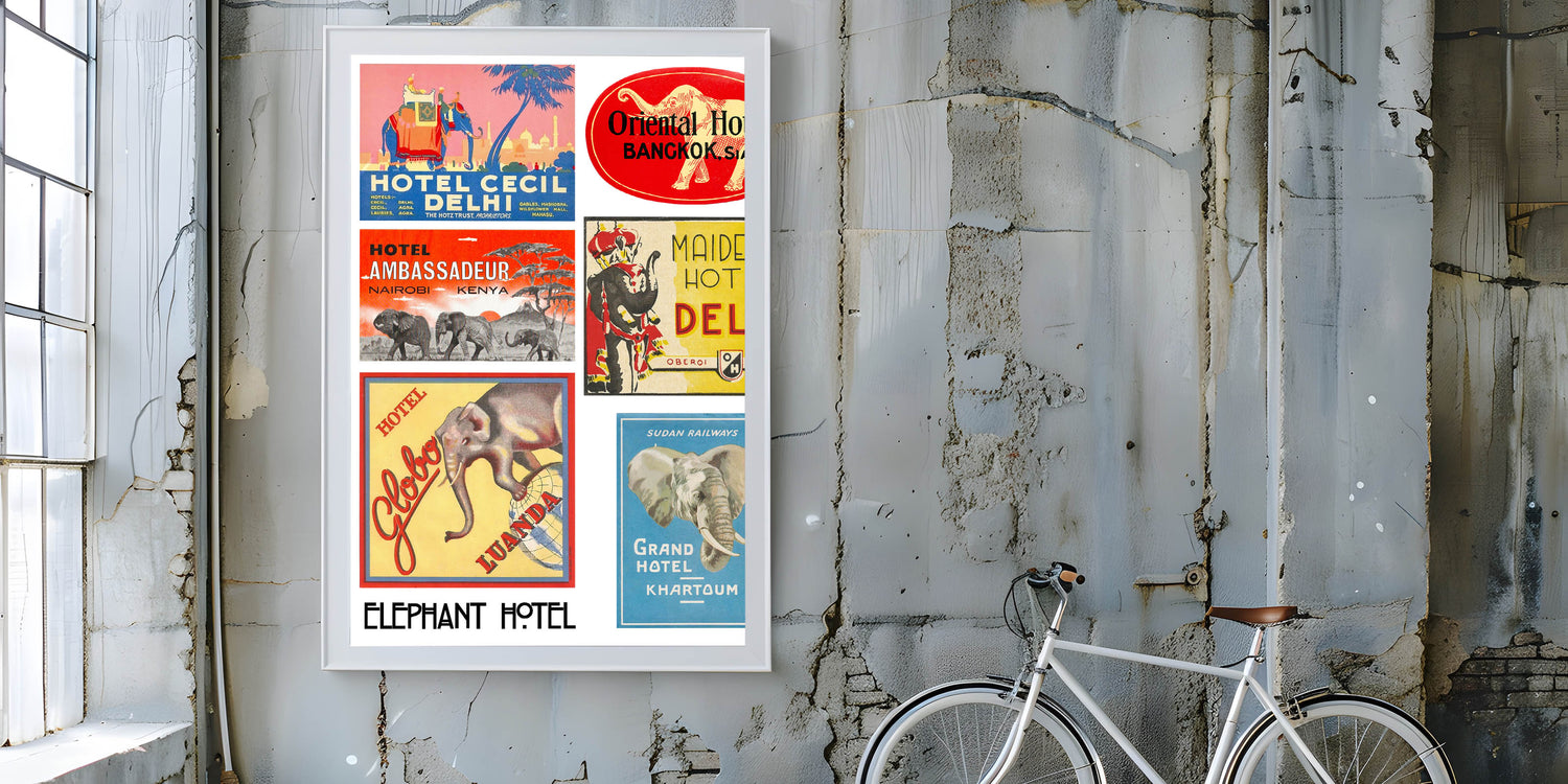 - A beautiful collection of vintage hotel posters featuring the elephant as a central theme.
