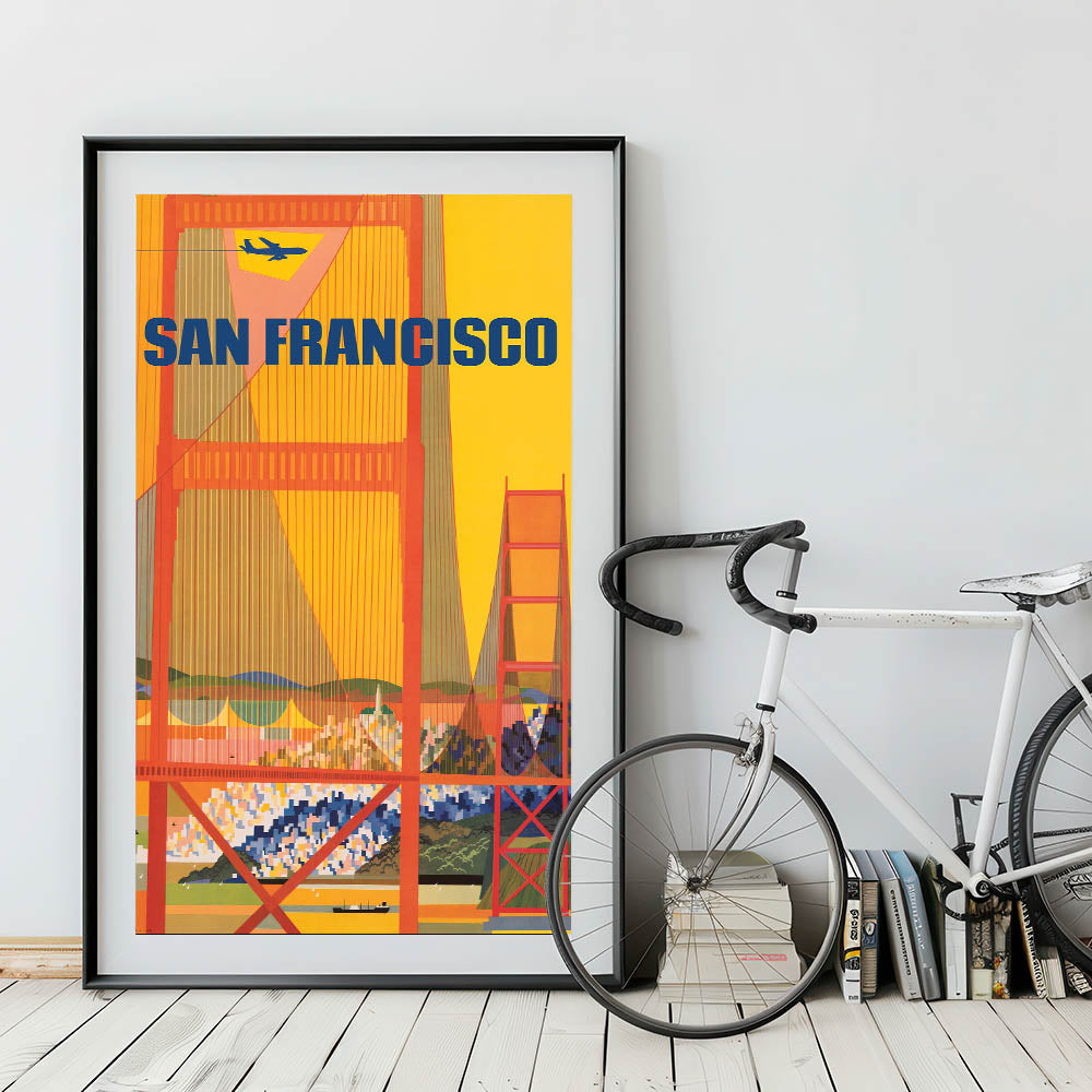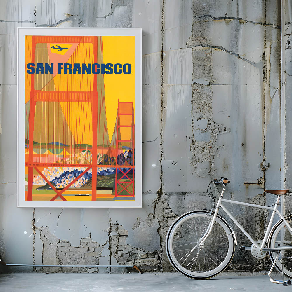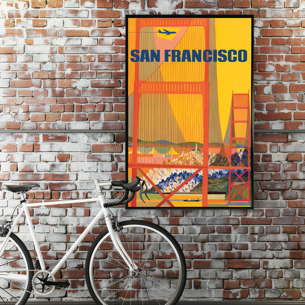 Transform your space with the bold tones and detailed design of this nostalgic travel print. Its lively colors and iconic imagery make it a captivating focal point. Order now to bring the essence of San Francisco into your home!