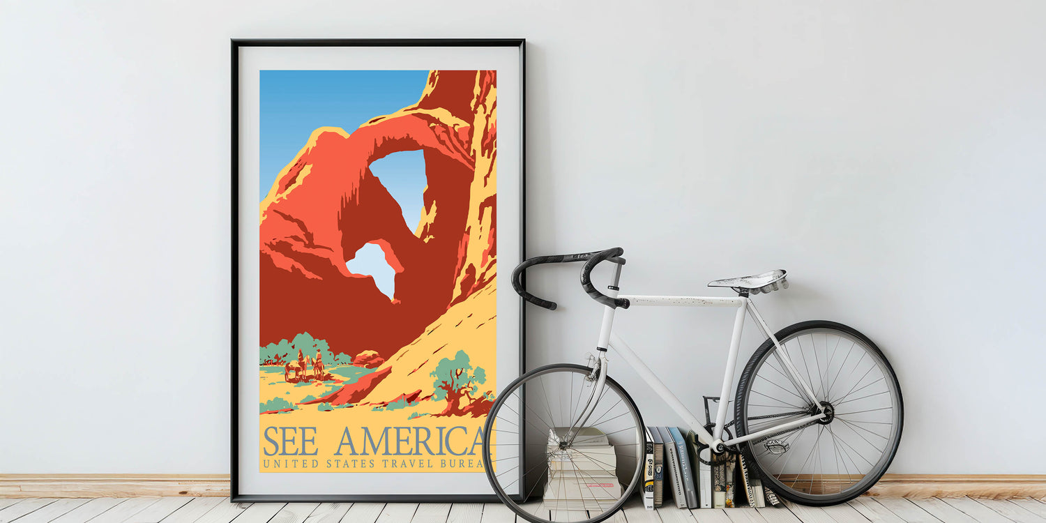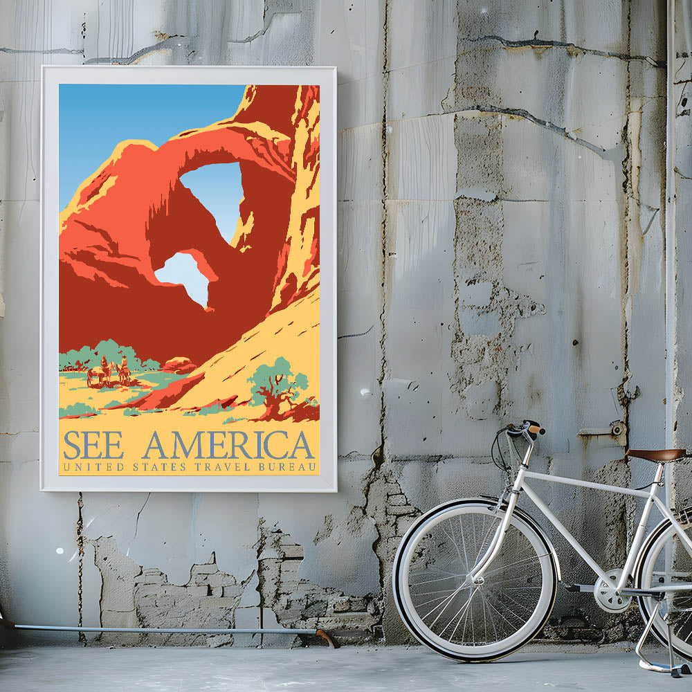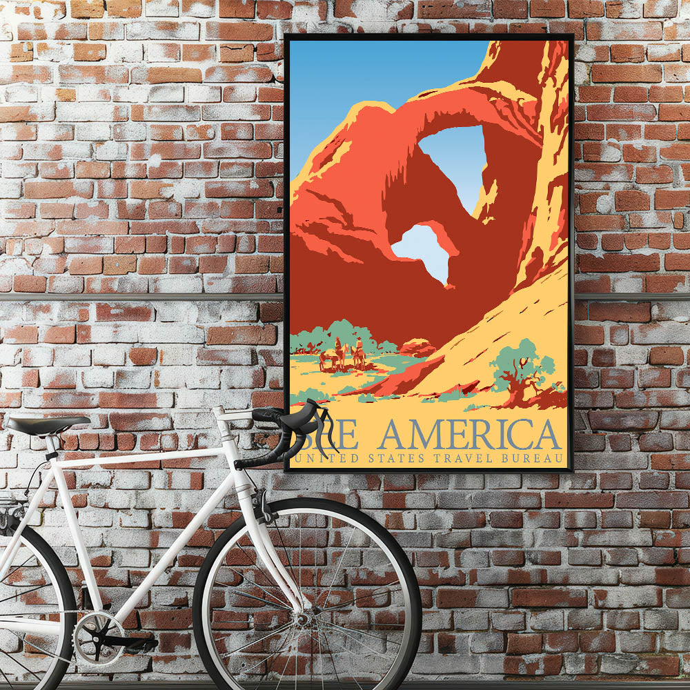 Celebrate the beauty of America's landscapes with this Vintage Travel Poster featuring a stunning desert arch and vibrant hues. The bold, flat colors of red, yellow, and blue capture the essence of the American Southwest, evoking a sense of adventure and wanderlust. The classic typography and simple yet impactful design make this artwork a perfect choice for those who appreciate both vintage travel decor and the natural beauty of America's national parks.