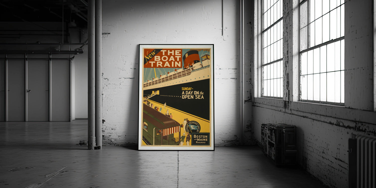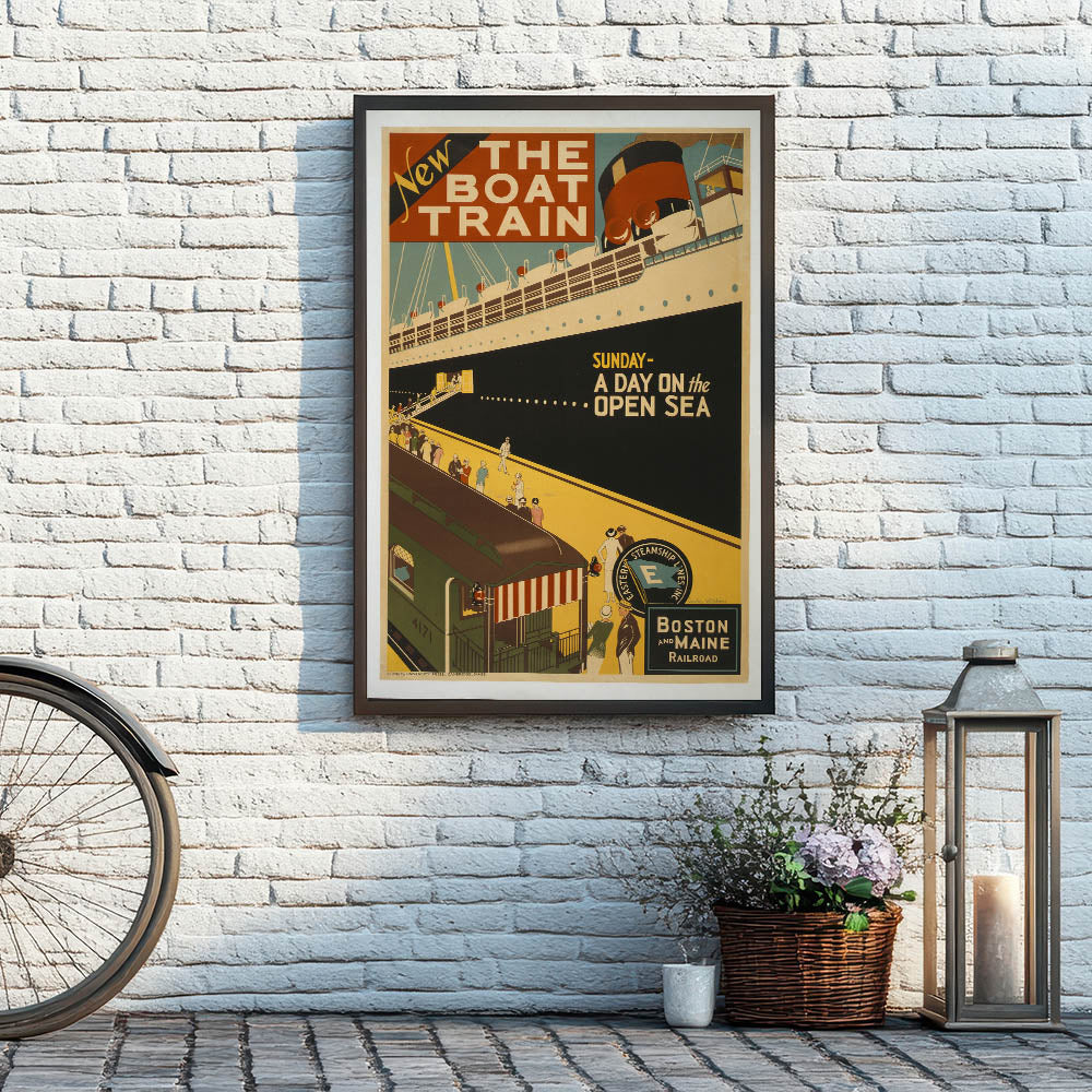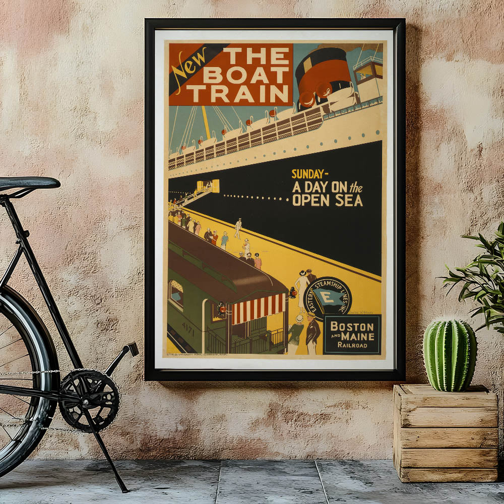Transform your space with this nostalgic travel print, celebrating the history and charm of maritime and rail adventures. Perfect for those who appreciate classic travel decor and heritage travel illustrations.