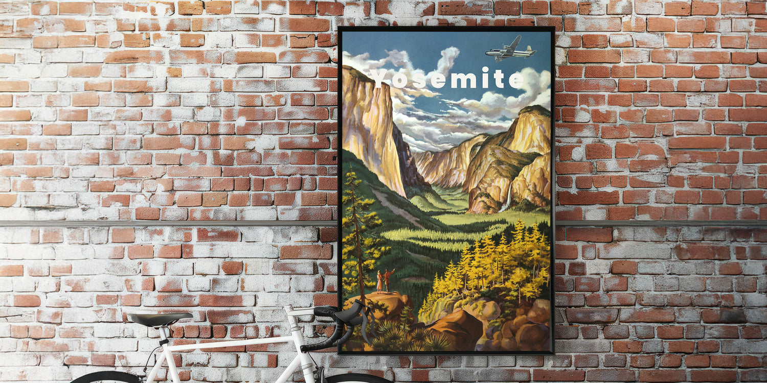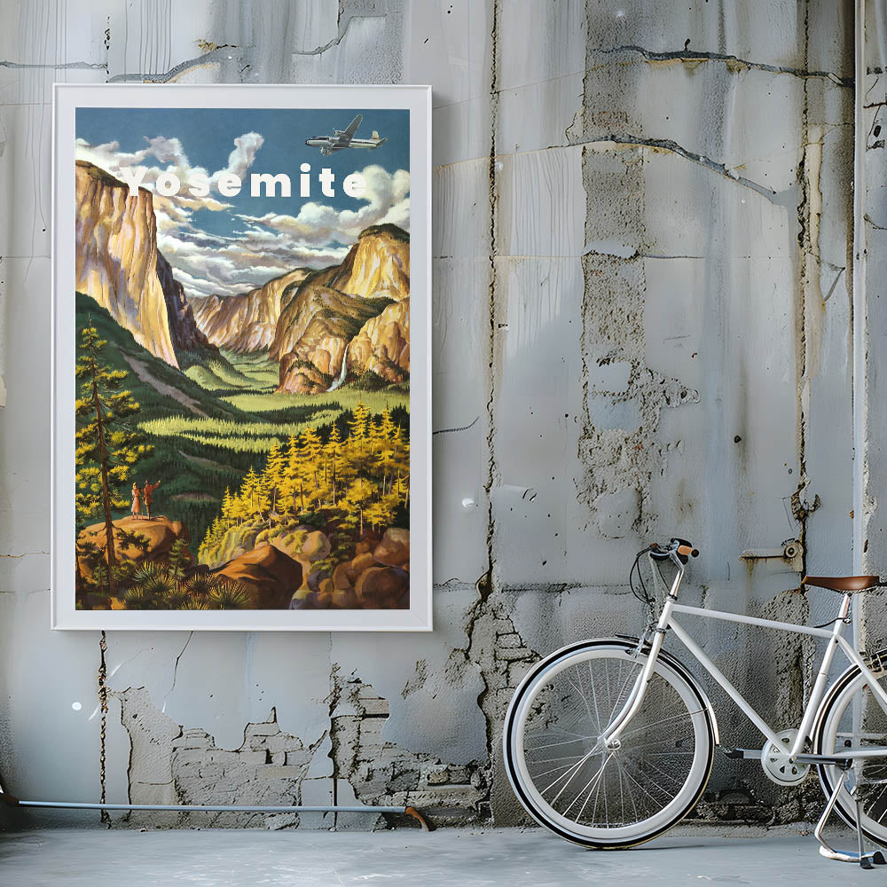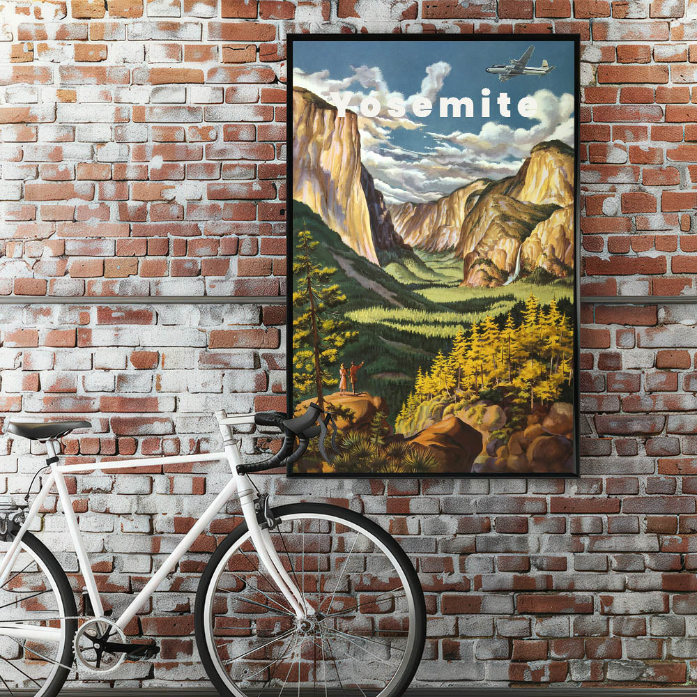 Immerse yourself in the natural beauty of Yosemite with this Vintage Travel Poster. Featuring a breathtaking view of the iconic Yosemite Valley, this artwork captures the grandeur of towering cliffs, lush greenery, and the gentle flow of waterfalls. The soft yellows, greens, and warm earth tones bring the scene to life, creating a nostalgic and peaceful vibe. The vintage design, with a couple admiring the landscape, evokes the spirit of adventure and exploration, making it the perfect addition to any home or office.
