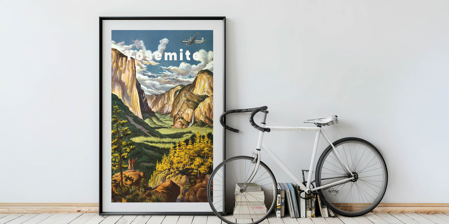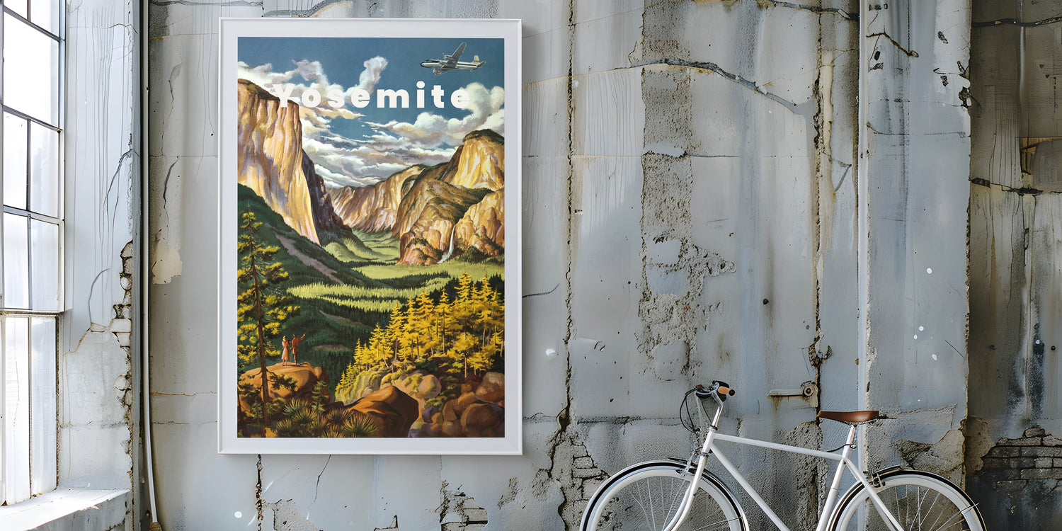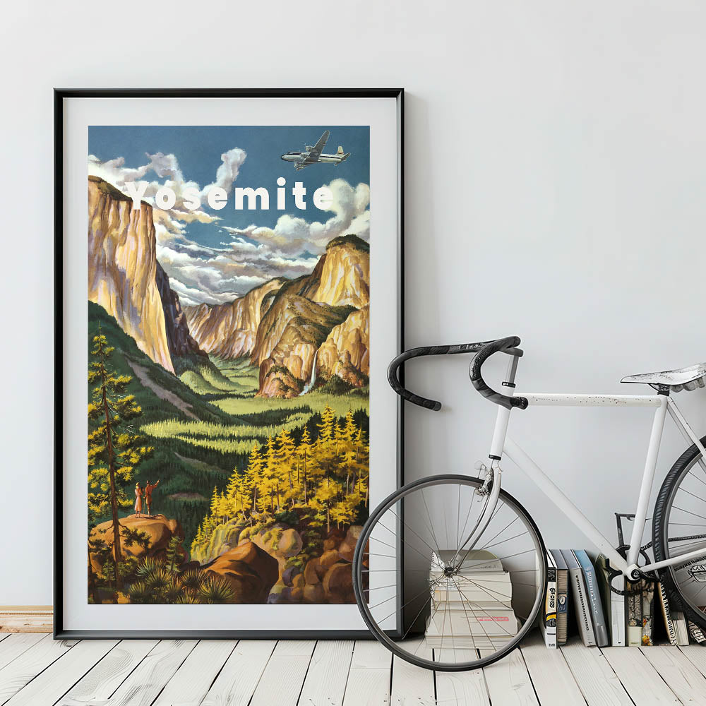 Immerse yourself in the natural beauty of Yosemite with this Vintage Travel Poster. Featuring a breathtaking view of the iconic Yosemite Valley, this artwork captures the grandeur of towering cliffs, lush greenery, and the gentle flow of waterfalls. The soft yellows, greens, and warm earth tones bring the scene to life, creating a nostalgic and peaceful vibe. The vintage design, with a couple admiring the landscape, evokes the spirit of adventure and exploration, making it the perfect addition to any home or office.