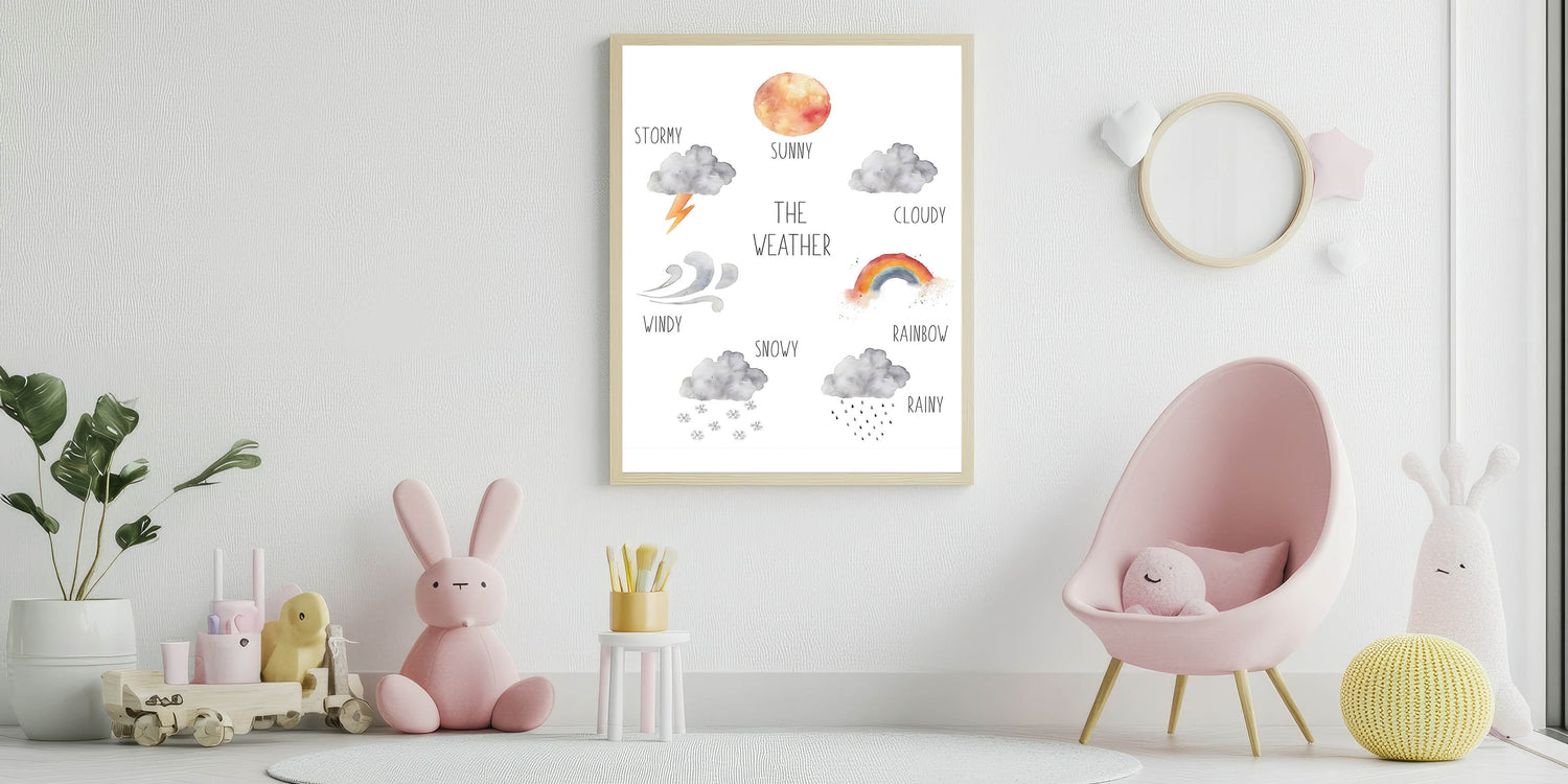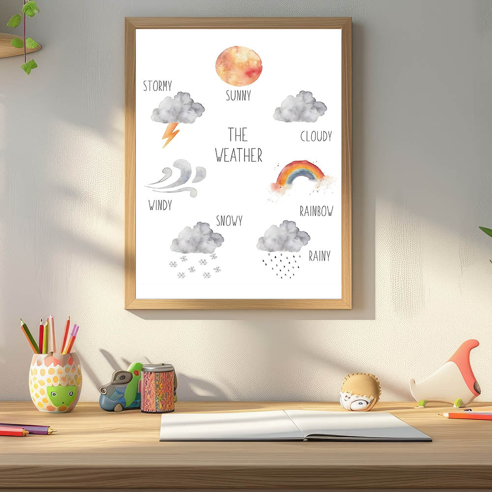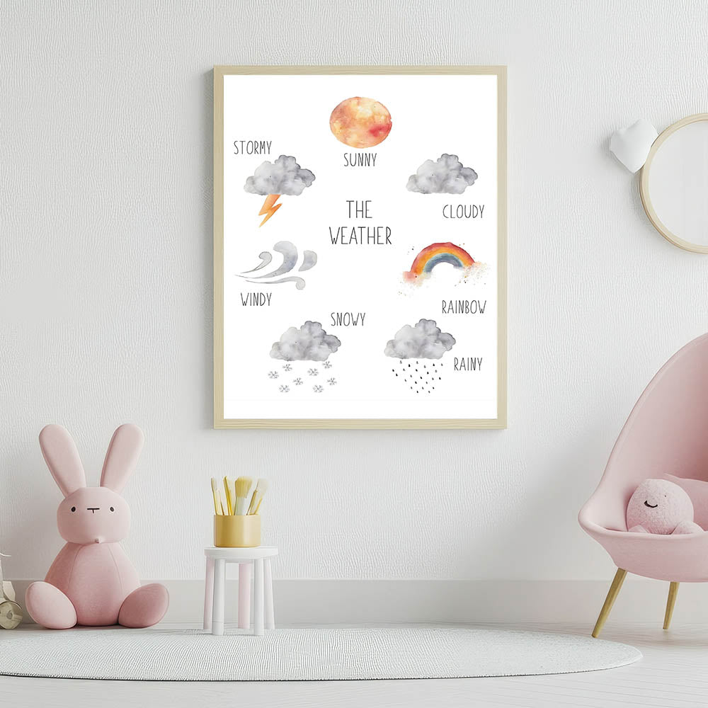 Help children explore different weather conditions with this Weather Kids Educational Wall Art. Featuring beautifully illustrated depictions of sunny, stormy, cloudy, windy, snowy, rainy, and rainbow weather, this engaging poster is perfect for kids' rooms, nurseries, and classrooms. It encourages early learning by helping children identify different types of weather in a fun and interactive way.