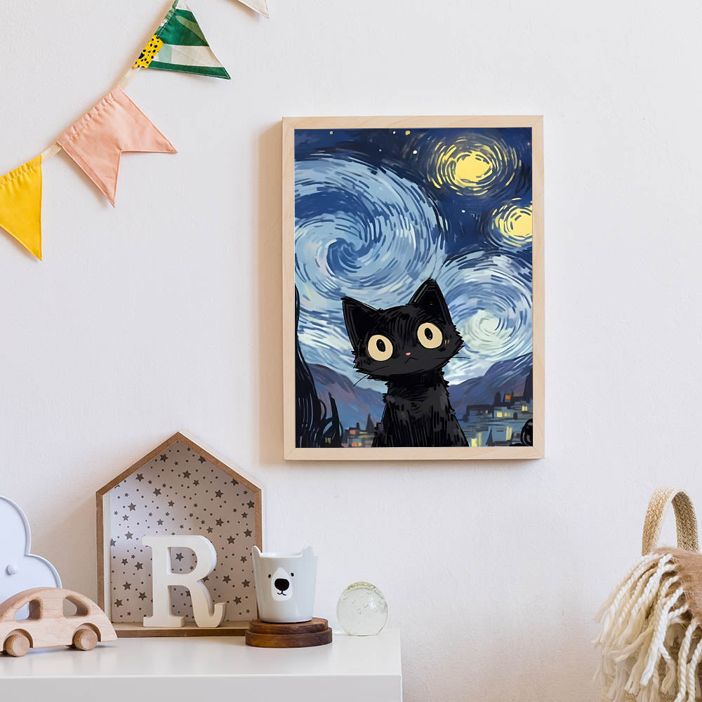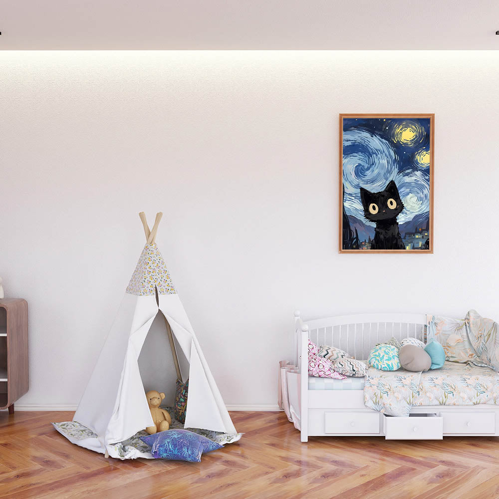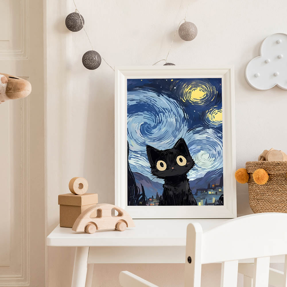 Bring a playful touch to your child’s room with this whimsical boys room wall art featuring an adorable cat in a starry night-inspired scene. This charming design is perfect for creating a cozy and imaginative atmosphere in your child's space, whether it's their bedroom, playroom, or nursery.