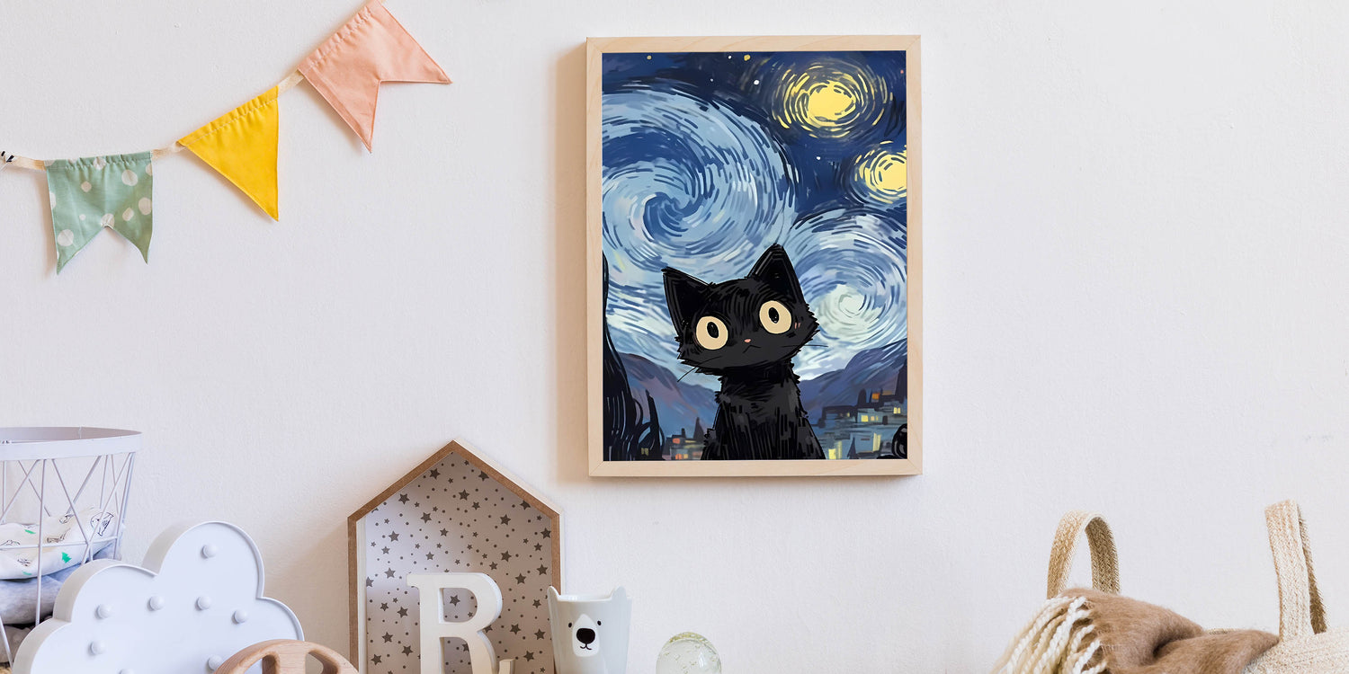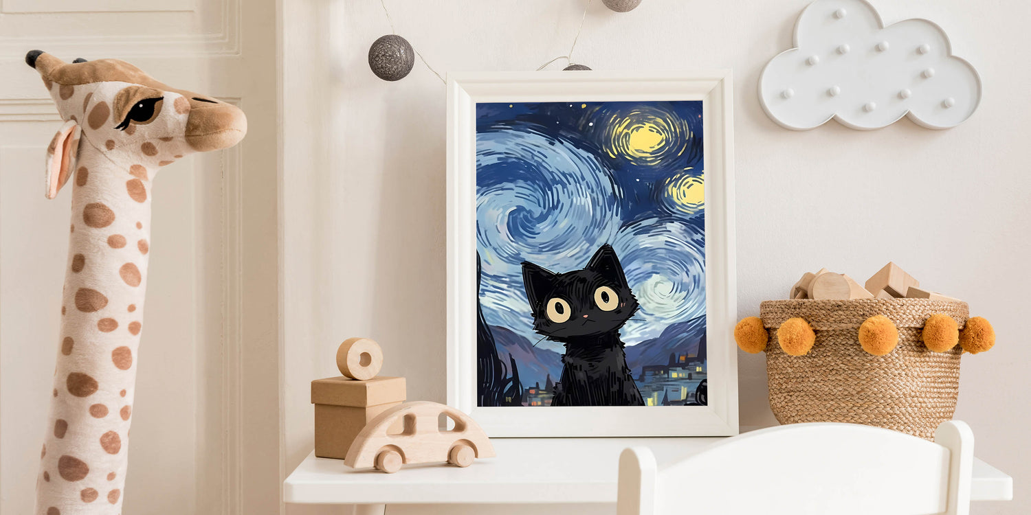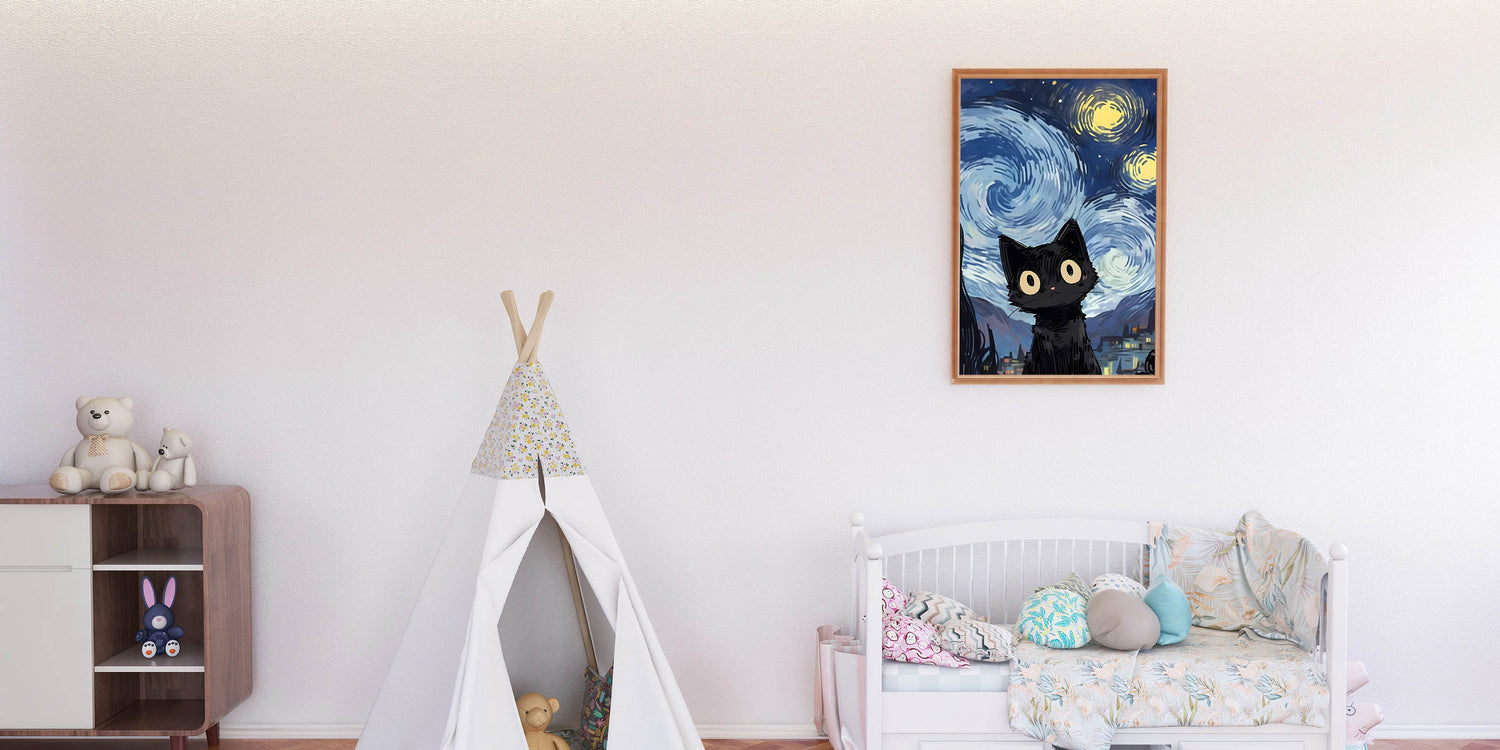 Bring a playful touch to your child’s room with this whimsical boys room wall art featuring an adorable cat in a starry night-inspired scene. This charming design is perfect for creating a cozy and imaginative atmosphere in your child's space, whether it's their bedroom, playroom, or nursery.