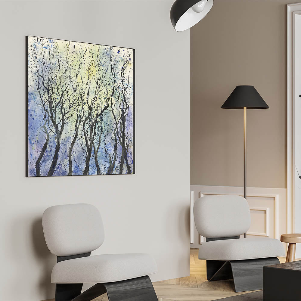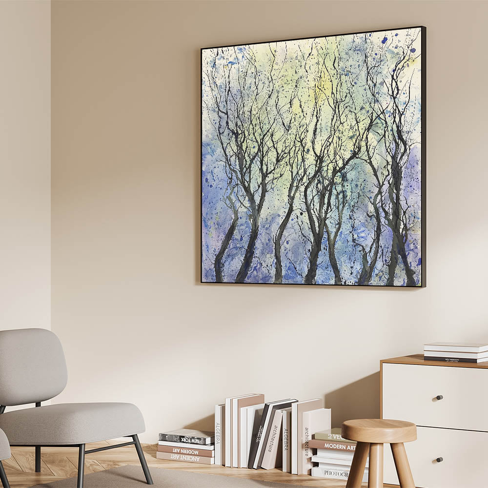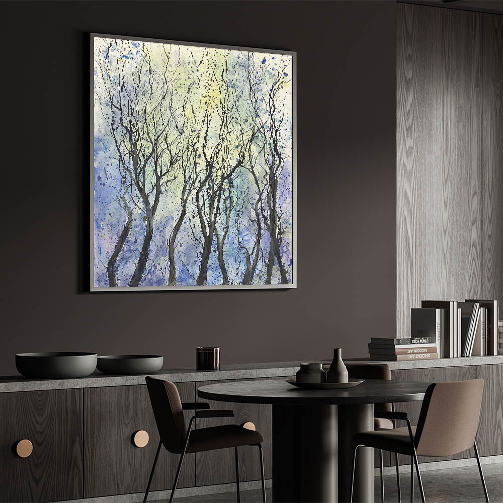 Transform your space with the ethereal beauty of this abstract floral artwork, showcasing a grove of whimsical trees against a serene backdrop. The black, flowing branches create an intricate pattern, framed by soft shades of blue, yellow, and hints of white. This piece exudes a sense of tranquility and elegance, making it an excellent addition to any contemporary or minimalist interior.