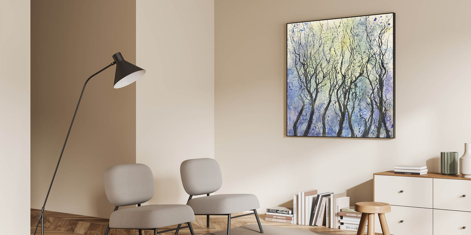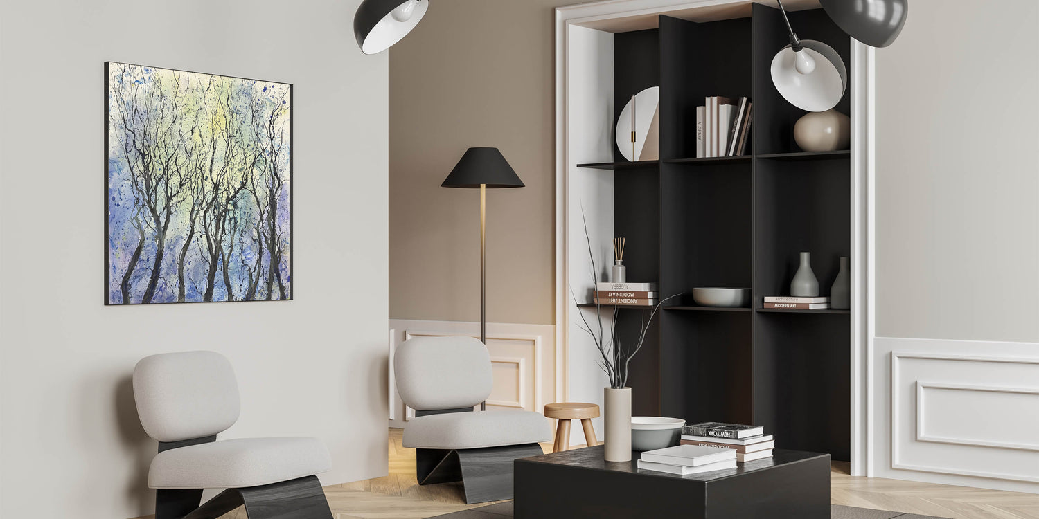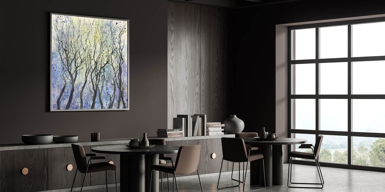 Transform your space with the ethereal beauty of this abstract floral artwork, showcasing a grove of whimsical trees against a serene backdrop. The black, flowing branches create an intricate pattern, framed by soft shades of blue, yellow, and hints of white. This piece exudes a sense of tranquility and elegance, making it an excellent addition to any contemporary or minimalist interior.