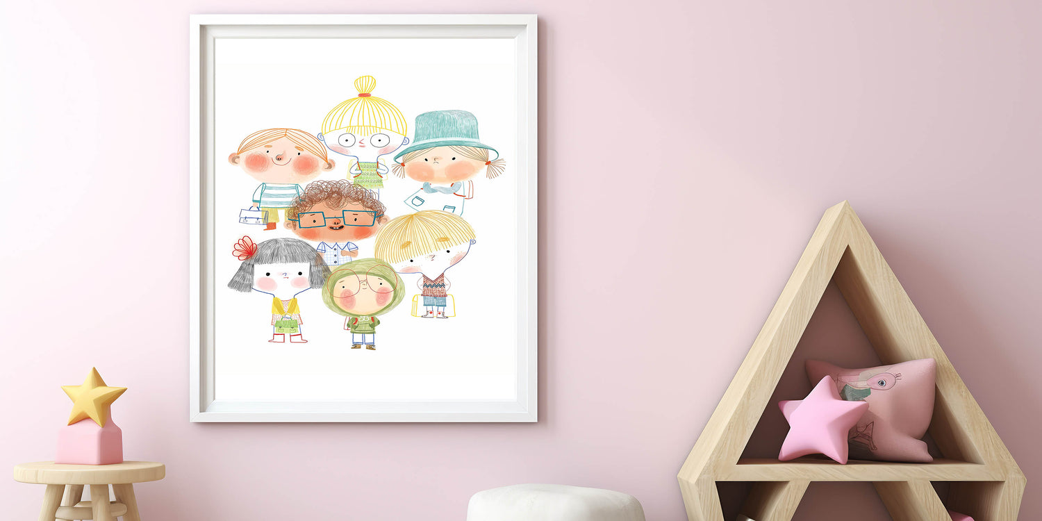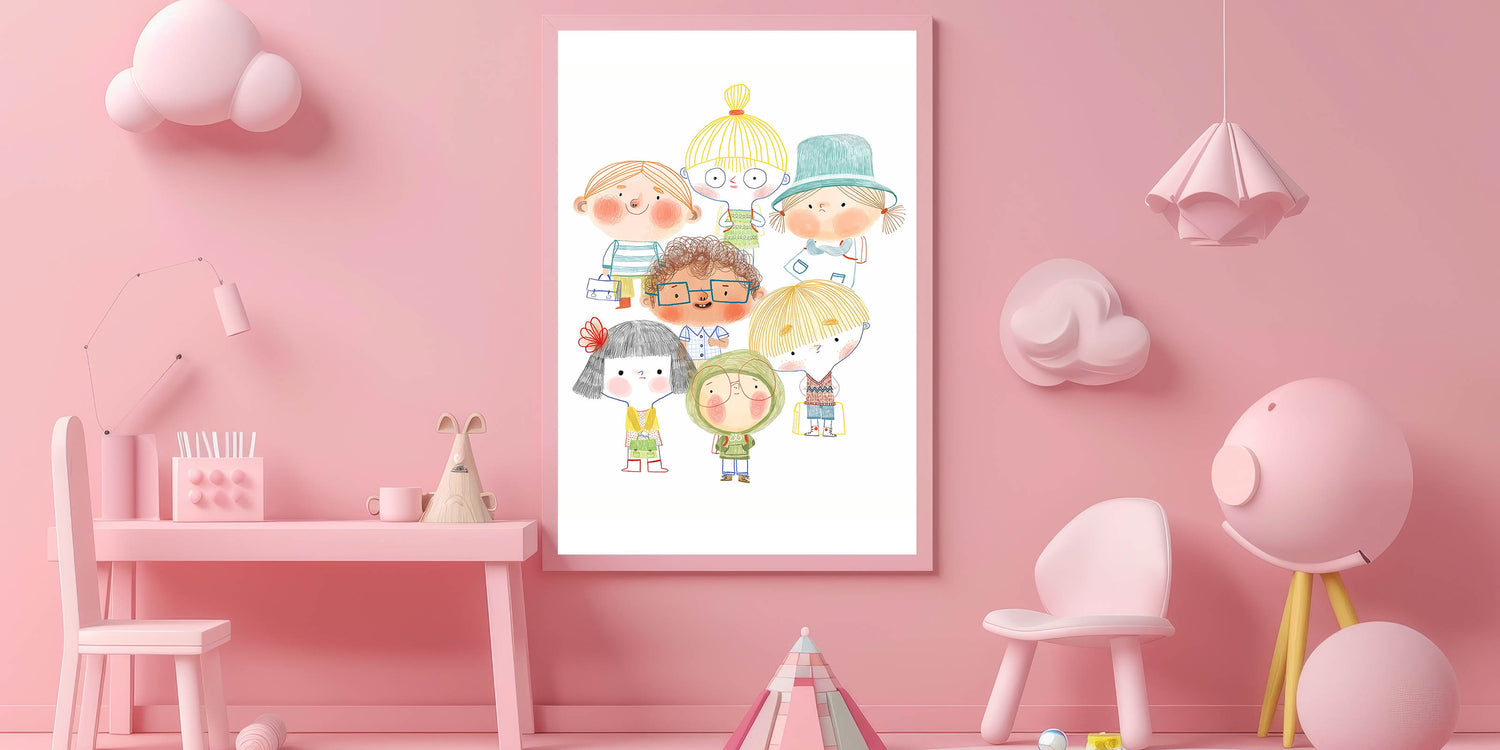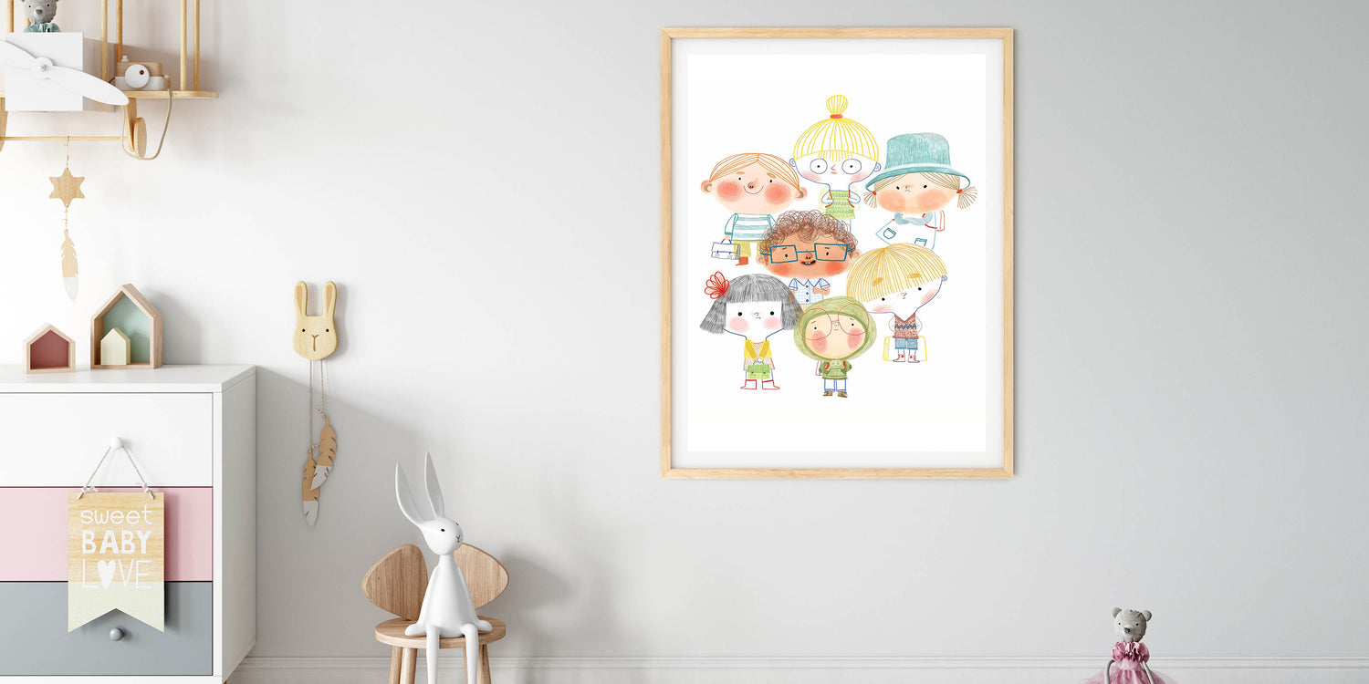 Celebrate friendship, diversity, and childhood joy with this whimsical kids group wall art, a playful and heartwarming addition to girls' bedrooms, nurseries, and playrooms. This charming illustration features a delightful group of children, each with unique outfits, hairstyles, and expressions, creating a vibrant and engaging piece of children’s wall decor. The artistic sketch-style drawing, combined with soft pastel tones, adds a sense of warmth and fun to any space.