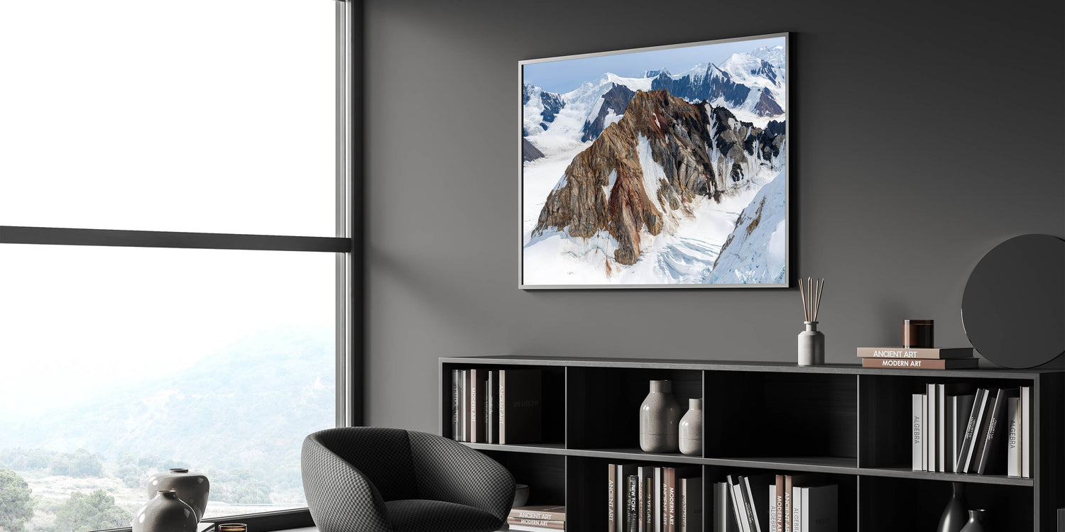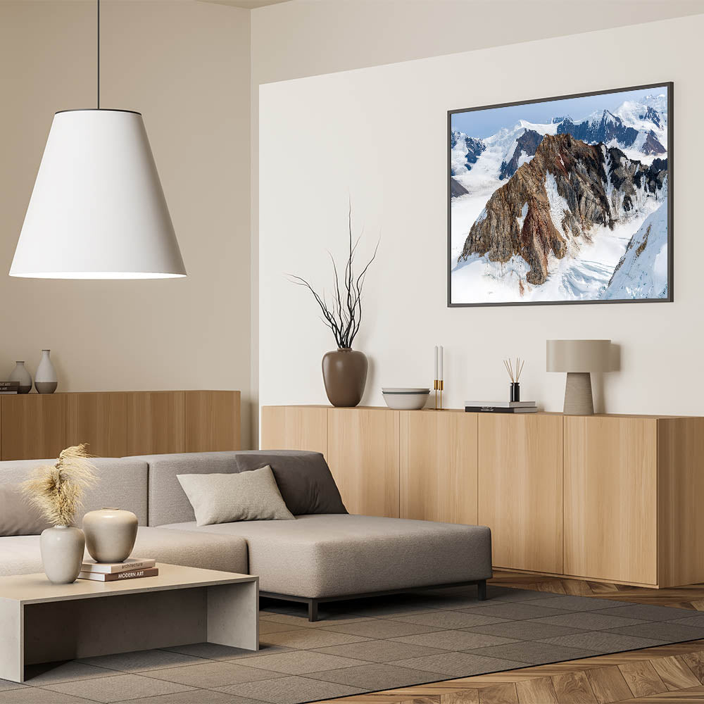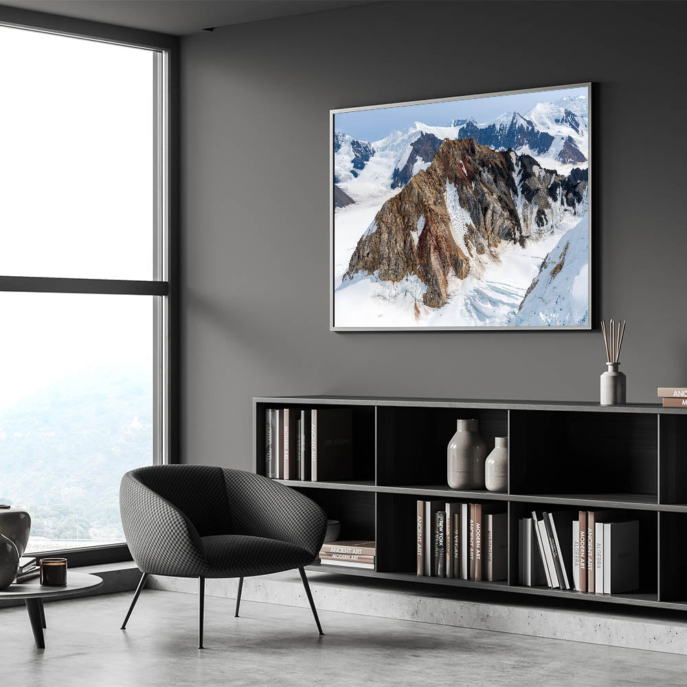 - Captivating Colors: The stark contrasts between the rugged browns of the mountain rocks and the pristine whites of the snow and ice create a dramatic visual narrative.