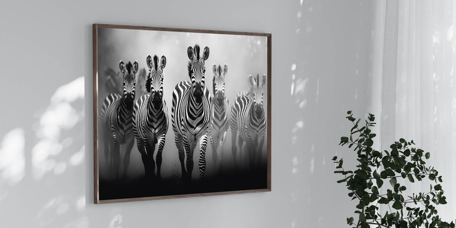 Capture the raw energy of the African savanna with this dynamic Zebra herd wall art. The powerful imagery of a zebra herd in motion, rendered in a striking black and white palette, brings both intensity and elegance to your space. This artwork is ideal for adding a sense of movement and drama to modern and contemporary interiors. Available in a variety of formats including Stretched Canvas, Framed Canvas, Acrylic Glass, Framed Acrylic Glass, Framed Print, Rolled Canvas, and Rolled Print, this piece offers both versatility and impact.