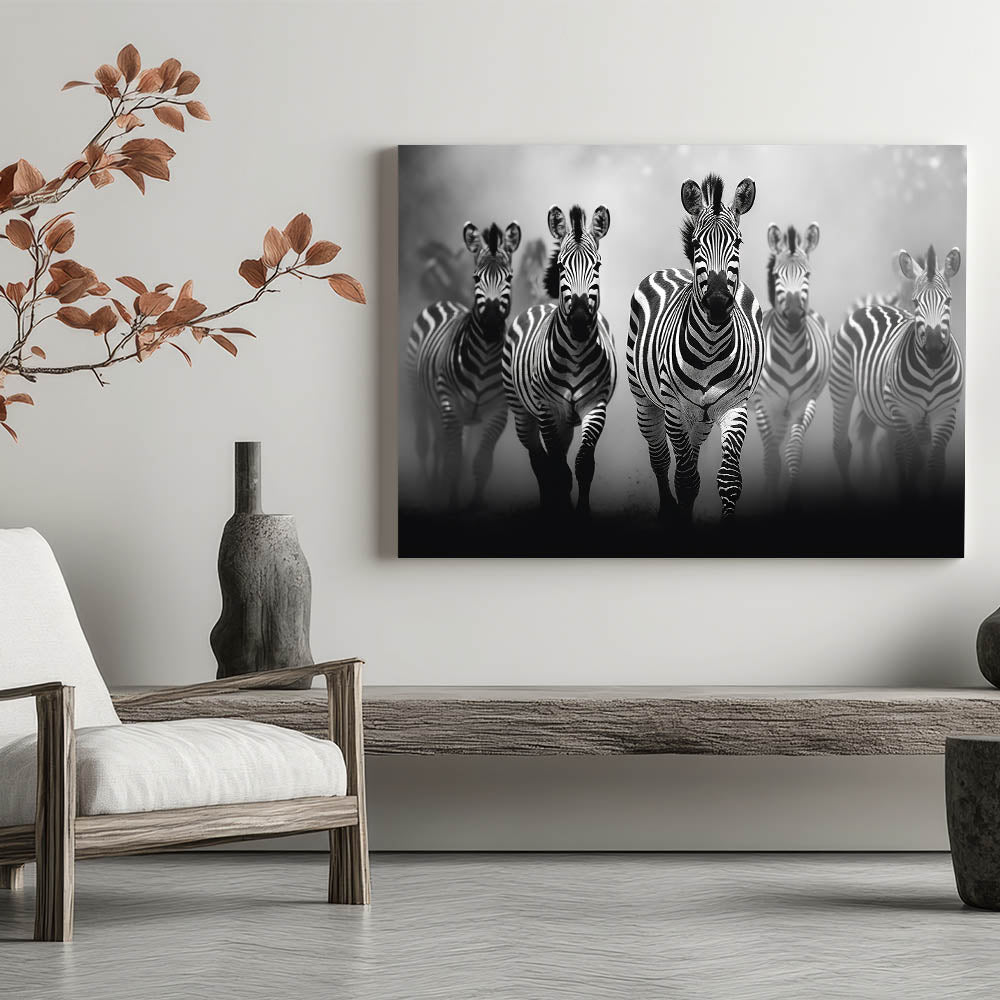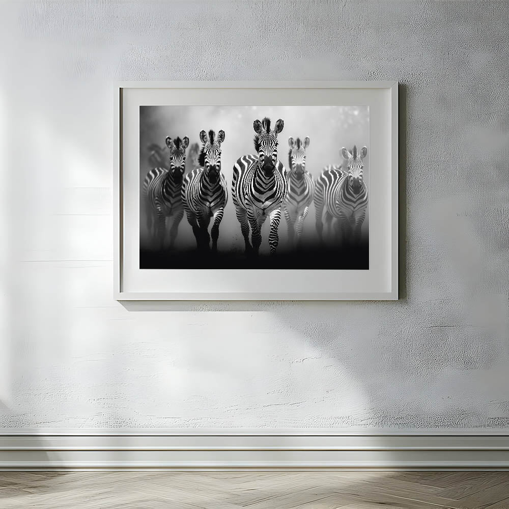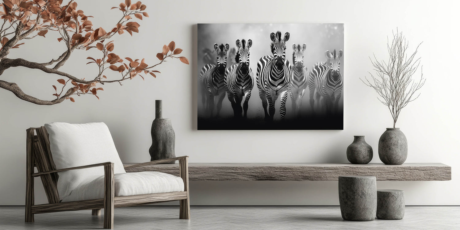 - Striking Imagery: A dynamic black and white depiction of a zebra herd in motion, perfect for modern and contemporary spaces.